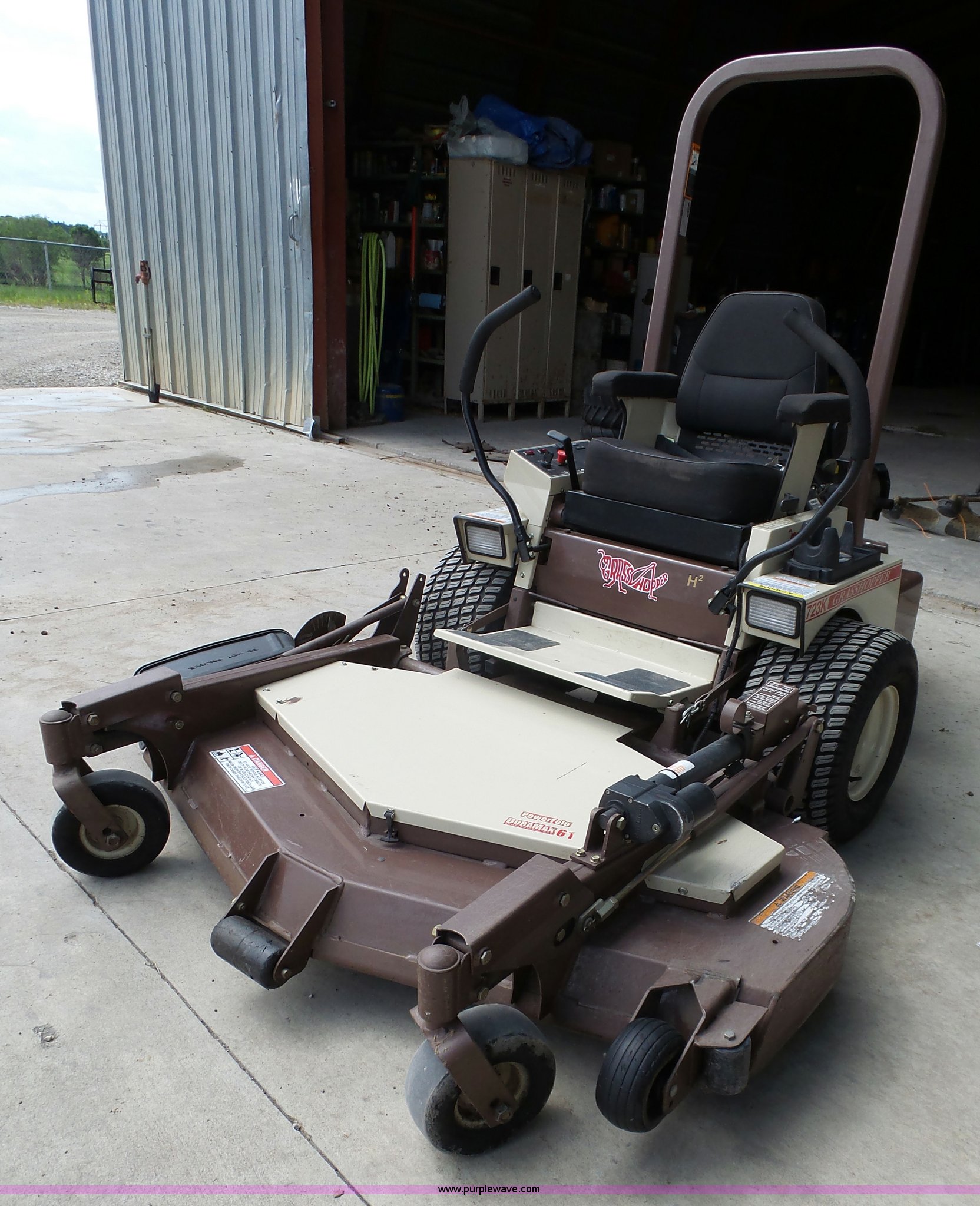 Purple Wave is selling a used Lawn Mower in Kansas. This item is a Grasshopper 723K ZTR lawn mower with the following: 867 hours on meter, 61" cut, Kohler Command Pro 23 gas engine, ROPS, Front work lights, Electric power fold deck, Height spacers, Solid front tires, 22x11.00-10 rear tires, Operator's manual, Serial 5720272