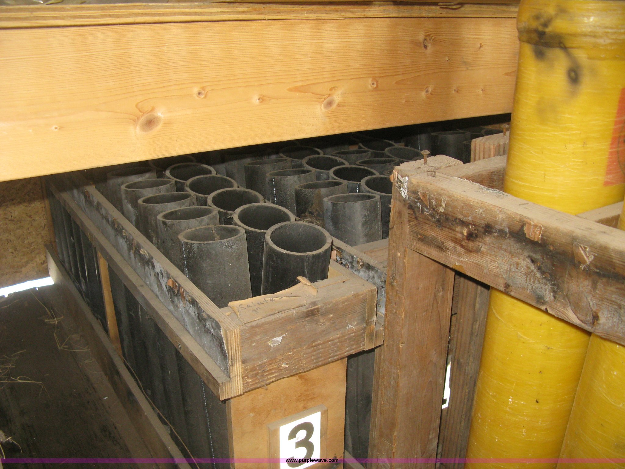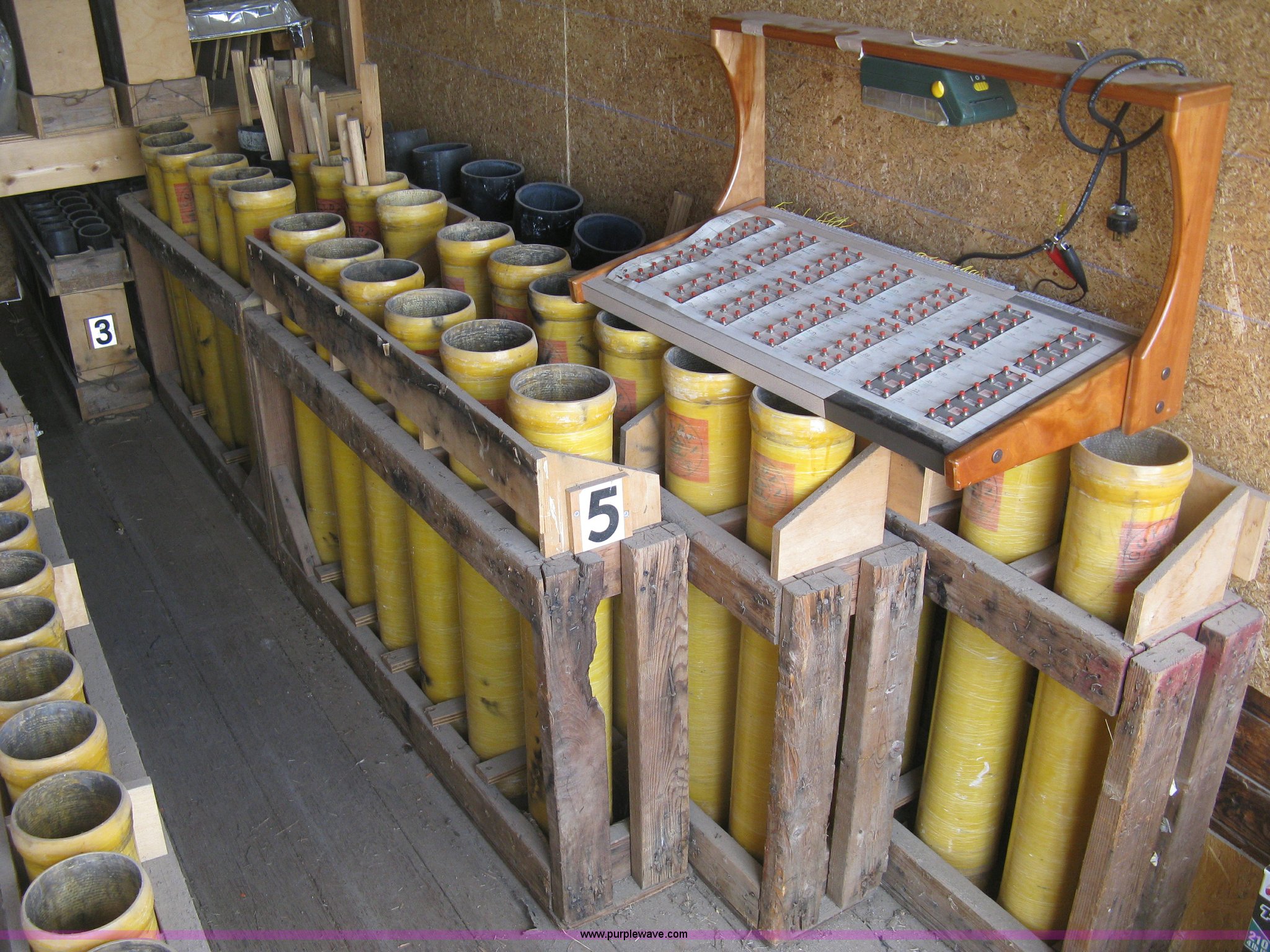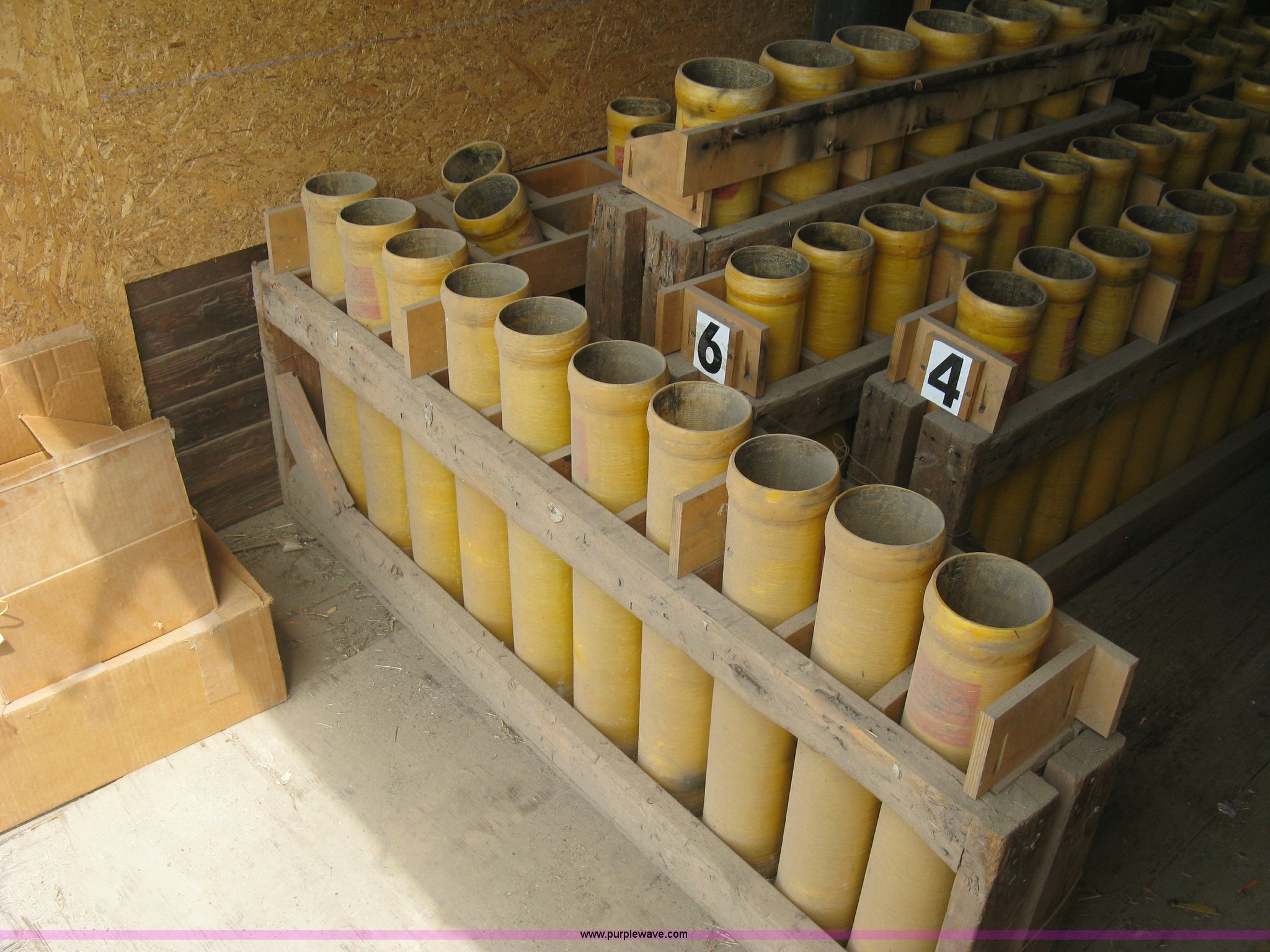 Firework deployment equipment and storage container. (90) 24"H x 4" diameter fiberglass launch tubes, (60) 32"H x 5" diameter fiberglass launch tubes, (252) 20"H x 3" diameter PVC launch tubes, Deployment control board, Wire leads, Hold down stakes, Rack, Assorted supplies, Operational when last used five years ago, Brown storage box 18.5'L x 8'W, 7.6'H interior, Wood floor Some damaged, Roll up door, Front exterior sheeting damage, Rust. City of Maize. 10100 W Grady. Maize, KS 67101