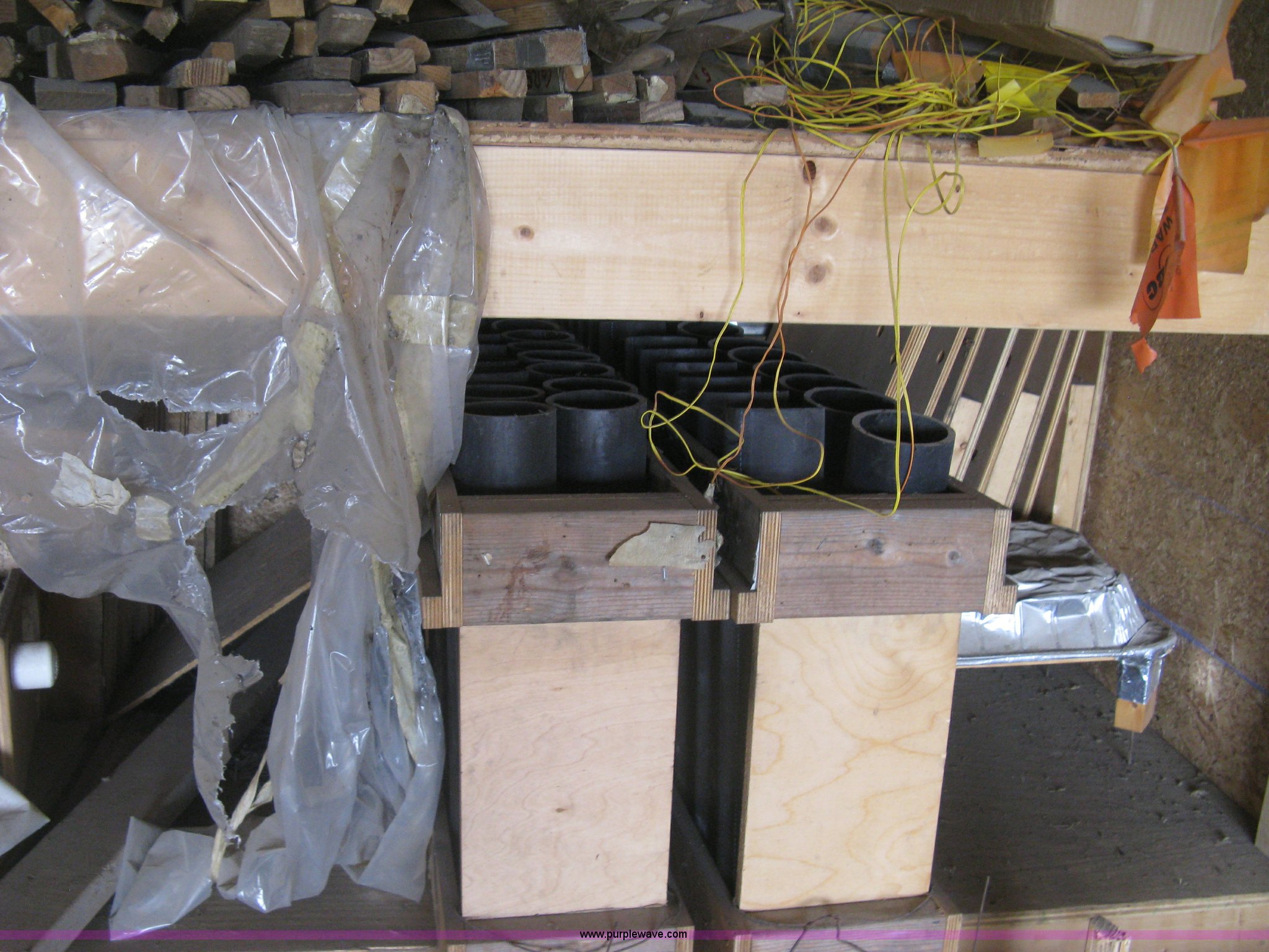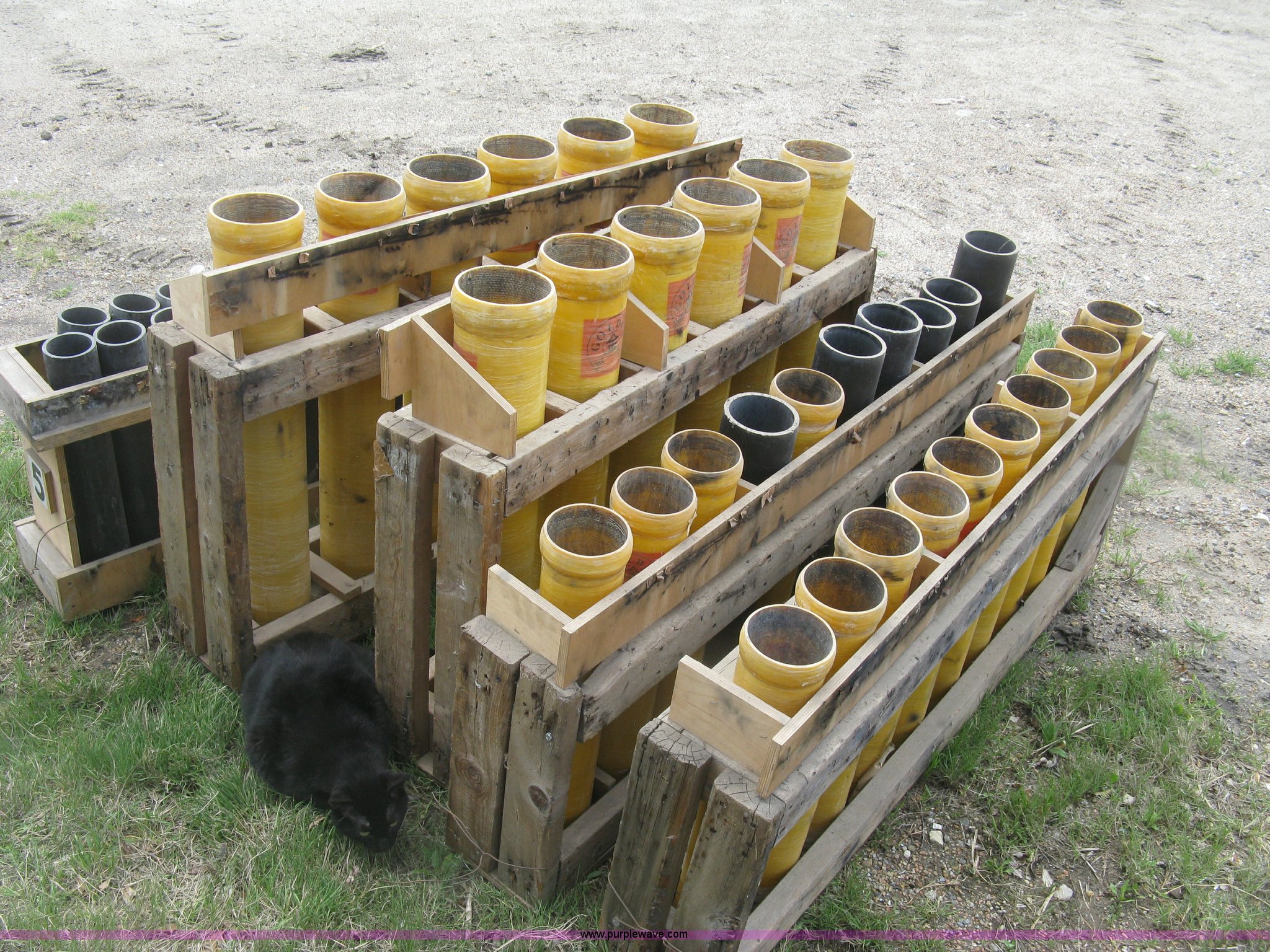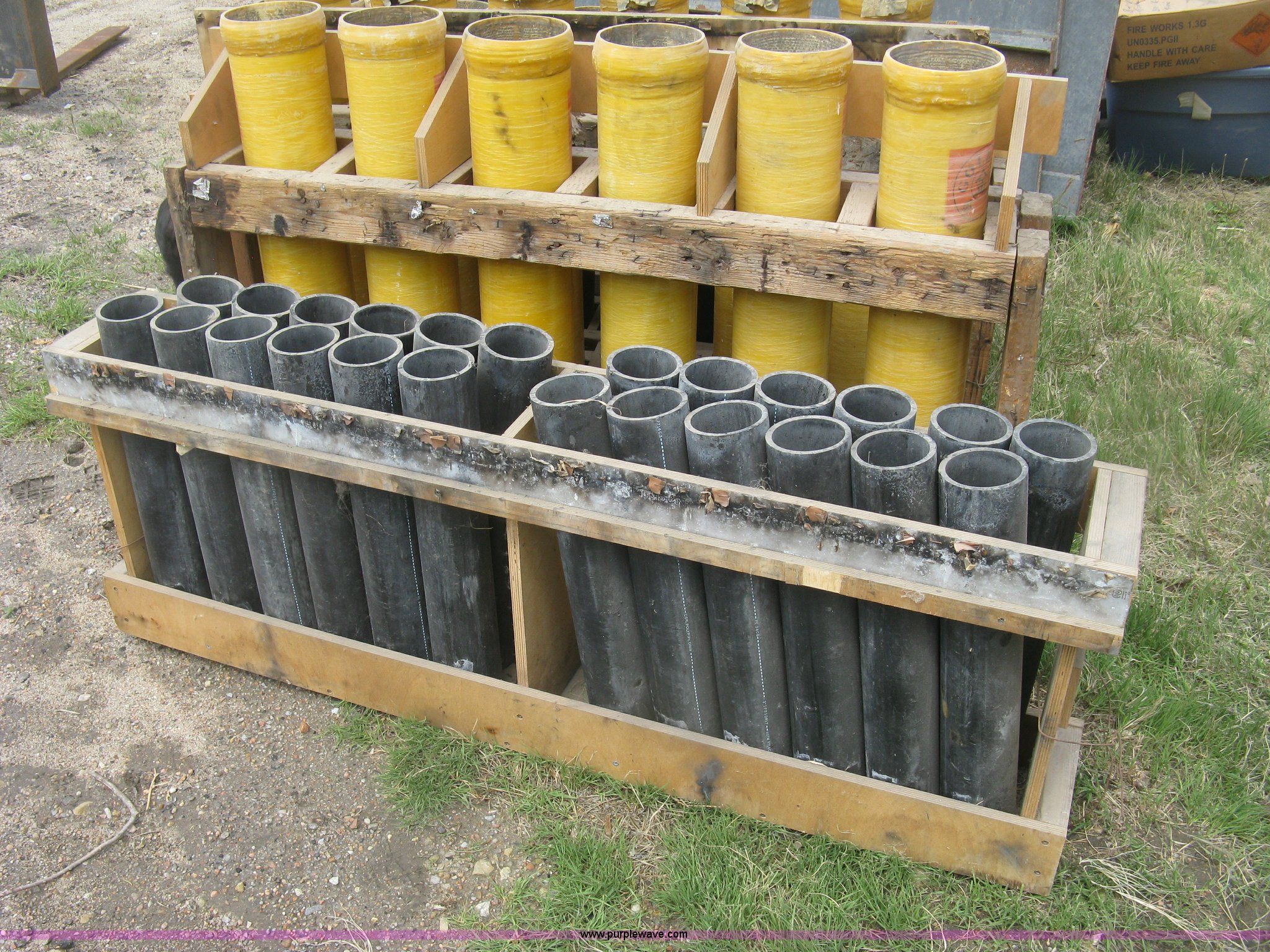 Firework deployment equipment and storage container. (90) 24"H x 4" diameter fiberglass launch tubes, (60) 32"H x 5" diameter fiberglass launch tubes, (252) 20"H x 3" diameter PVC launch tubes, Deployment control board, Wire leads, Hold down stakes, Rack, Assorted supplies, Operational when last used five years ago, Brown storage box 18.5'L x 8'W, 7.6'H interior, Wood floor Some damaged, Roll up door, Front exterior sheeting damage, Rust. City of Maize. 10100 W Grady. Maize, KS 67101