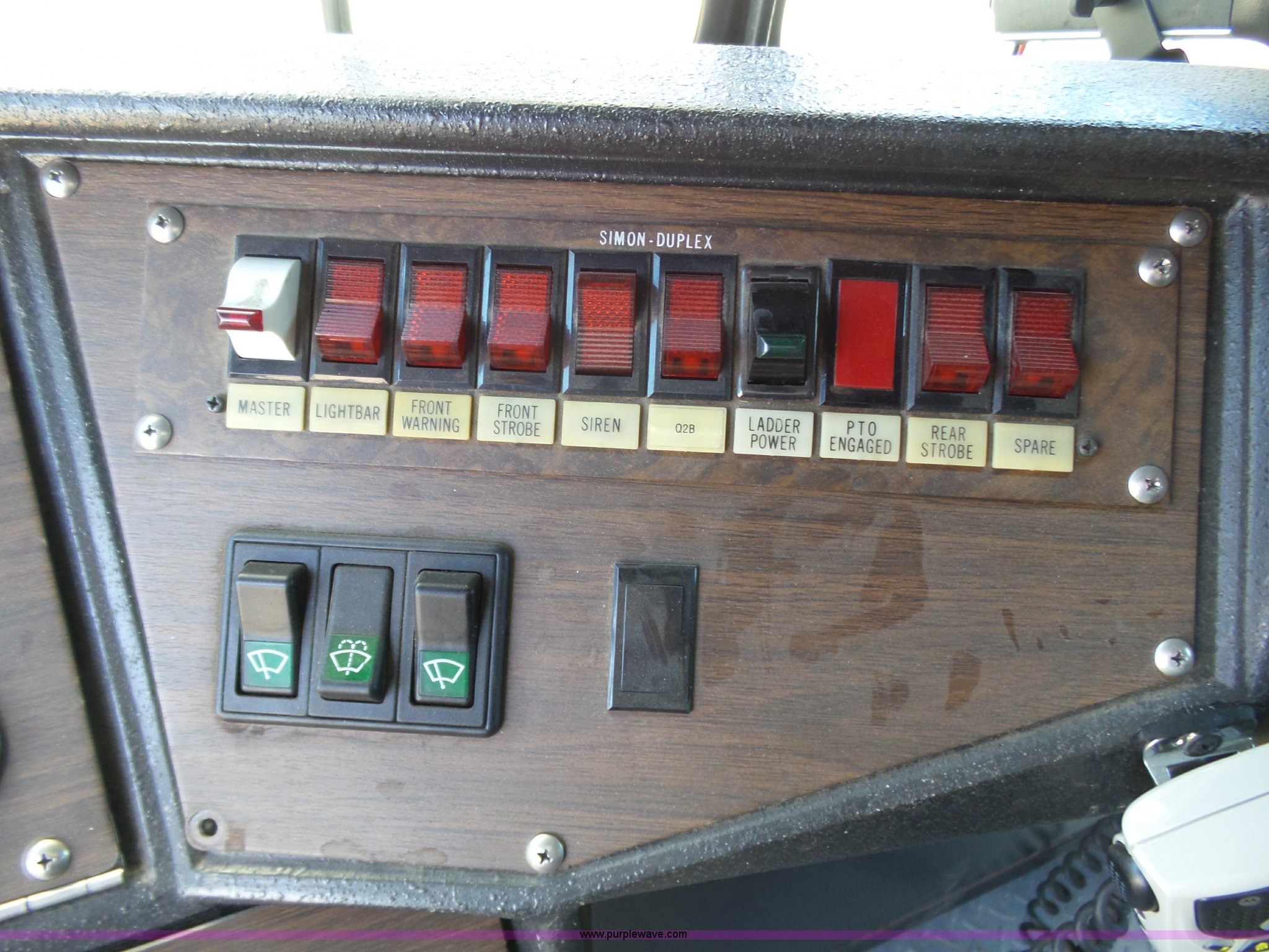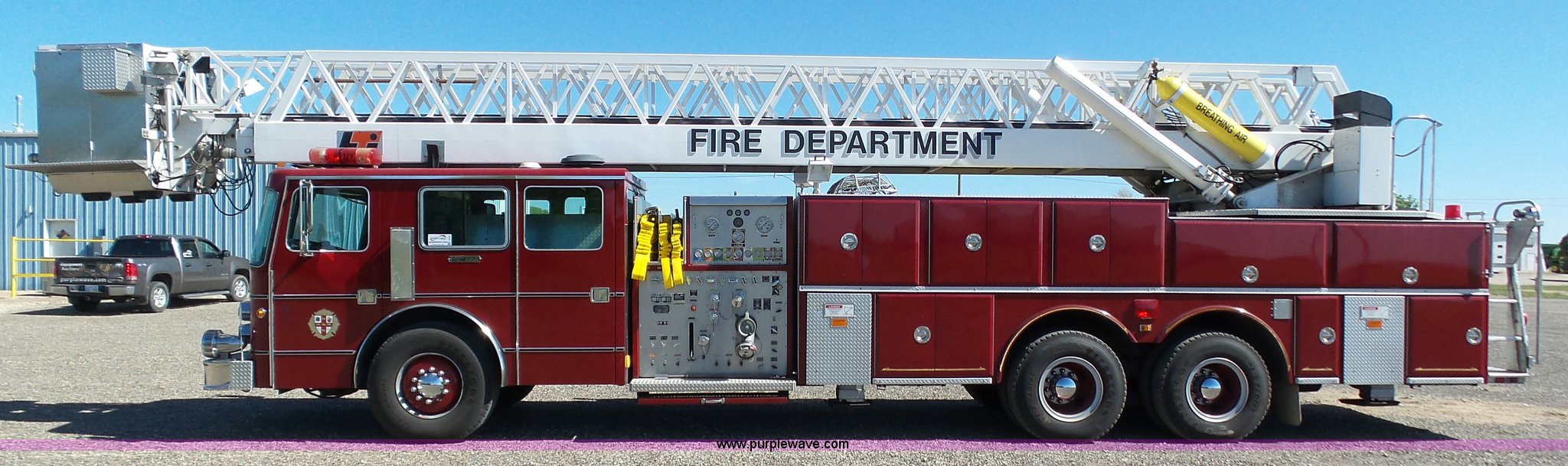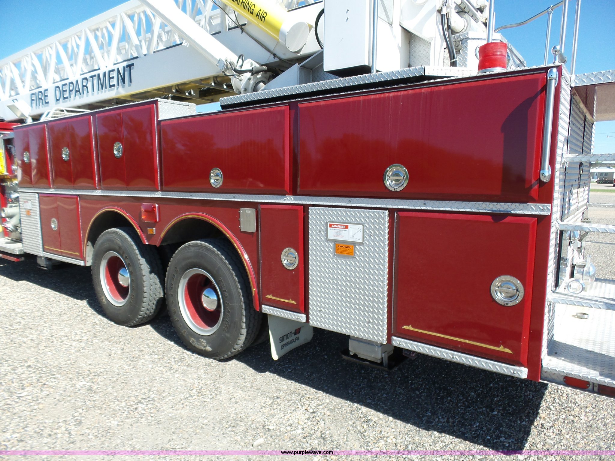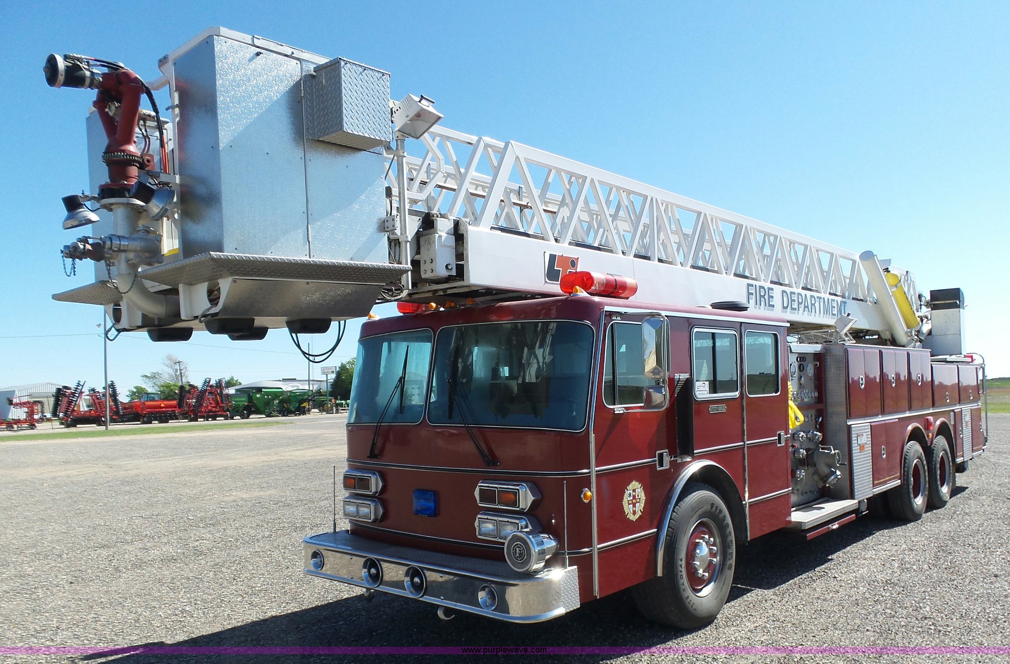 Purple Wave is selling a used Fire Truck or Emergency Vehicle in Kansas. This item is a 1982 Hendrickson 1871-WS fire truck with the following: 11,704 miles on odometer, 1,832 hours on meter, Detroit Diesel Silver 92 8V-92-TA turbo diesel engine, Serial 8VF076069, Automatic transmission, Model HT-740-D, Tandem axle, Heat, Air suspension seat, Air horn, Waterous MT-35-100 platform, 981 hours on meter, Serial 818218, 1,500 gpm pump, (4) outriggers, Simon LTi 818218 fire apparatus, Elevated control station, Akromatic 100 front turret gun, Style 5050, Electric cord reel, Outlet box, Work lights, Four section ladder, 100'L, Fresh air bottles, Air brakes, 40'3"L x 8'W x 11'8"H overall, 21'2" wheelbase, 425/65R22.5 front tires, 11.00R20 rear tires, GVWR 63,750 lbs, Hoses and radios will be removed prior to auction, Engine and transmission oil leak, Ladder extension cylinders leak