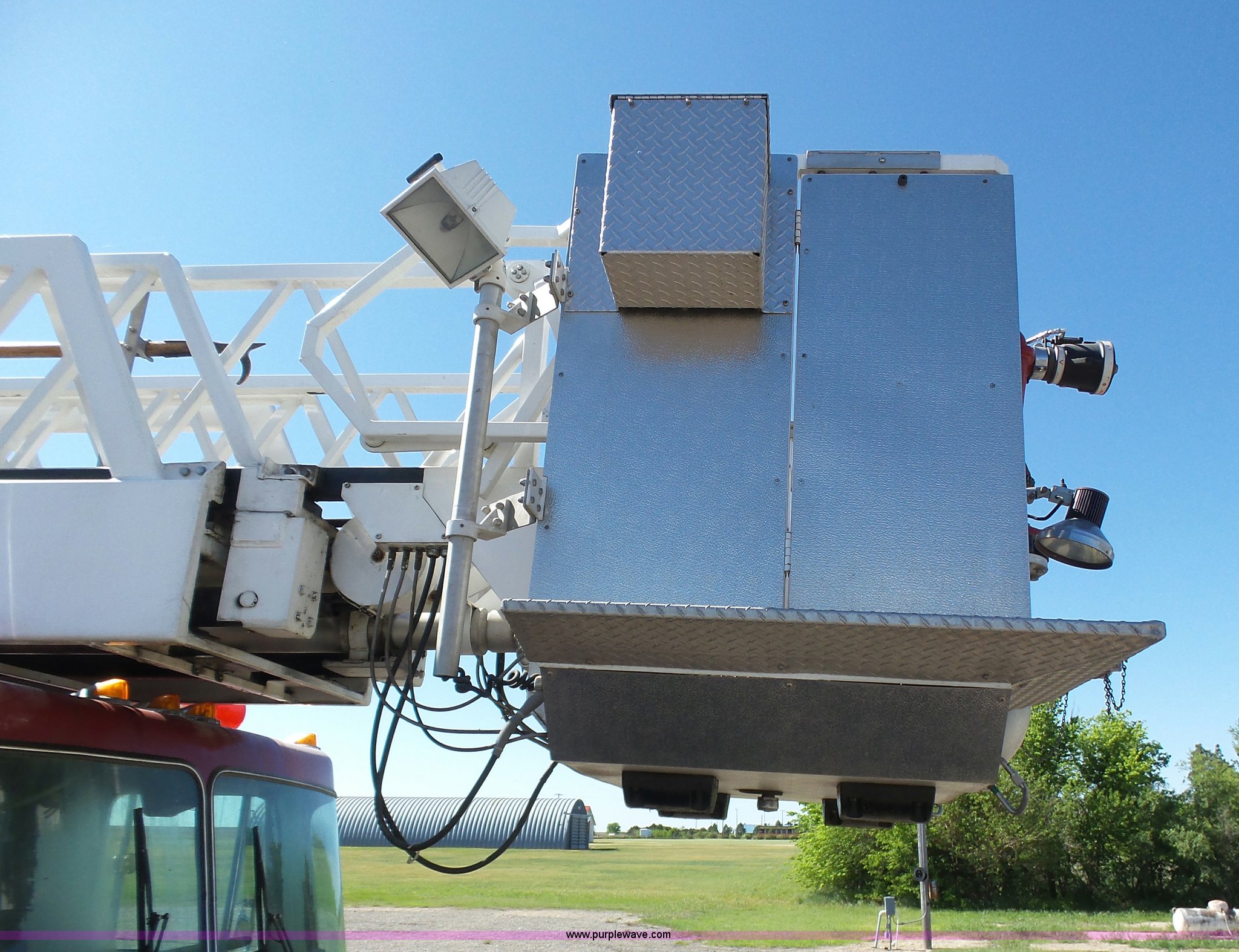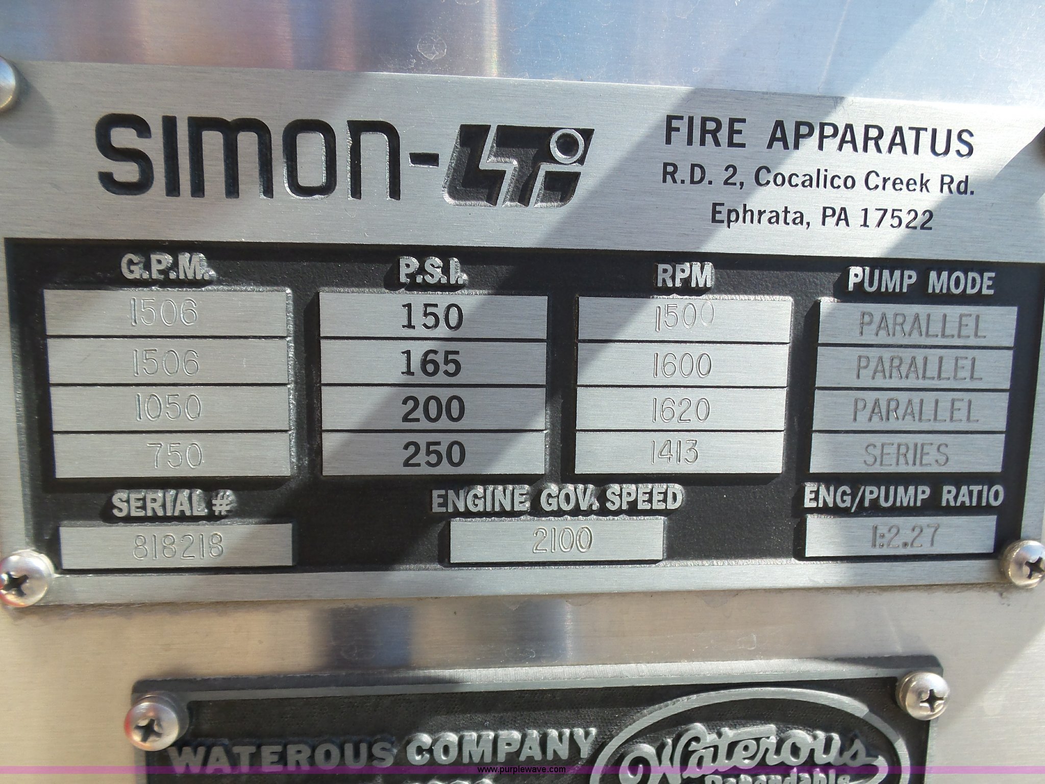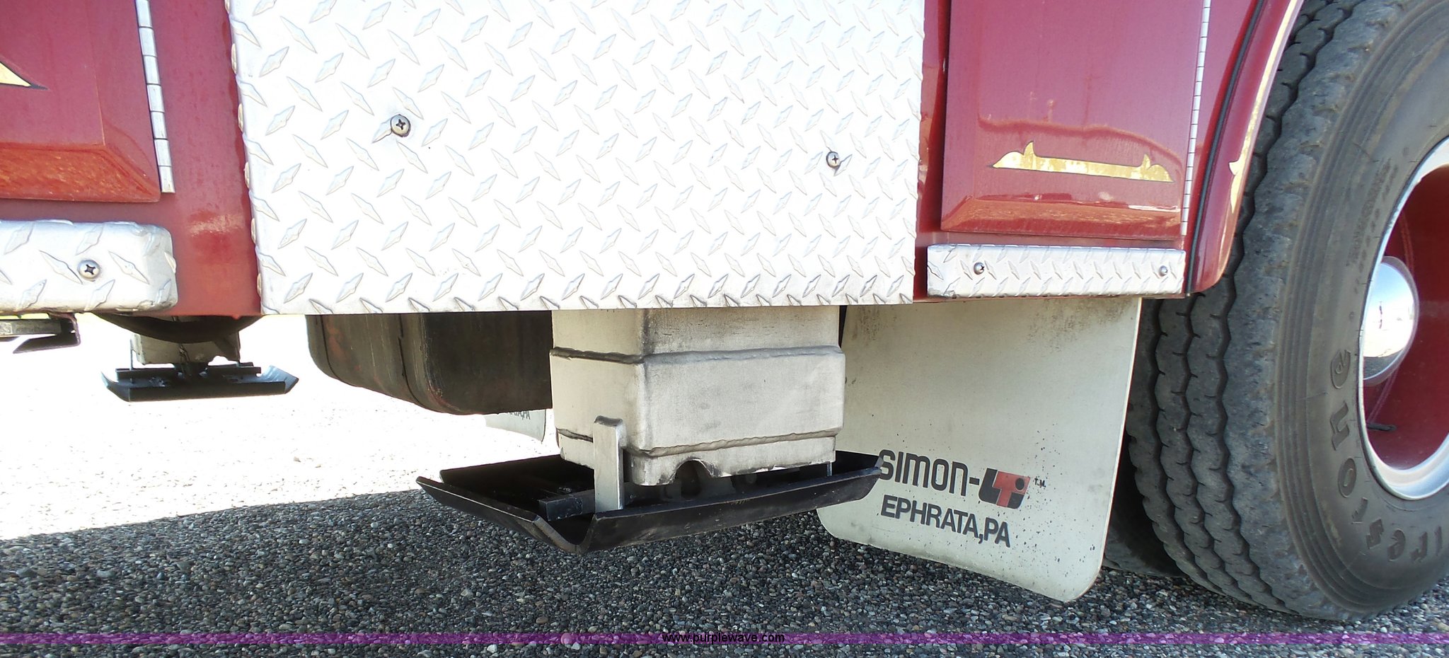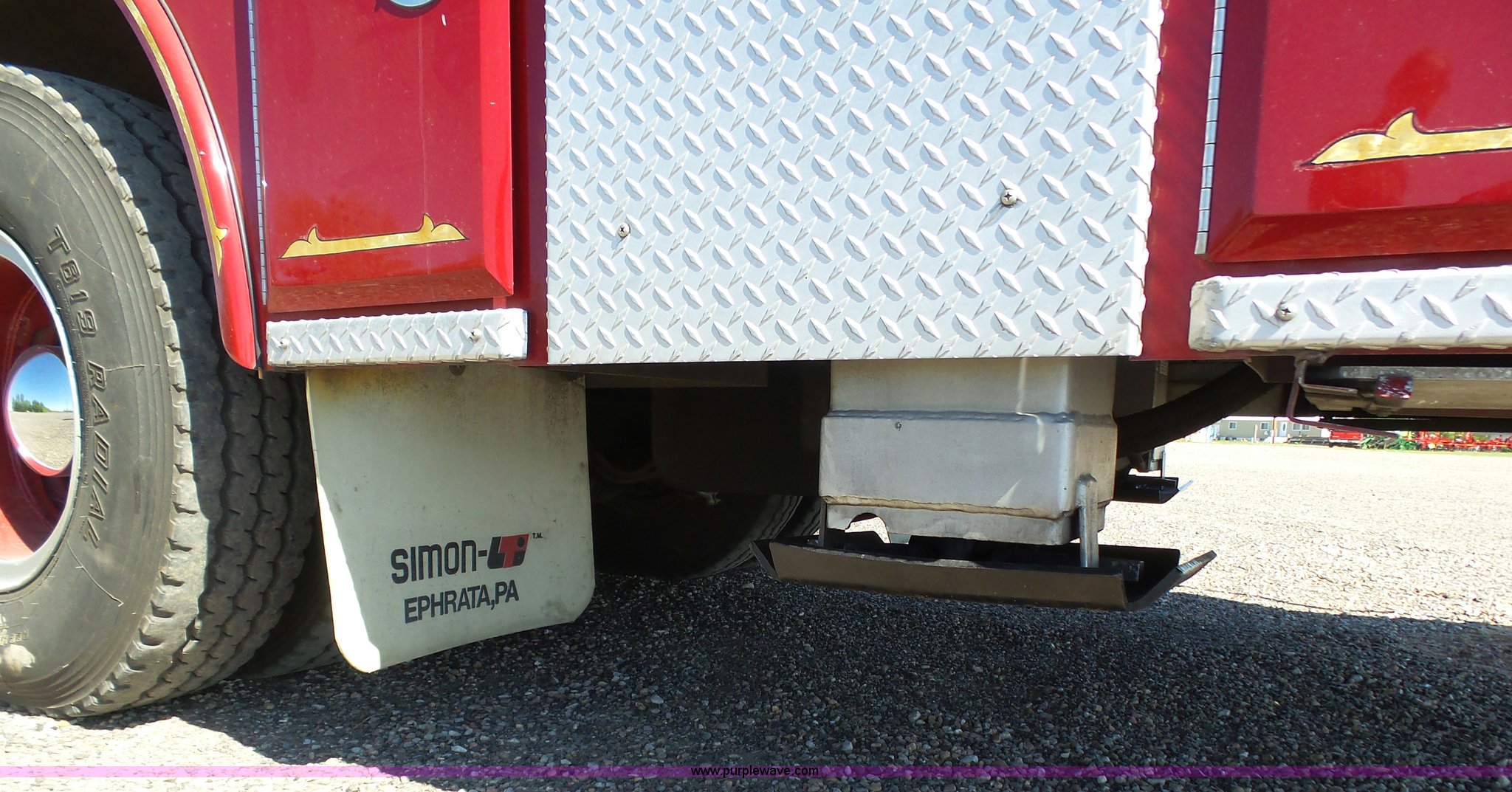 Purple Wave is selling a used Fire Truck or Emergency Vehicle in Kansas. This item is a 1982 Hendrickson 1871-WS fire truck with the following: 11,704 miles on odometer, 1,832 hours on meter, Detroit Diesel Silver 92 8V-92-TA turbo diesel engine, Serial 8VF076069, Automatic transmission, Model HT-740-D, Tandem axle, Heat, Air suspension seat, Air horn, Waterous MT-35-100 platform, 981 hours on meter, Serial 818218, 1,500 gpm pump, (4) outriggers, Simon LTi 818218 fire apparatus, Elevated control station, Akromatic 100 front turret gun, Style 5050, Electric cord reel, Outlet box, Work lights, Four section ladder, 100'L, Fresh air bottles, Air brakes, 40'3"L x 8'W x 11'8"H overall, 21'2" wheelbase, 425/65R22.5 front tires, 11.00R20 rear tires, GVWR 63,750 lbs, Hoses and radios will be removed prior to auction, Engine and transmission oil leak, Ladder extension cylinders leak