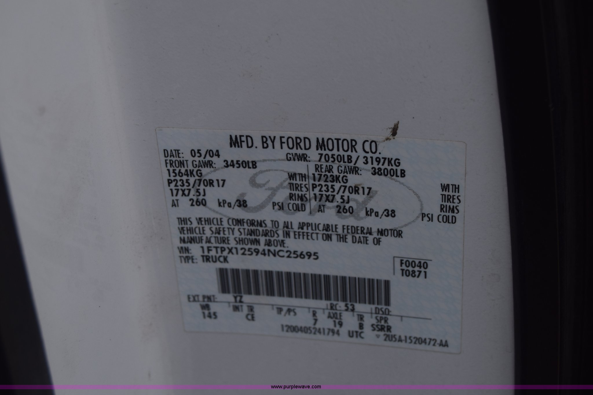 Purple Wave is selling a used 1/2 Ton Pickup or Van in Kansas. This item is a 2004 Ford F150 SuperCab pickup truck with the following: 103,164 miles on odometer, 5.4L V6 SOHC 16V gas engine, Automatic transmission, AC and heat, Tilt, Cruise, AM/FM, Manual windows and locks, Cloth interior, Trailer wiring, 235/70R17 tires, Seat torn, Rust, Interior/exterior cosmetic damage