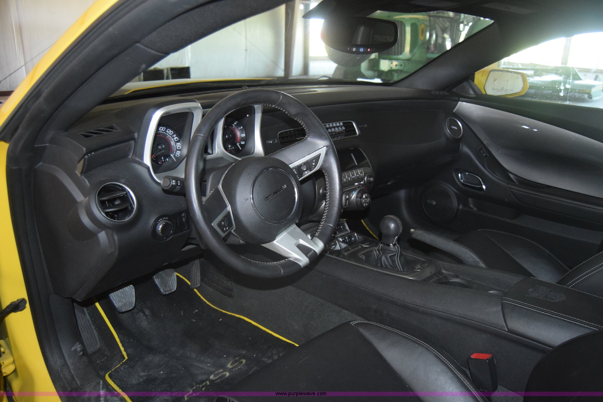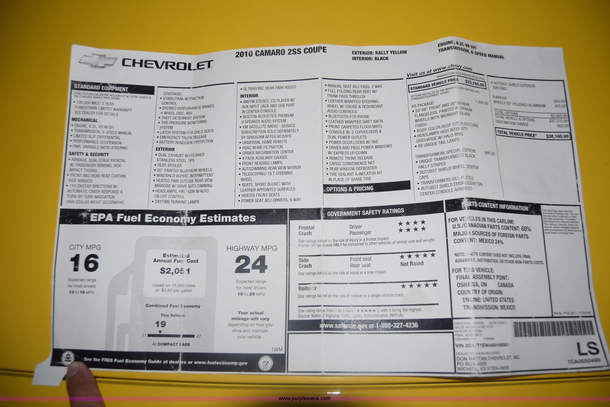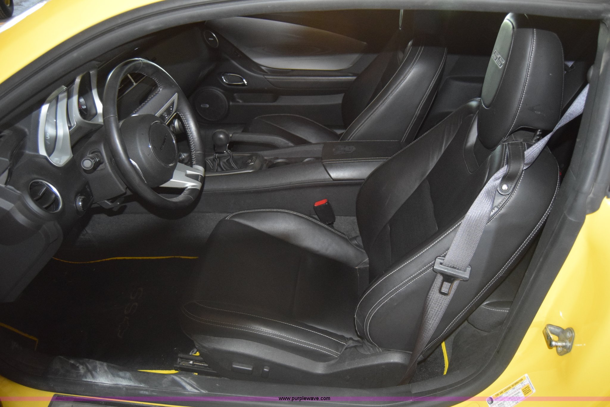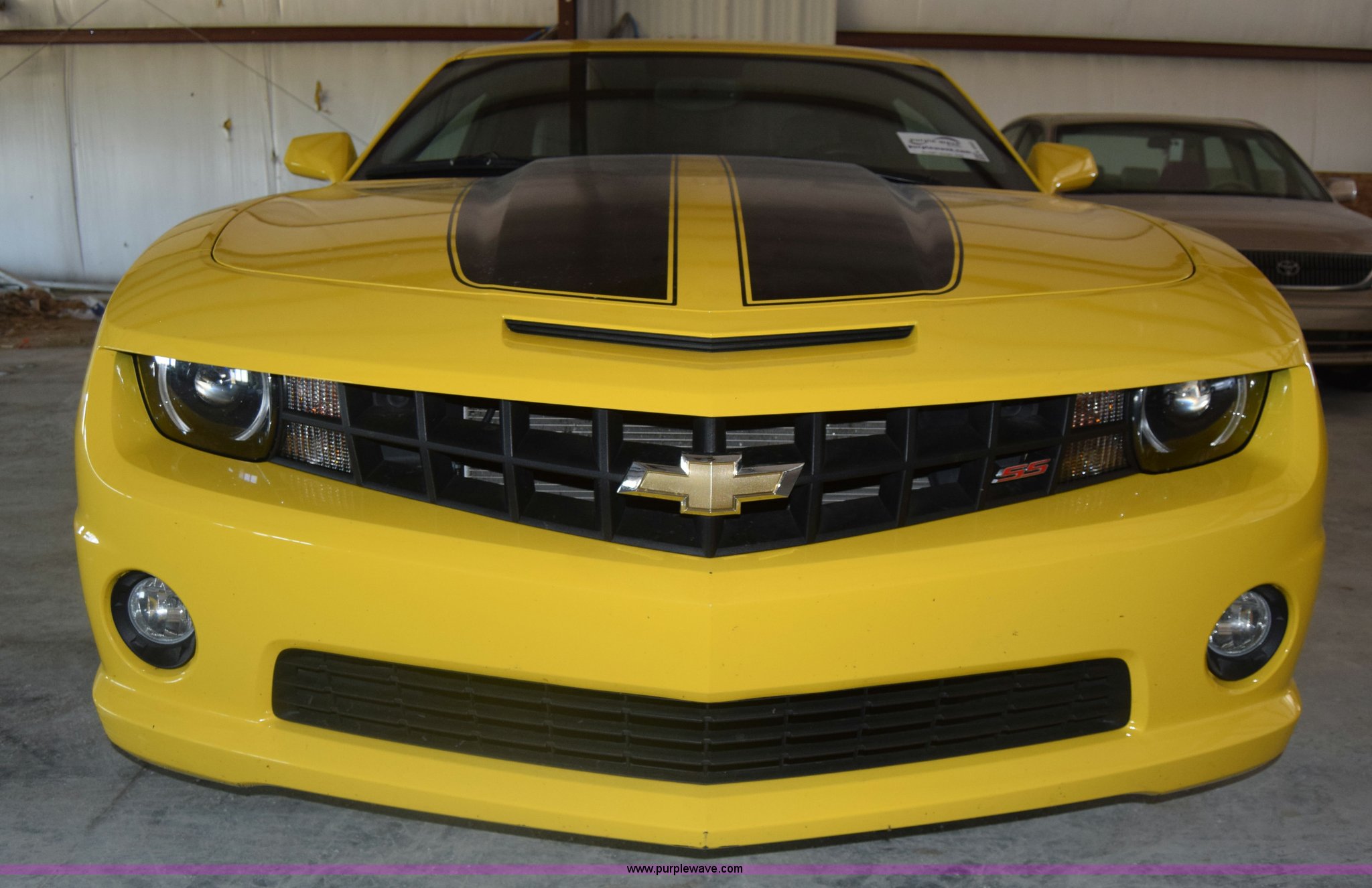 Purple Wave is selling a used Passenger Vehicle in Kansas. This item is a 2010 Chevrolet Camaro 2SS with the following: Approx. 43,350 miles, 6.2L V8 OHV 16V gas engine, Six speed manual transmission, AC and heat, Tilt, Cruise, AM/FM/CD, Power windows, locks, mirrors, and seat, Leather interior, Sunroof, Keys, 275/40ZR20 tires, Interior/exterior cosmetic damage, Unknown operating condition, Wiring issues in dash, Dead battery
