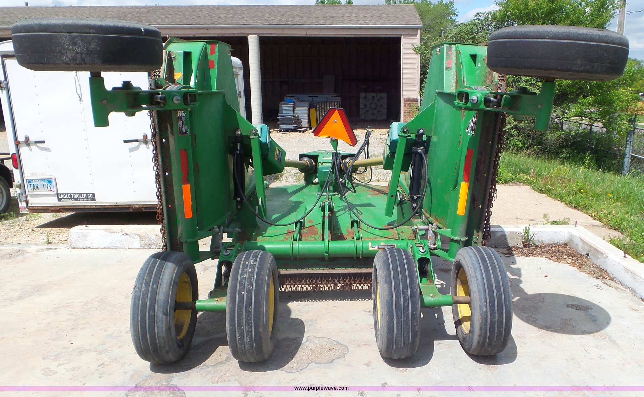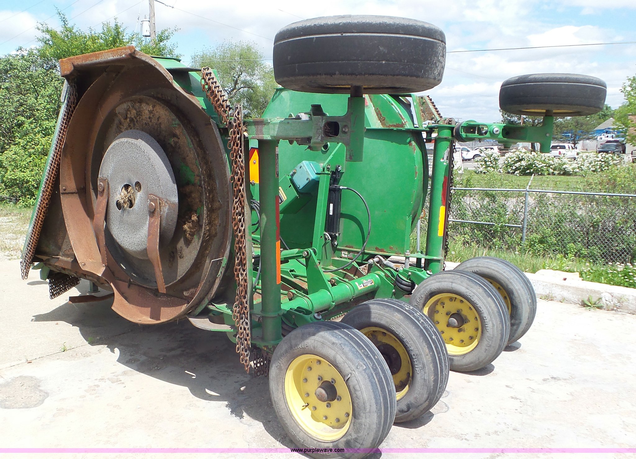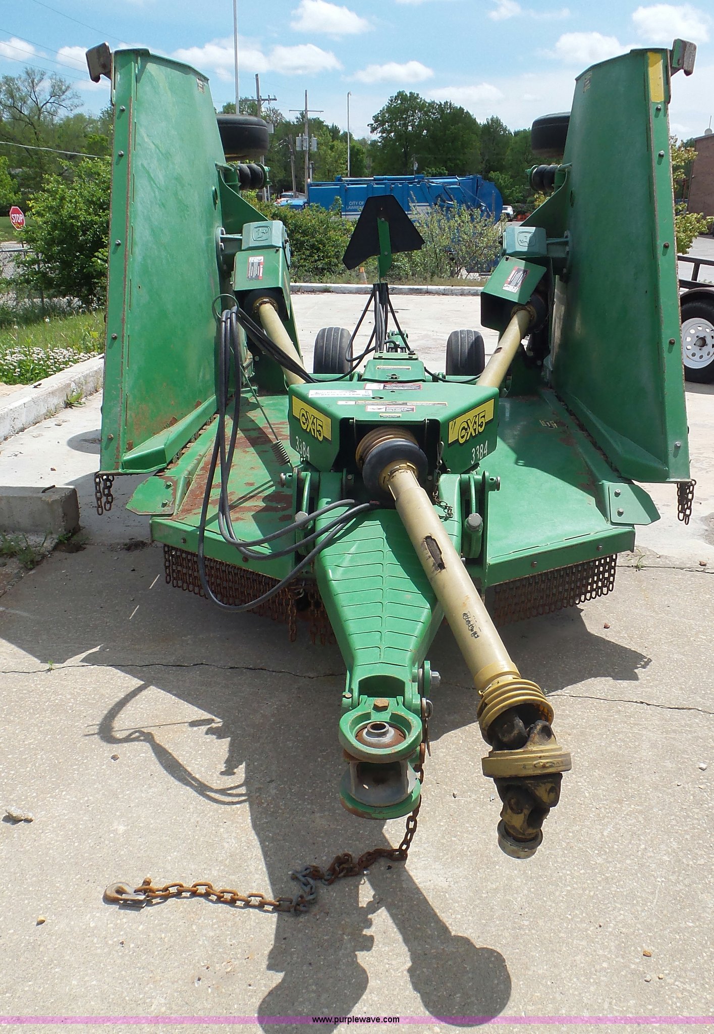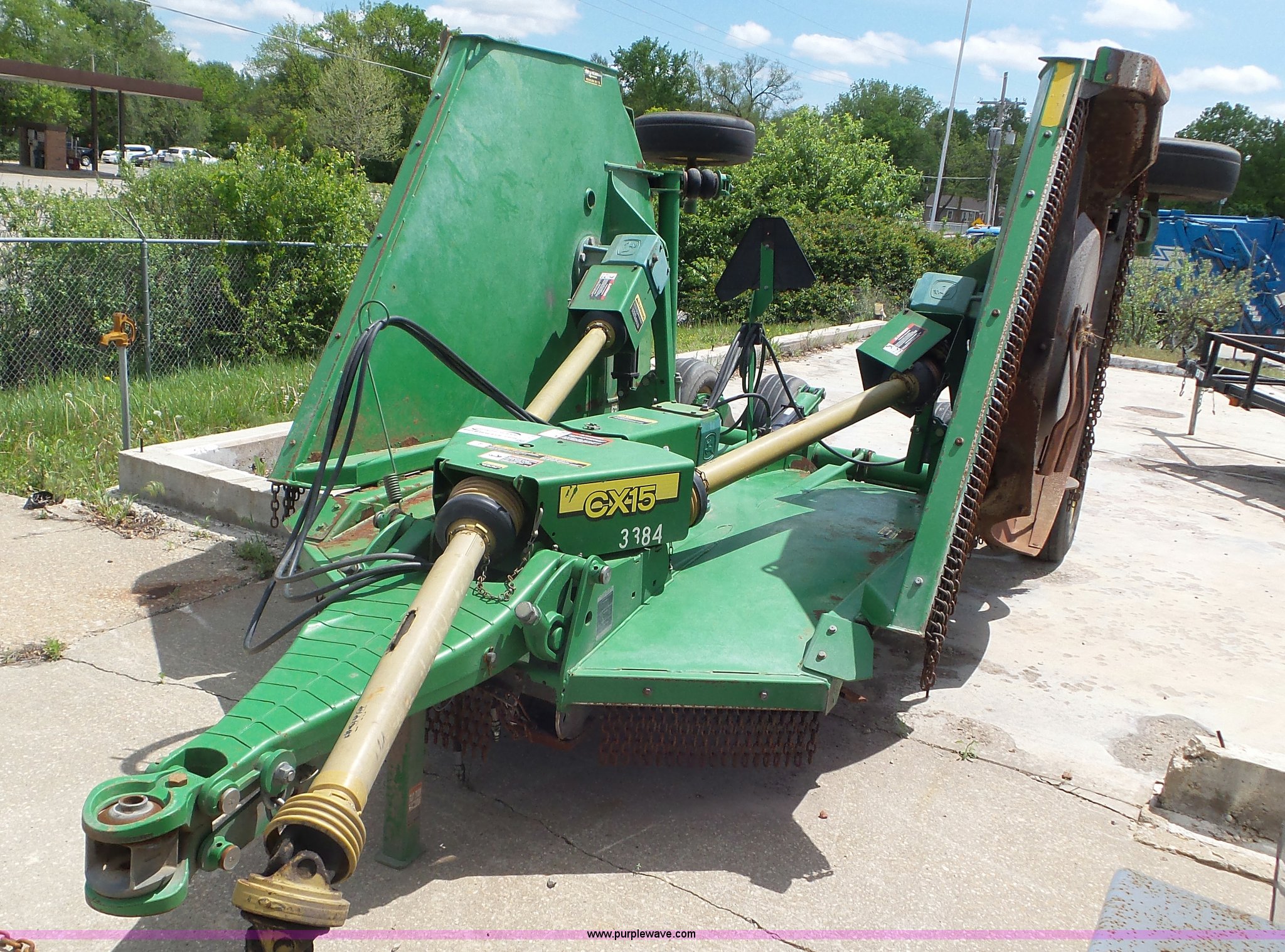 Purple Wave is selling a used Mower, Cutter, Shredder in Kansas. This item is a 2009 John Deere CX15 rotary mower with the following: 15'W, Hydraulic fold, Air suspension, 540 PTO, Pin hitch, 26x9-14.5 tires, Serial W0CX15E007722, Unit# 3384
