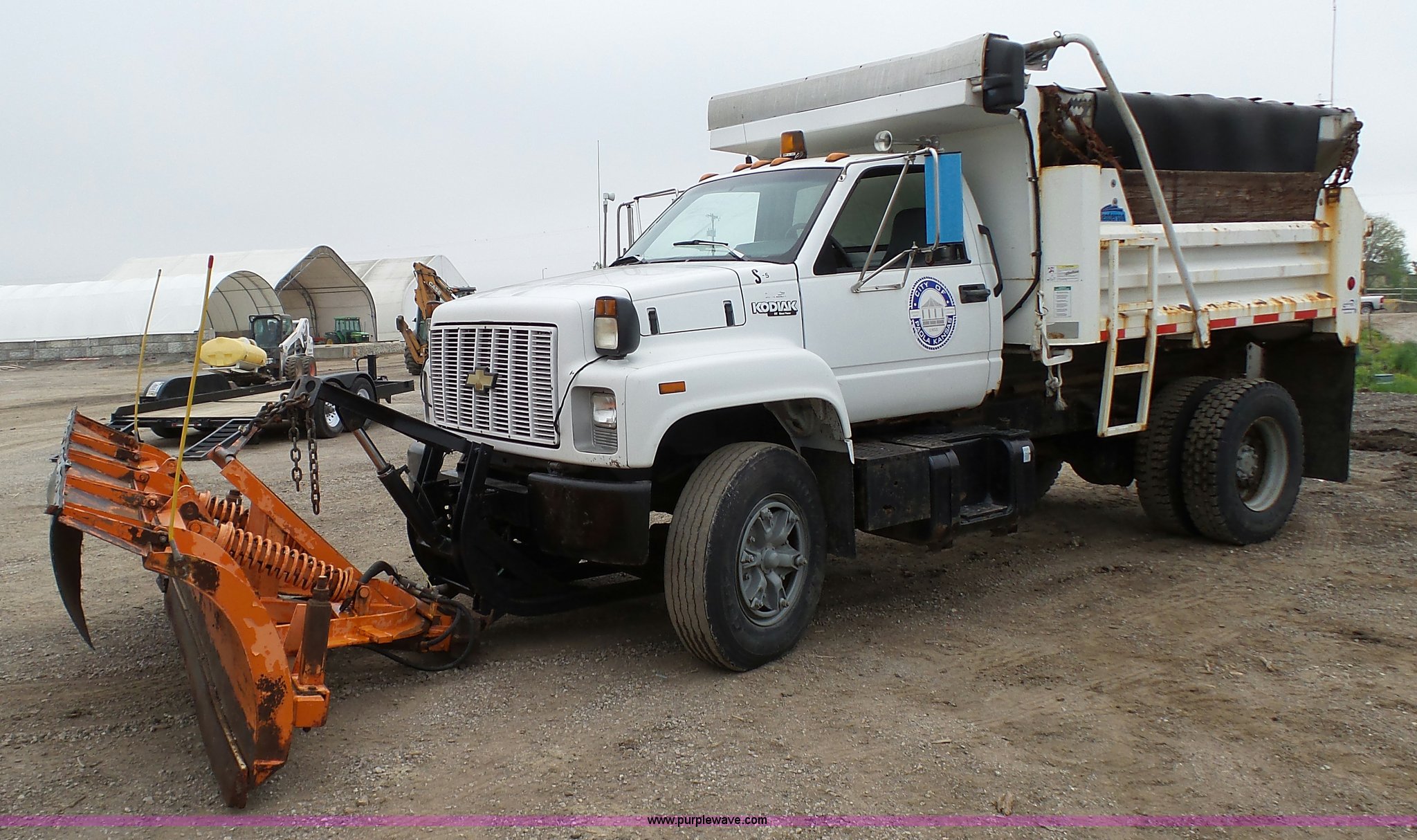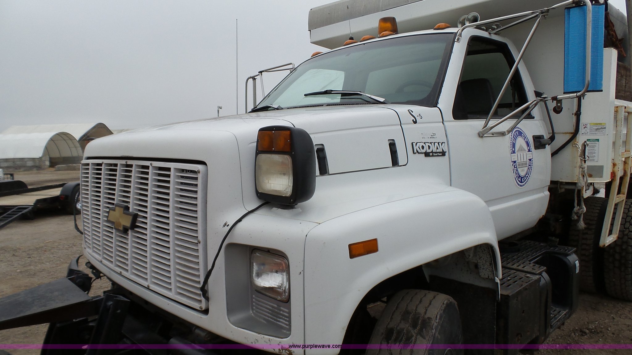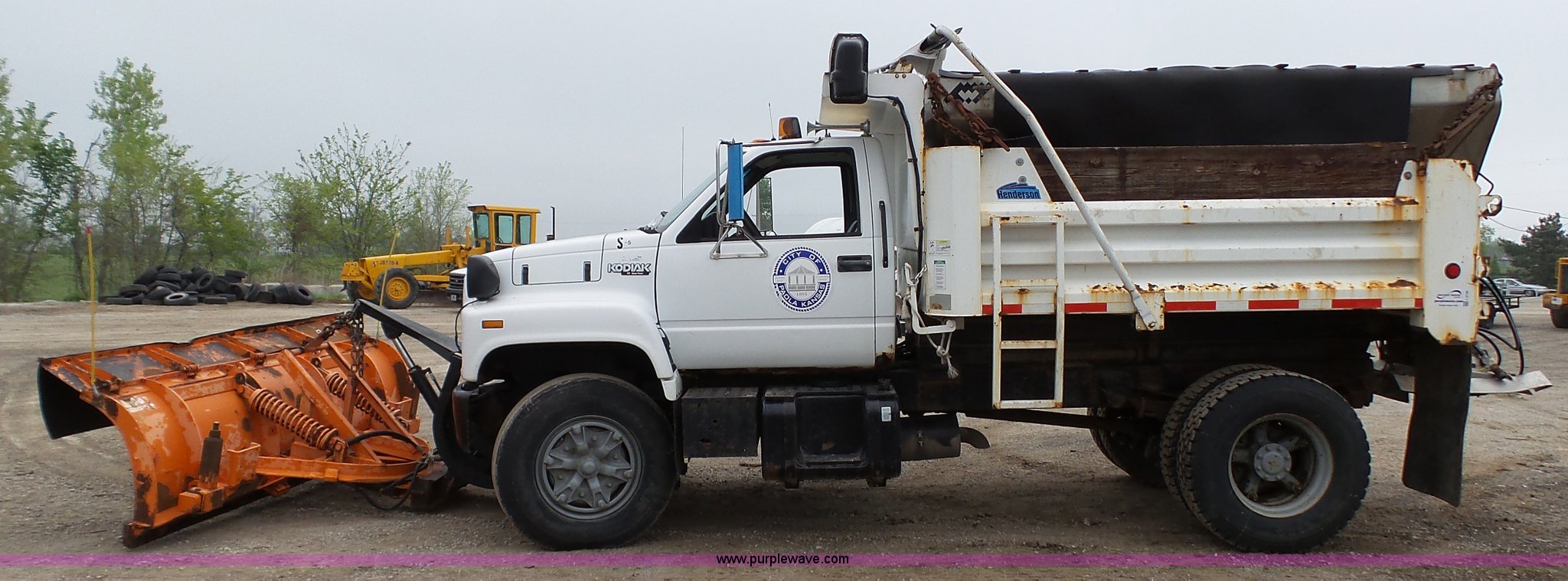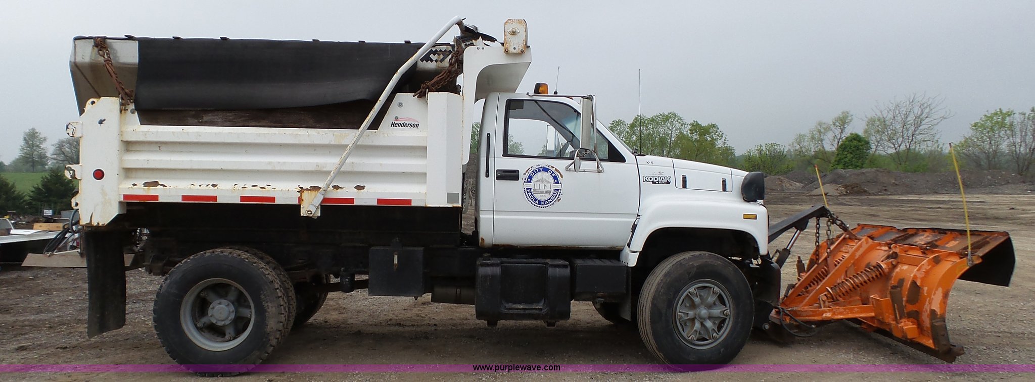 Purple Wave is selling a used Construction Dump Truck in Kansas. This item is a 1993 Chevrolet Kodiak dump truck with the following: 89,123 miles on odometer, 8,111 hours on meter, Caterpillar 3116 6.6L six cylinder turbo diesel engine, Five speed manual transmission, Single axle, Heat, Suspension seat, Block heater, PTO, Henderson steel dump bed, 10'L x 8'W, 35" side height, Rollover tarp, Single ram hoist, Monroe MP36R10-CT plow, 10'W, Warren stainless steel spreader, 10'L, Single spreader, Dual fuel tanks, Spring suspension, Air brakes, 11R22.5 tires, GVWR 33,200 lbs, FAWR 12,000 lbs, RAWR 21,200 lbs, Service records available upon request