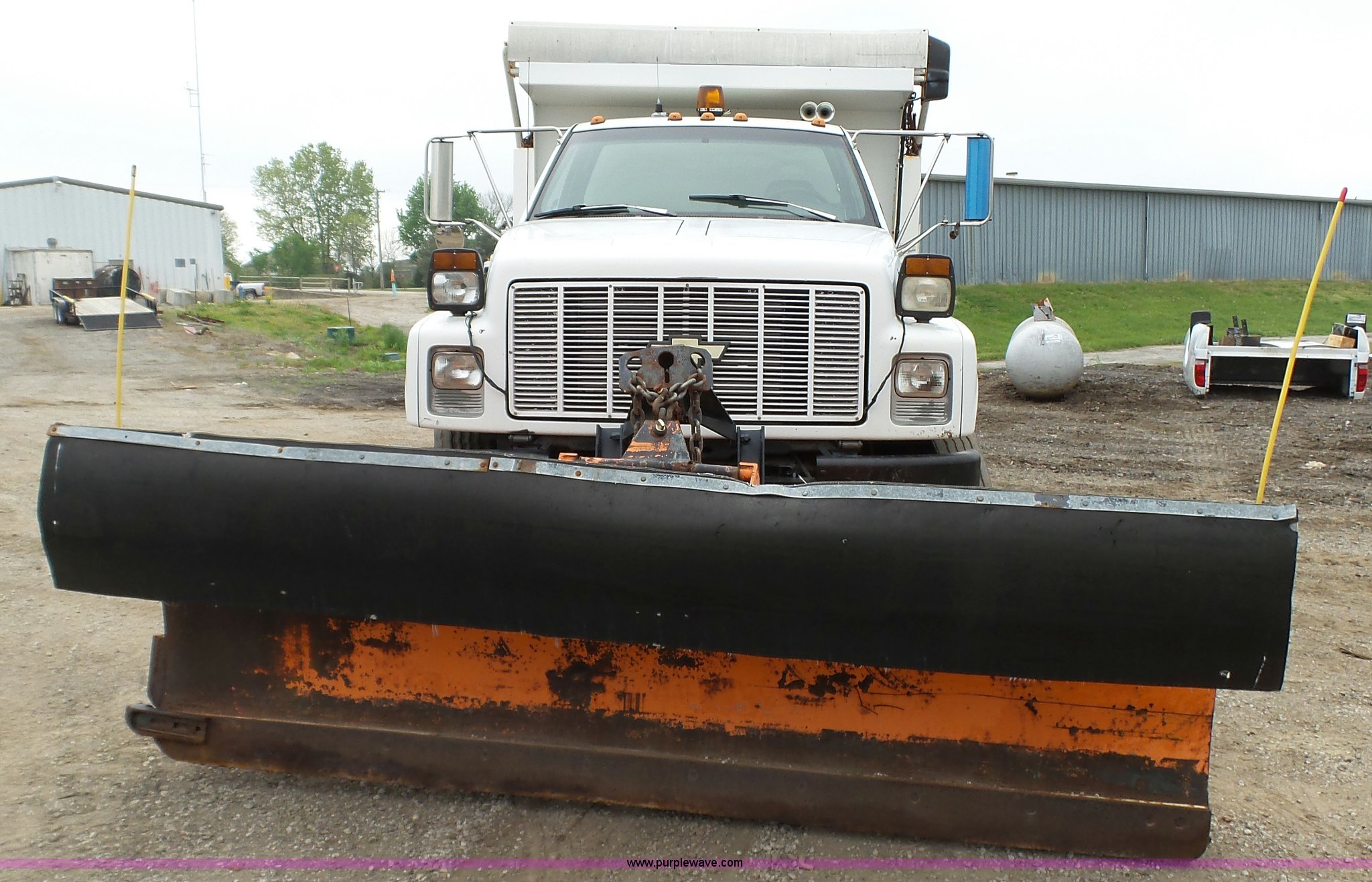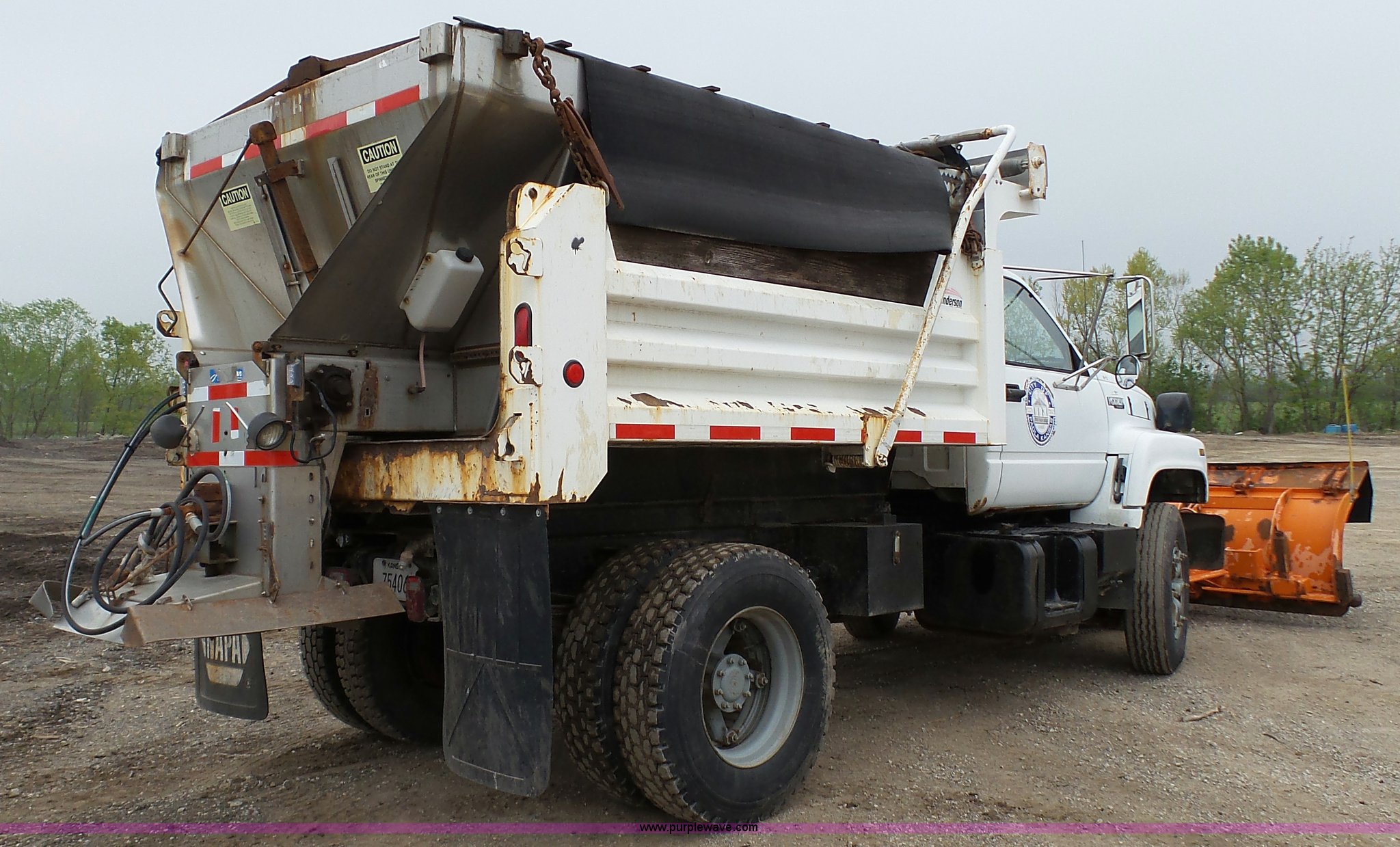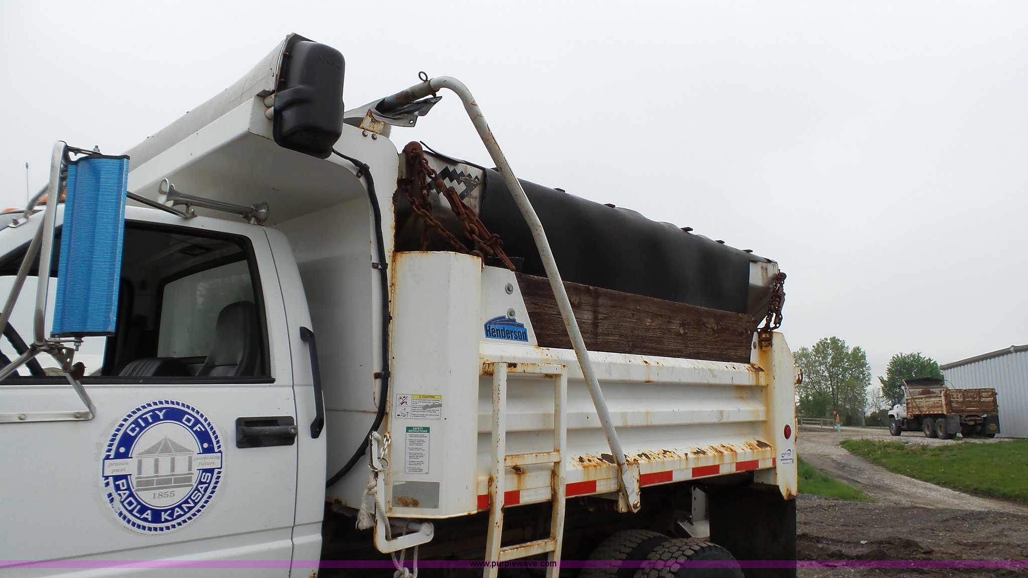 1993 Chevrolet Kodiak dump truck. 89,123 miles on odometer, 8,111 hours on meter, Caterpillar 3116 6.6L six cylinder turbo diesel engine, Five speed manual transmission, Single axle, Heat, Suspension seat, Block heater, PTO, Henderson steel dump bed 10'L x 8'W, 35" side height, Rollover tarp, Single ram hoist, Monroe MP36R10-CT plow 10'W, Warren stainless steel spreader 10'L, Single spreader, Dual fuel tanks, Spring suspension, Air brakes, 11R22.5 tires, GVWR 33,200 lbs, FAWR 12,000 lbs, RAWR 21,200 lbs, Service records available upon request. Kansas title. 1GBP7H1J5PJ106274. City of Paola. 29370 Old KC Rd. Paola, KS 66071