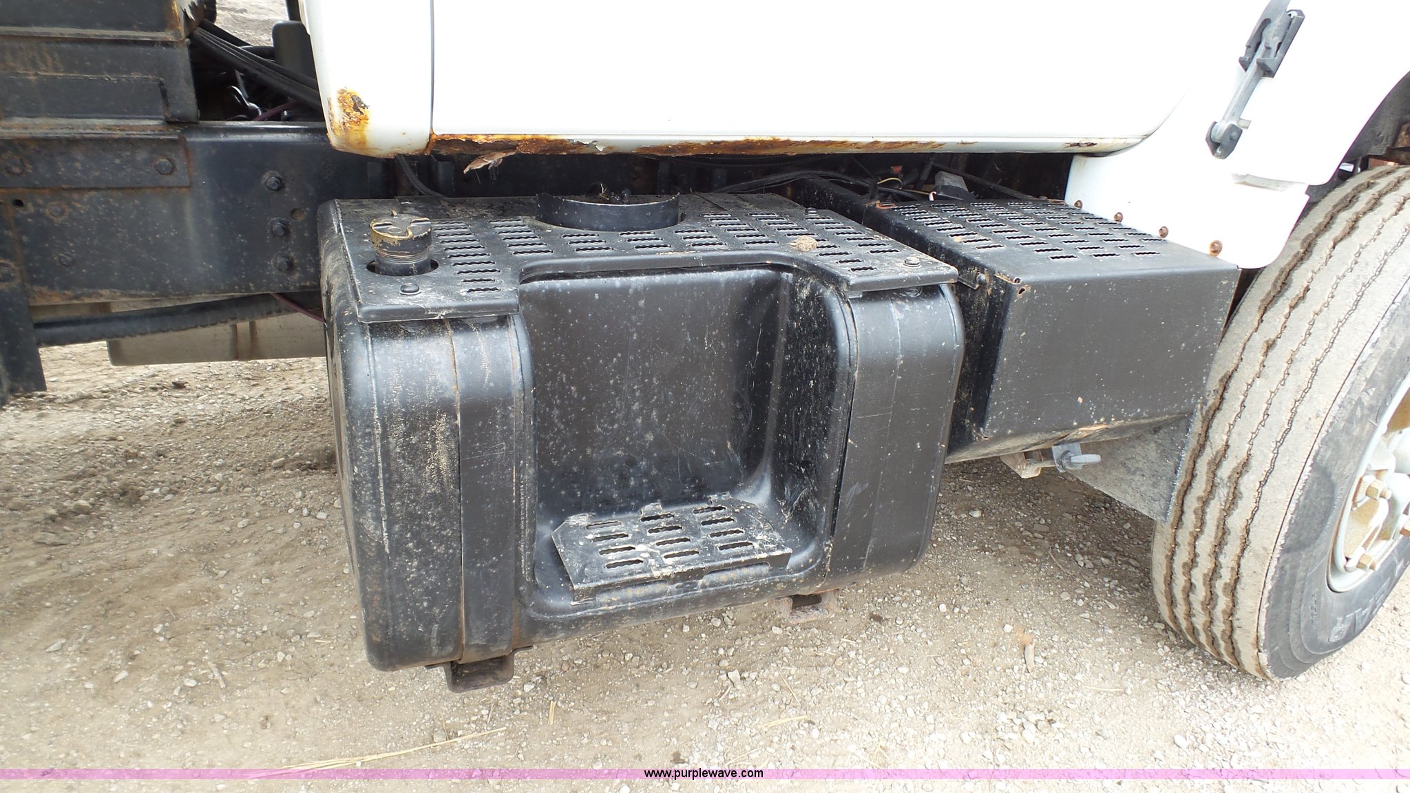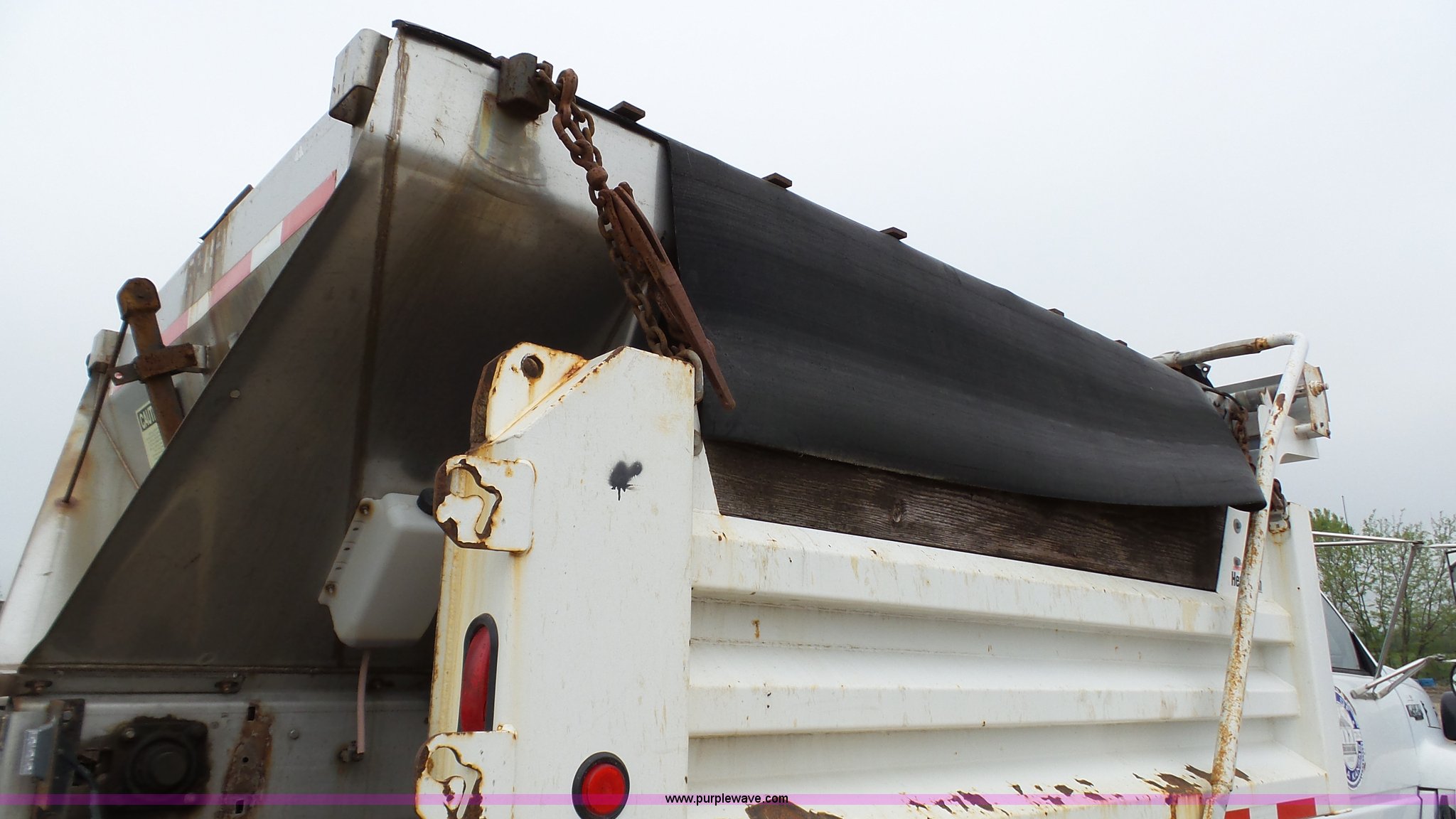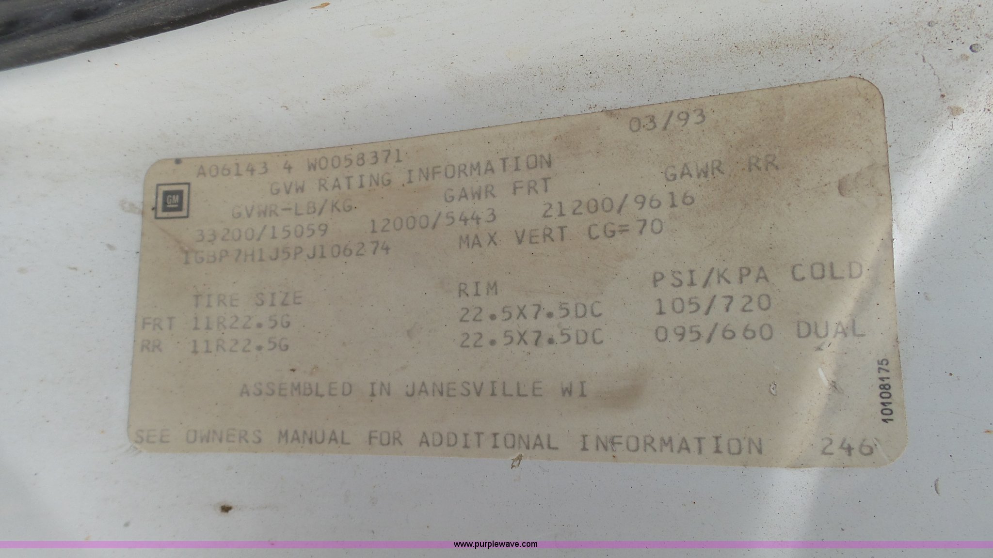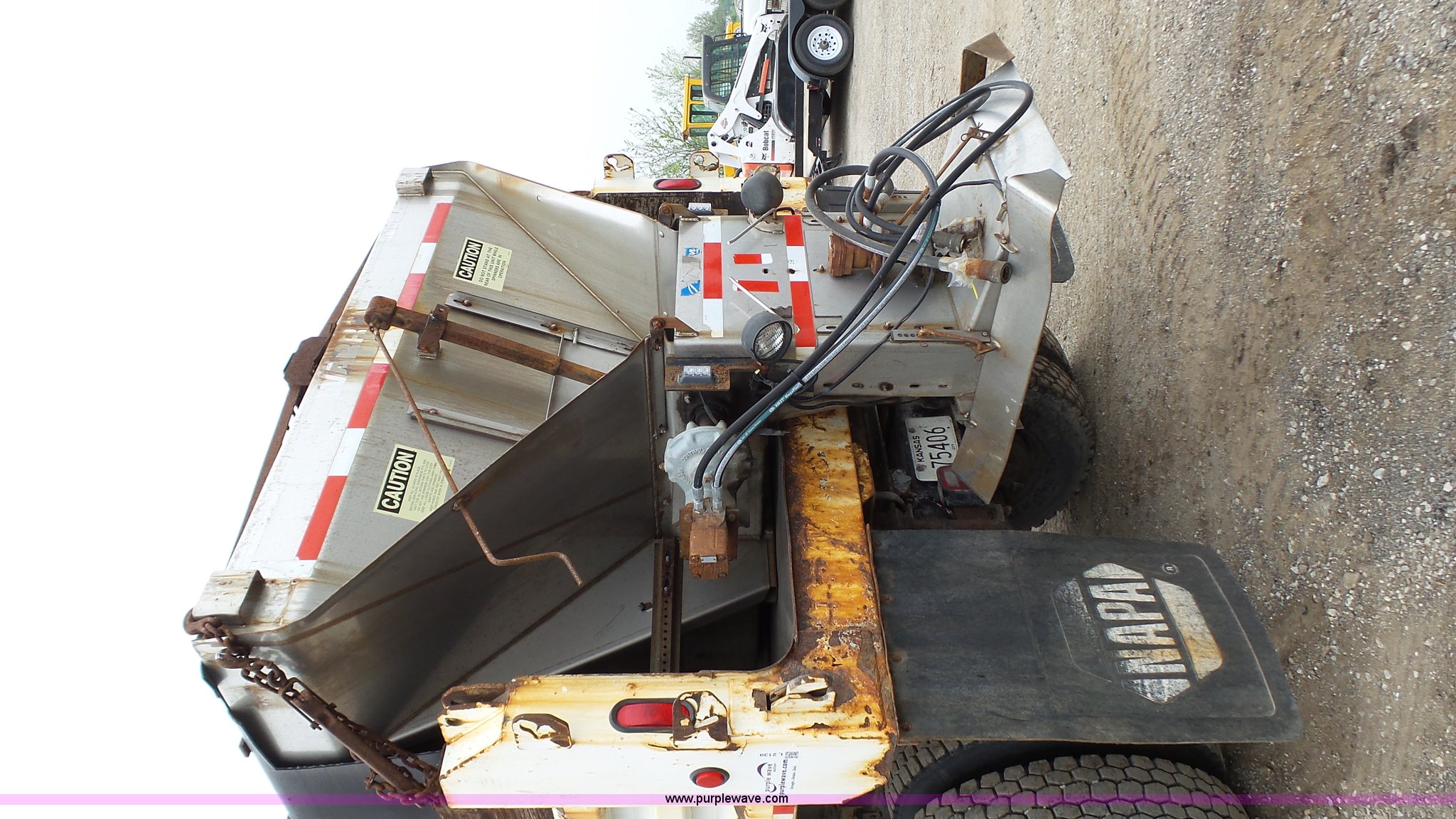 1993 Chevrolet Kodiak dump truck. 89,123 miles on odometer, 8,111 hours on meter, Caterpillar 3116 6.6L six cylinder turbo diesel engine, Five speed manual transmission, Single axle, Heat, Suspension seat, Block heater, PTO, Henderson steel dump bed 10'L x 8'W, 35" side height, Rollover tarp, Single ram hoist, Monroe MP36R10-CT plow 10'W, Warren stainless steel spreader 10'L, Single spreader, Dual fuel tanks, Spring suspension, Air brakes, 11R22.5 tires, GVWR 33,200 lbs, FAWR 12,000 lbs, RAWR 21,200 lbs, Service records available upon request. Kansas title. 1GBP7H1J5PJ106274. City of Paola. 29370 Old KC Rd. Paola, KS 66071