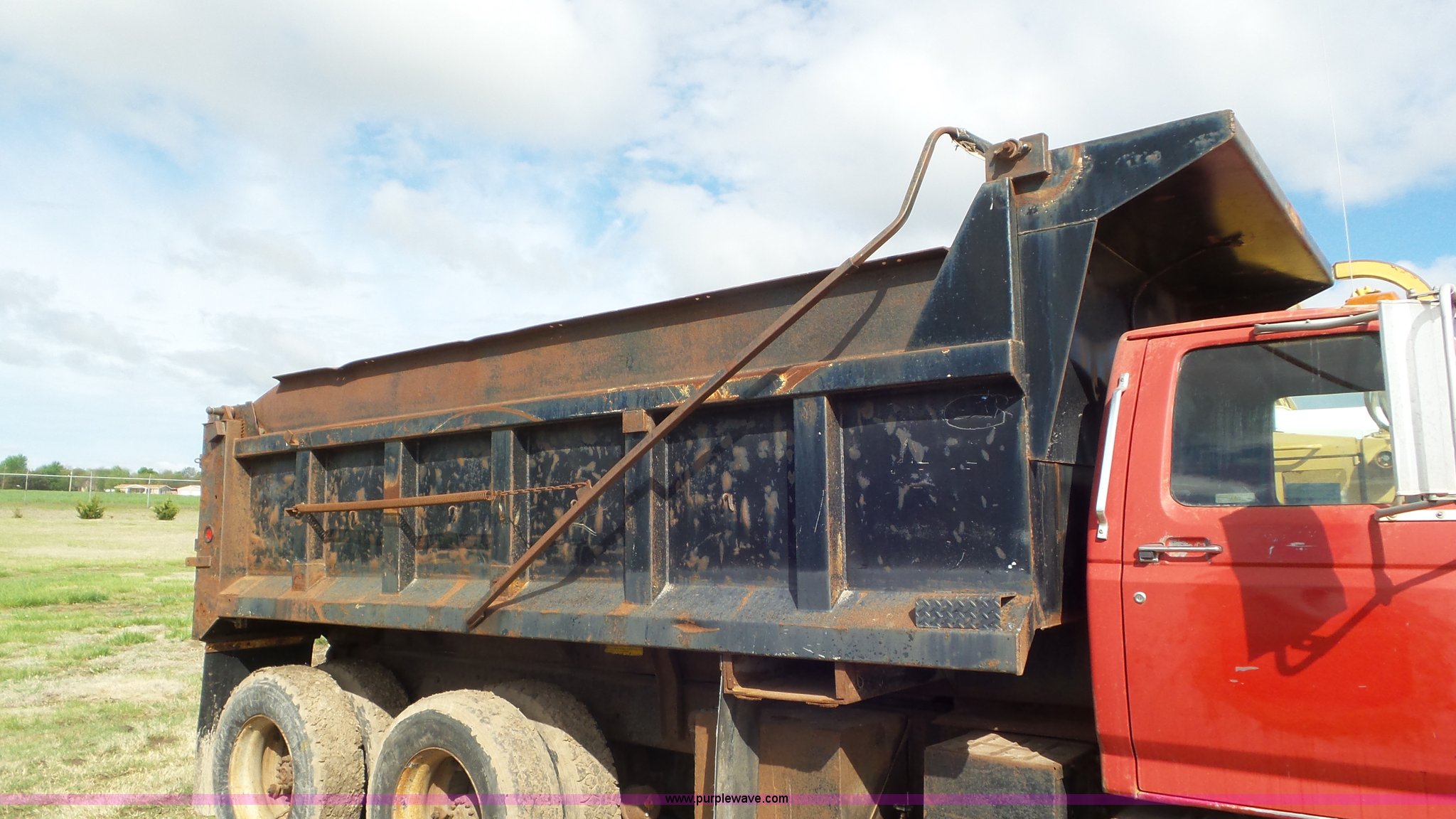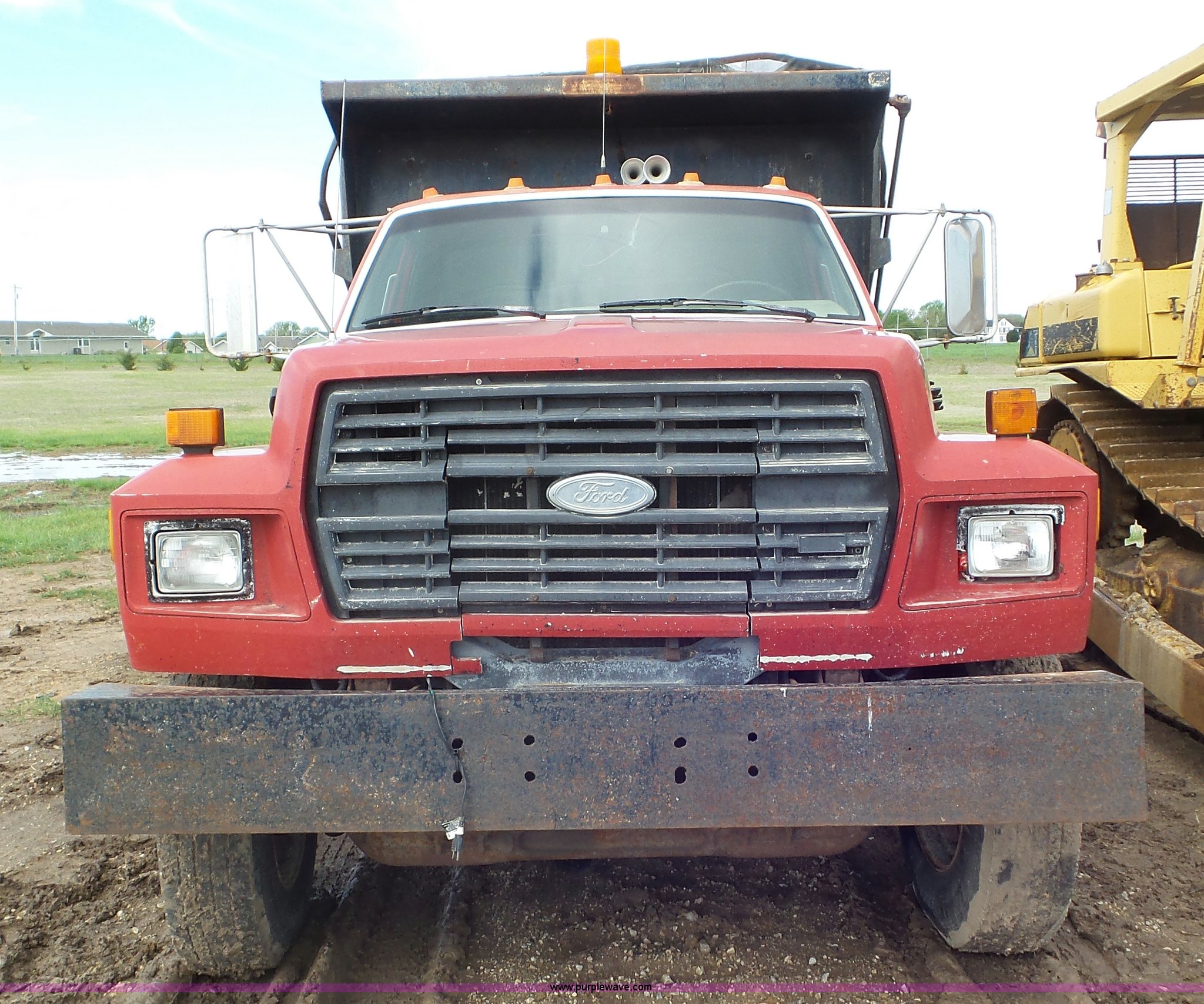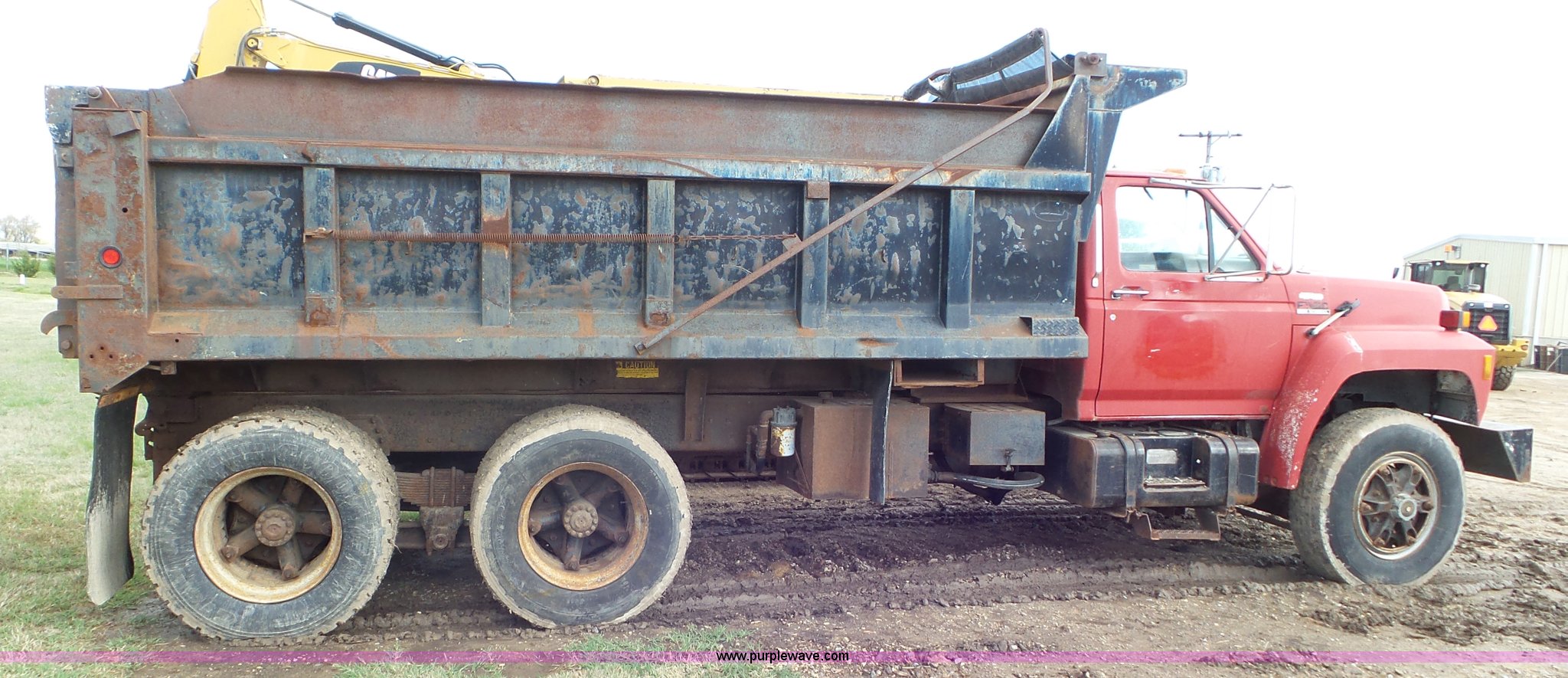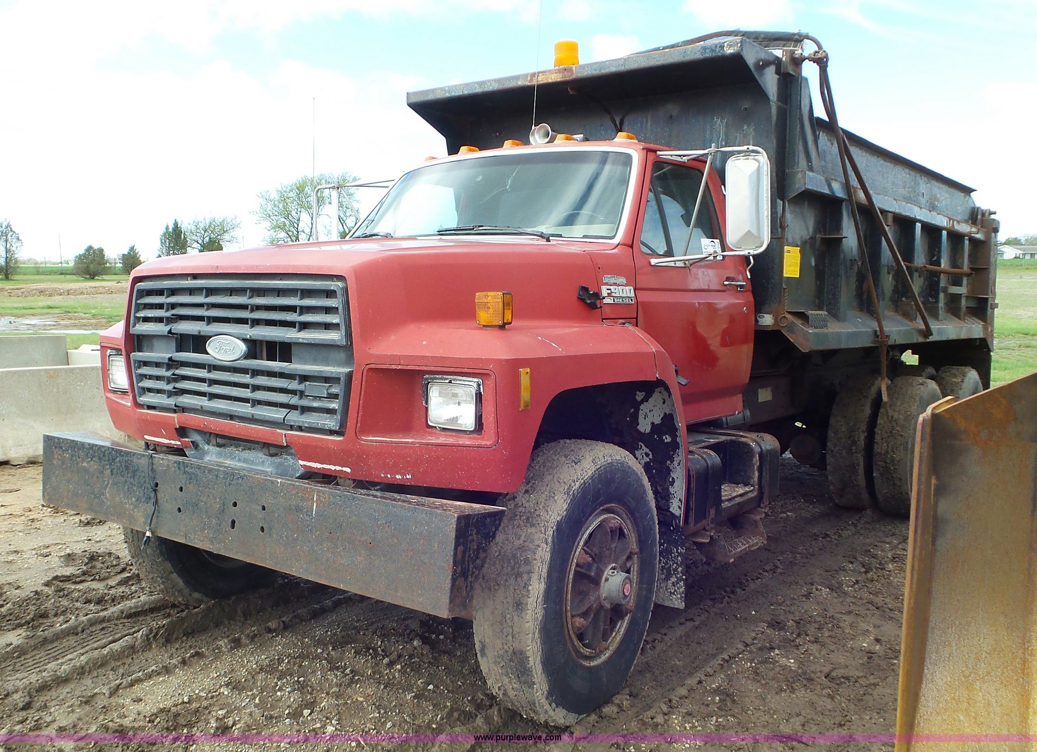 Purple Wave is selling a used Construction Dump Truck in Kansas. This item is a 1989 Ford F900 dump truck with the following: 443,883 miles on odometer, Ford 7.8L L6 turbo diesel engine, Eaton Fuller 10 speed manual transmission, Tandem axle, Heat, AM/FM, Suspension seat, Block heater, PTO, 15'L x 8'W steel dump bed, 44"H sides, Rollover tarp, Single ram hoist, Air operated end gate, Dual fuel tanks, Spring over walking beam suspension, Air brakes, 189" wheelbase, 11R22.5 front tires, 295/75R22.5 rear tires
