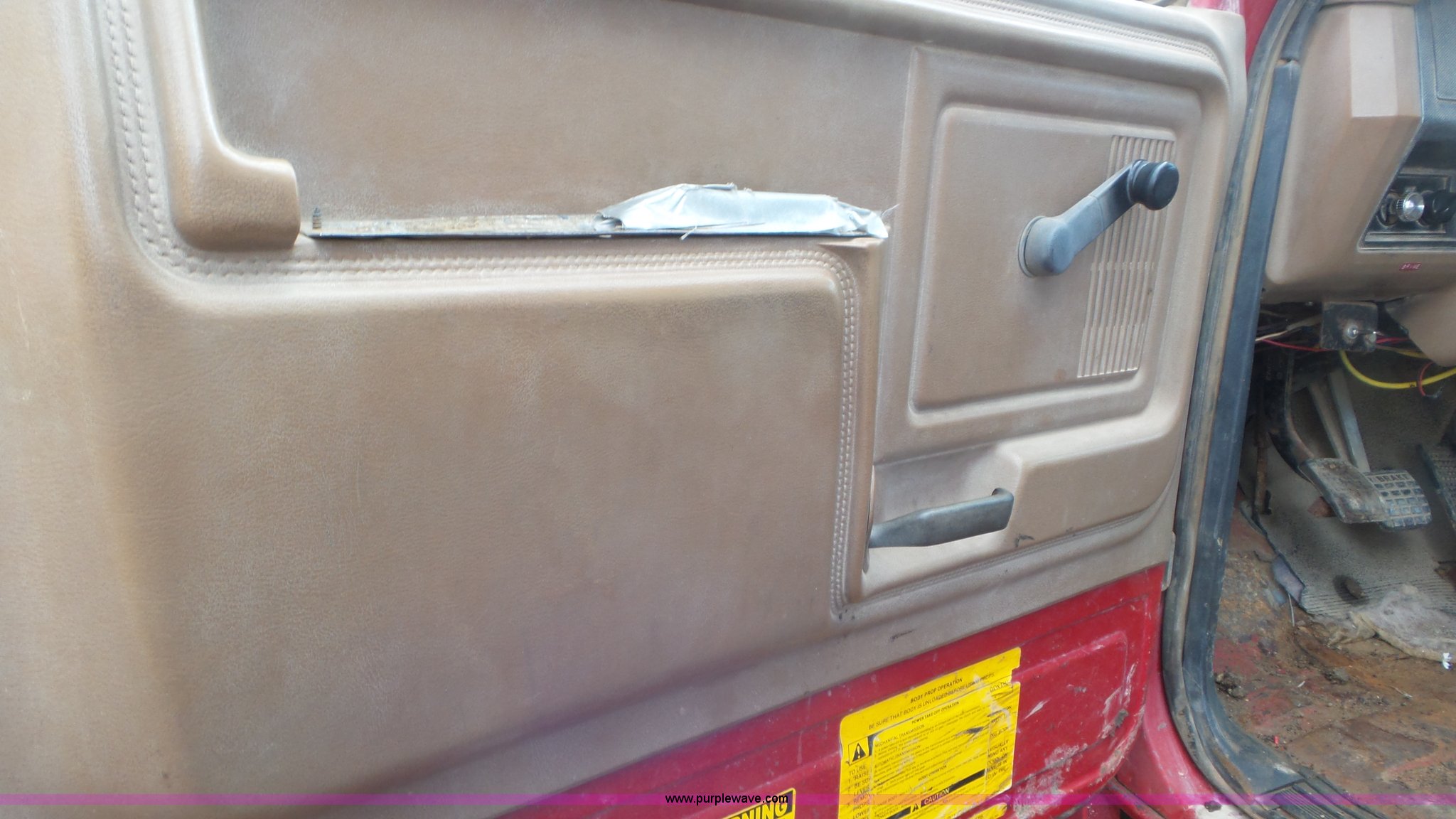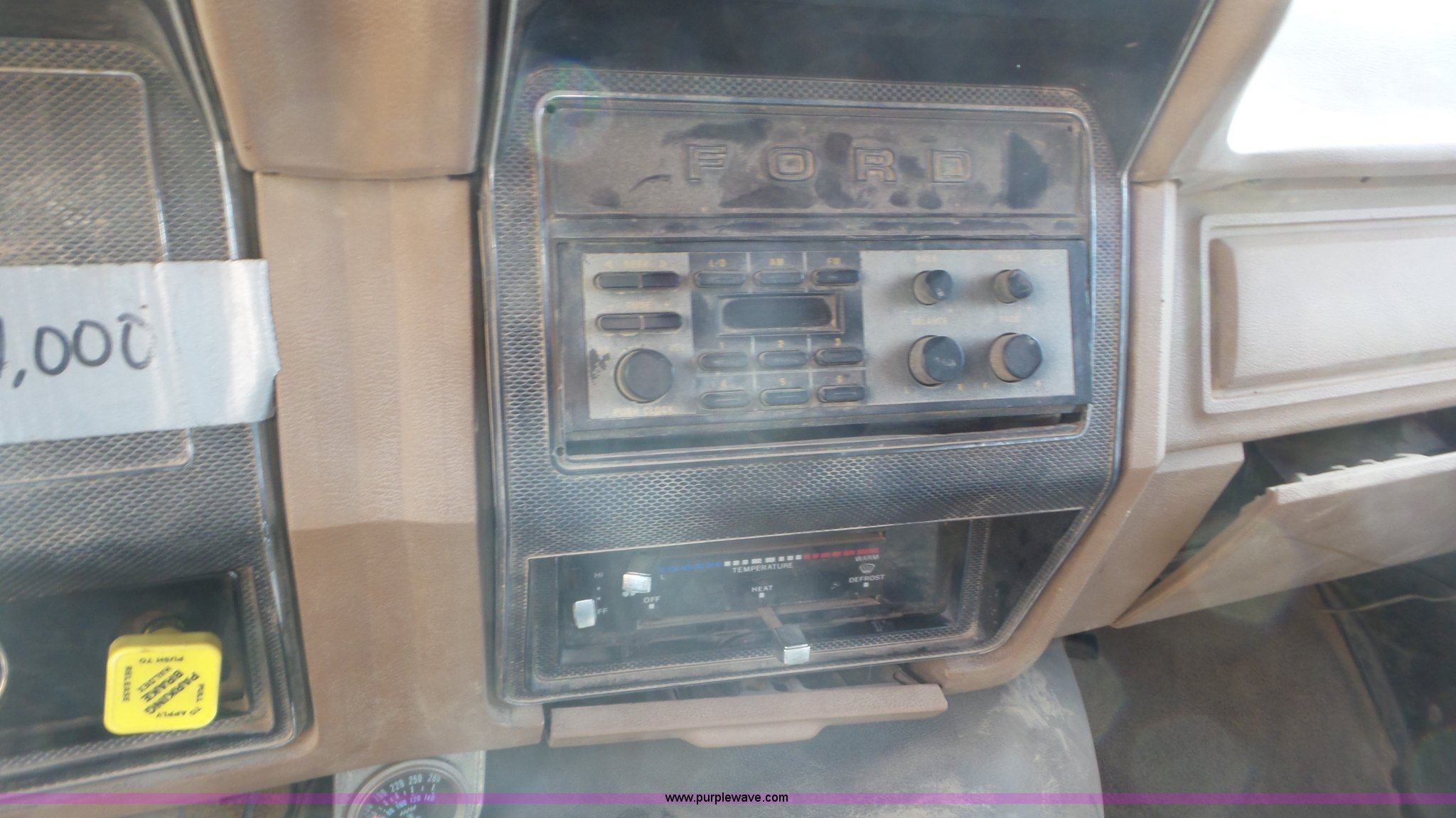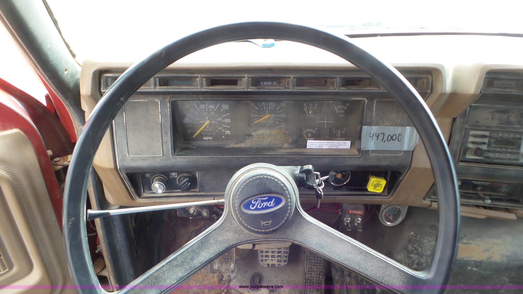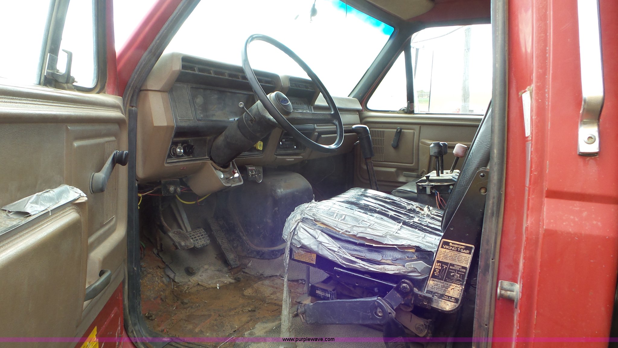 Purple Wave is selling a used Construction Dump Truck in Kansas. This item is a 1989 Ford F900 dump truck with the following: 443,883 miles on odometer, Ford 7.8L L6 turbo diesel engine, Eaton Fuller 10 speed manual transmission, Tandem axle, Heat, AM/FM, Suspension seat, Block heater, PTO, 15'L x 8'W steel dump bed, 44"H sides, Rollover tarp, Single ram hoist, Air operated end gate, Dual fuel tanks, Spring over walking beam suspension, Air brakes, 189" wheelbase, 11R22.5 front tires, 295/75R22.5 rear tires