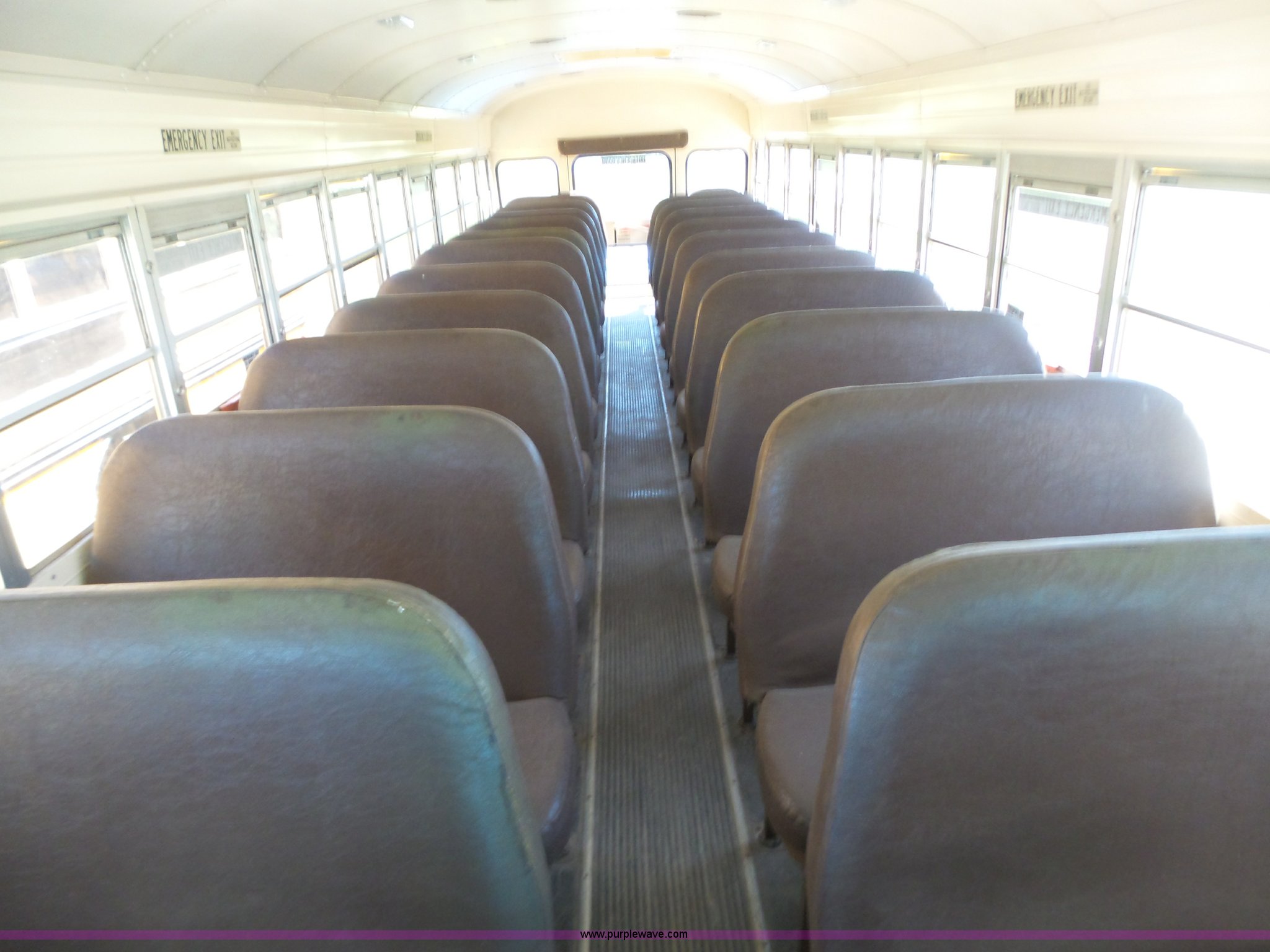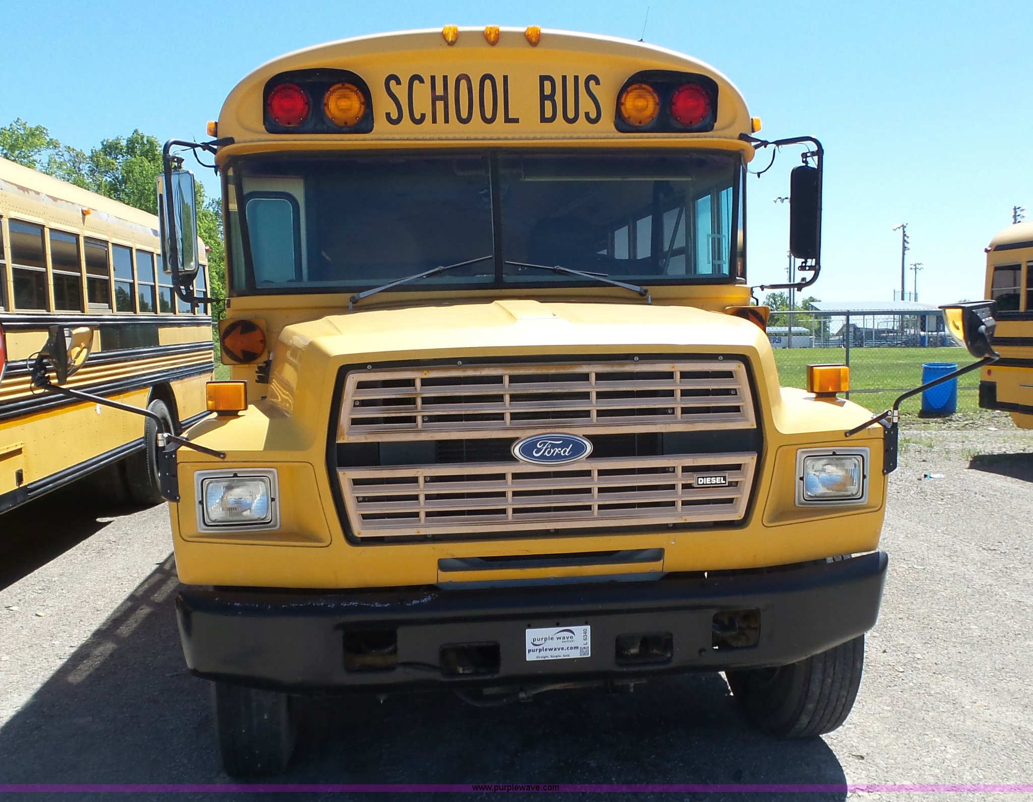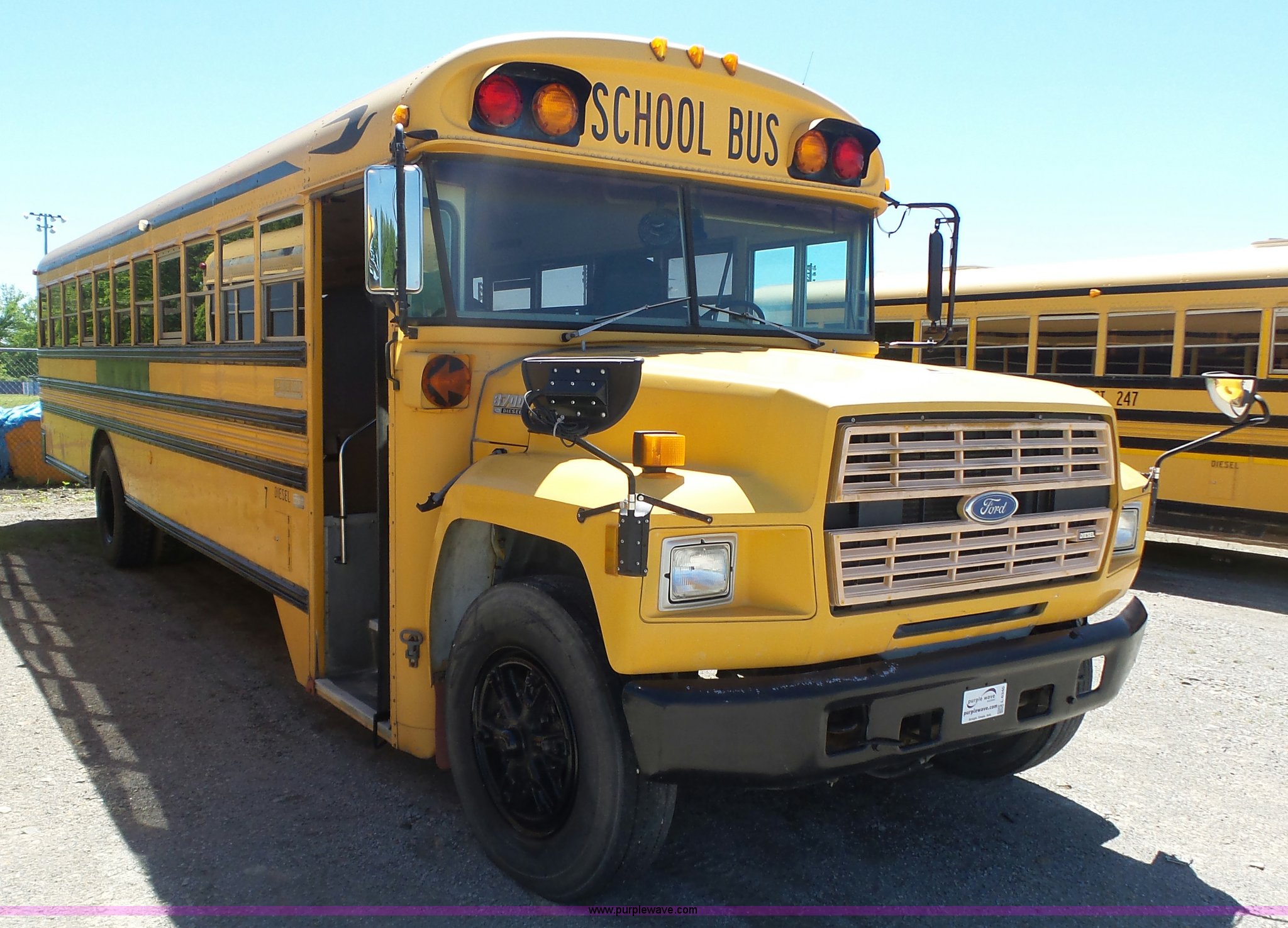 Purple Wave is selling a used Bus in Kansas. This item is a 1992 Ford B700 school bus with the following: 125,529 miles on odometer, Cummins ISB 5.9L L6 turbo diesel engine, Automatic transmission, Single axle, Heat, AM/FM/cassette, 65 passenger capacity, Ceiling, front, rear, and side emergency egress, Lighted stop sign, Block heater, Spring suspension, Hydraulic brakes, 10R22.5 front tires, 9.00-20 rear tires, GVWR 26,500 lbs