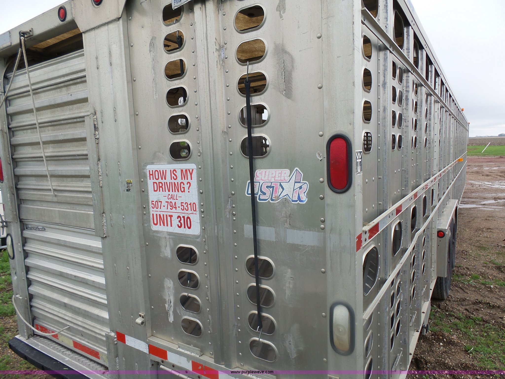 Purple Wave is selling a used Livestock Trailer in Minnesota. This item is a 2003 Wilson Super Star livestock trailer with the following: 40'L x 8'W, Double deck, 8'W interior, Rear roll up gate, Side load gate, Ground load, Dock bumper, Gooseneck hitch, Single leg landing gear, Aluminum construction, Spring suspension, Electric brakes, 10R17.5 tires, GVWR 25,000 lbs, GAWR 9,350 lbs