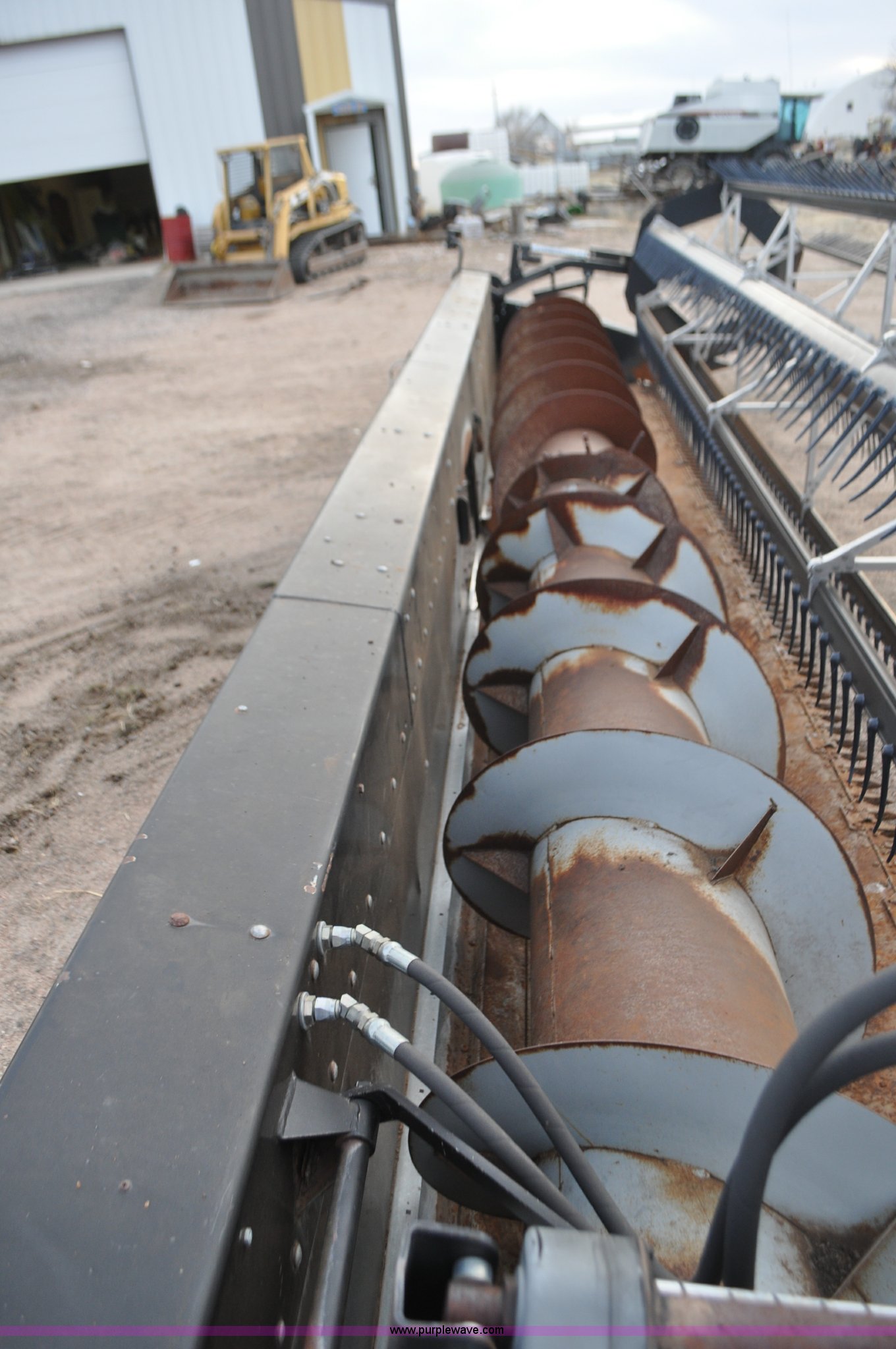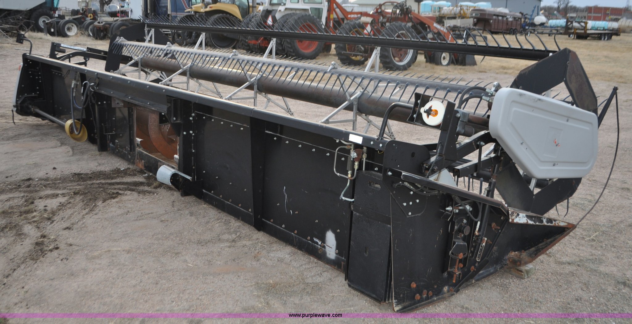 Purple Wave is selling a used Platform or Stripper Head in Colorado. This item is a AGCO 700 rigid head with the following: 25'W, Finger reel, Hydraulic reel height control, Electric fore/aft, Single driveline, Transport package, Holes in floor pan, Serial 25MJ84344G