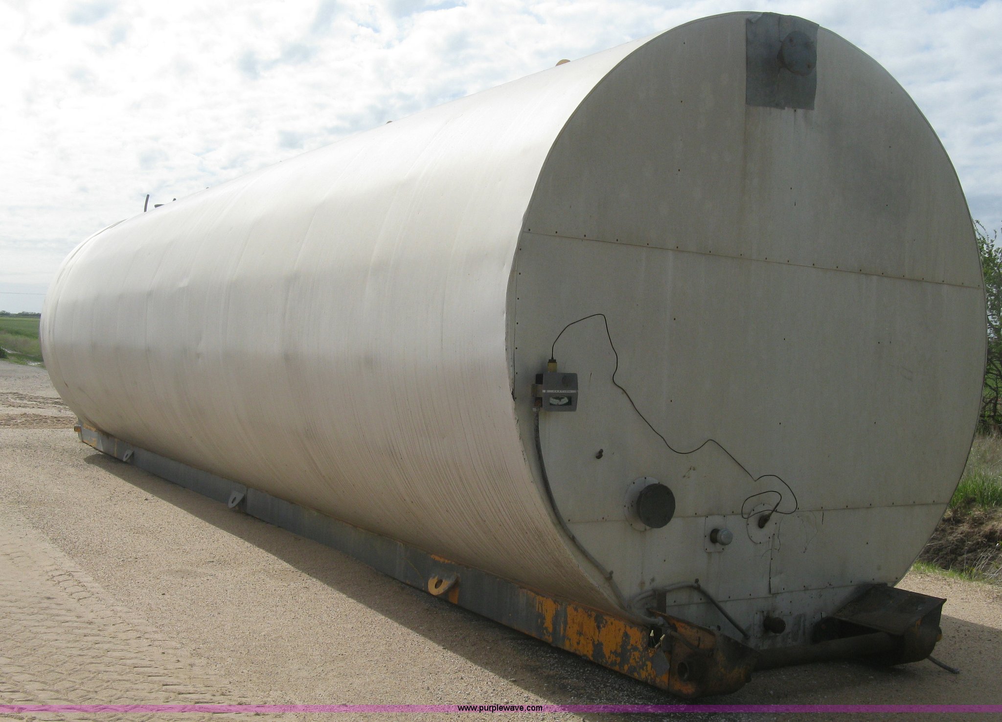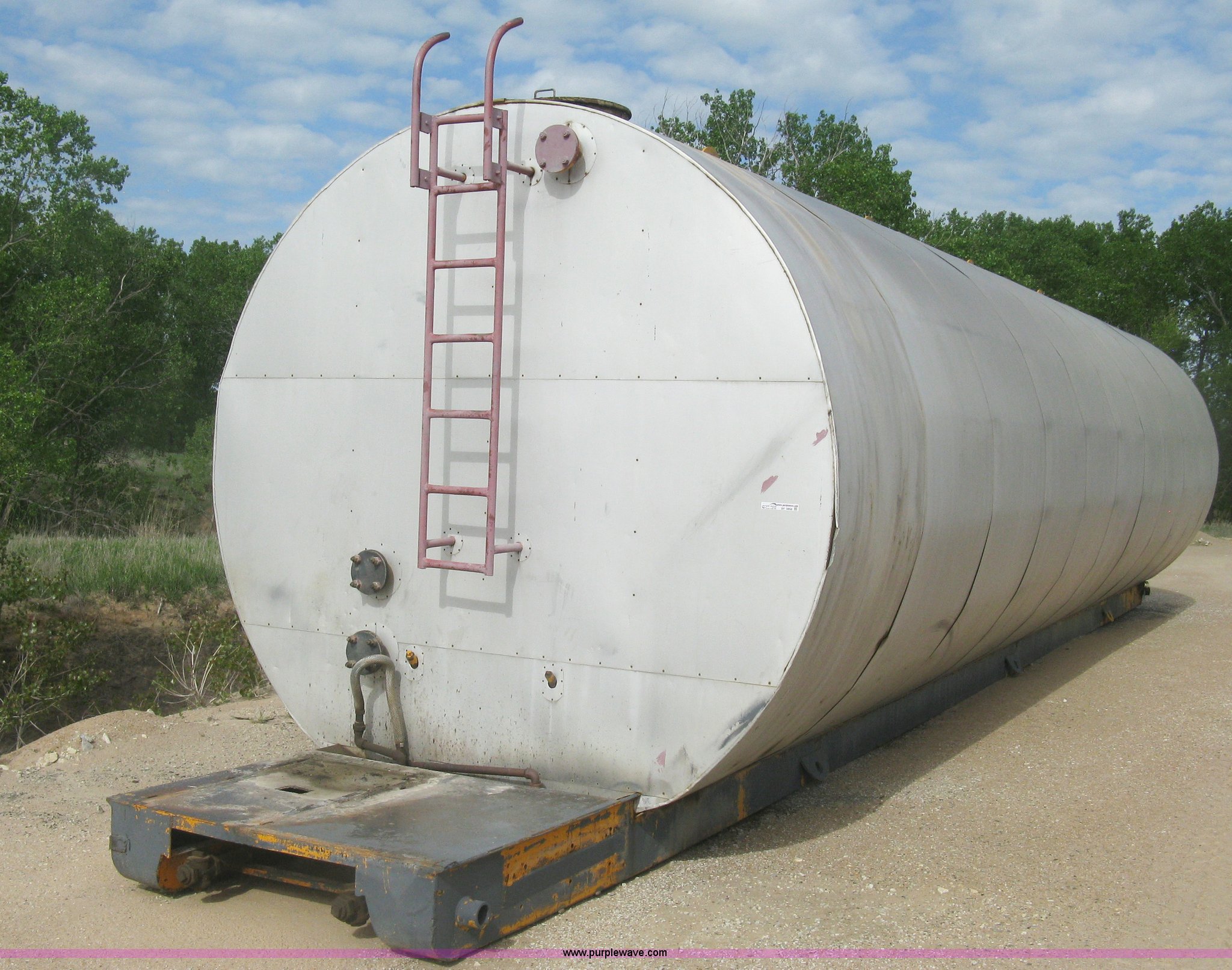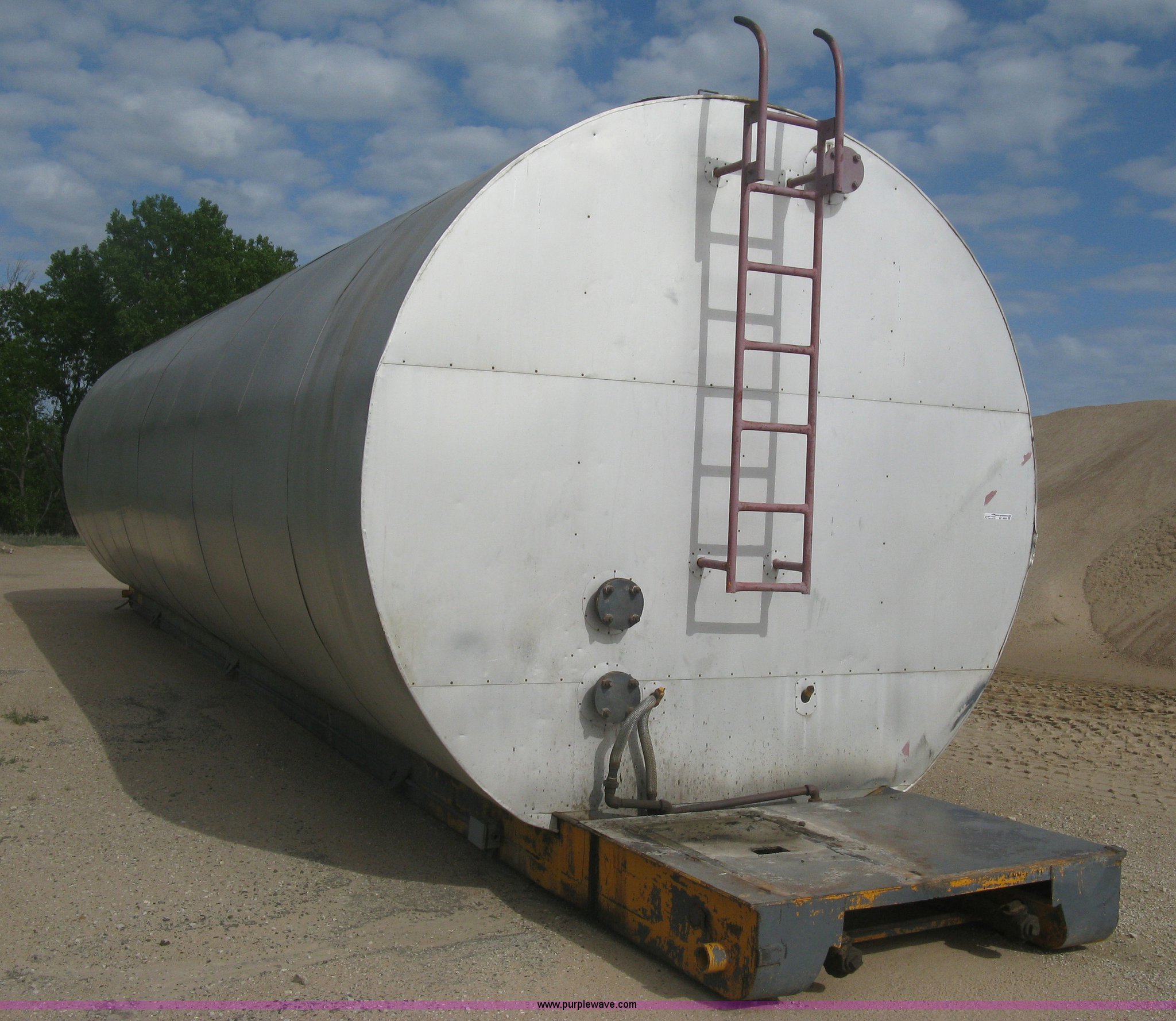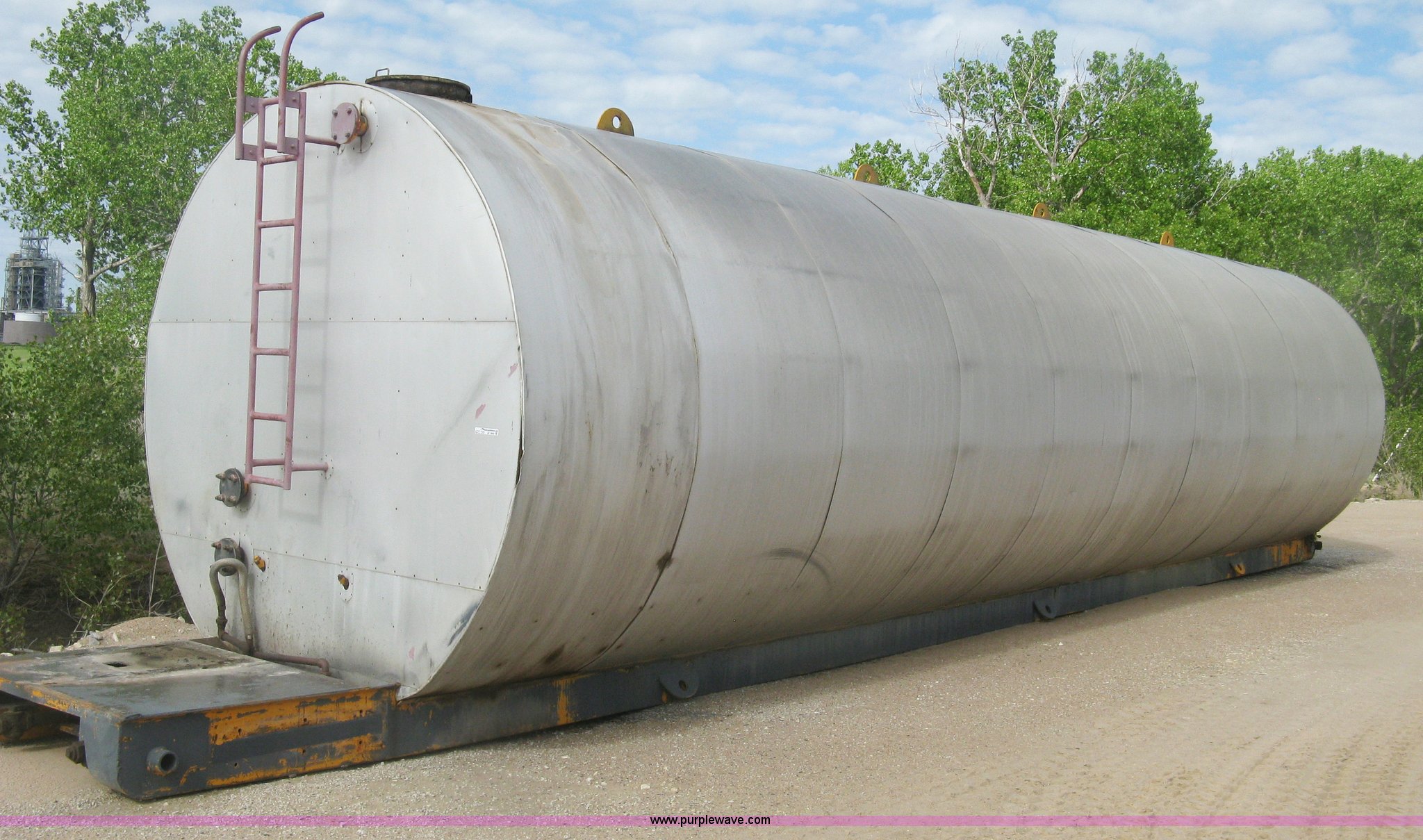 Purple Wave is selling a used Tanks in Kansas. This item is a Sundance asphalt oil tank with the following: 18,000 gallon rated capacity, 16,000 gallon capacity, Dual heating coil in bottom, Steel inner tank, Approx. 6" external insulation, Aluminum exterior sheeting, Partlow temperature controller, No temperature control valve, Side mount ladder, Lifting eyes, Approx. 45'L skid, Skid mounted, Previously contained PG64-22 oil, Removed from service in December 2015
