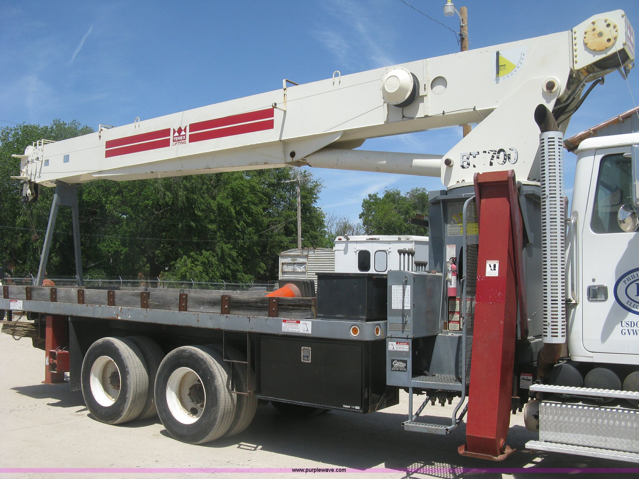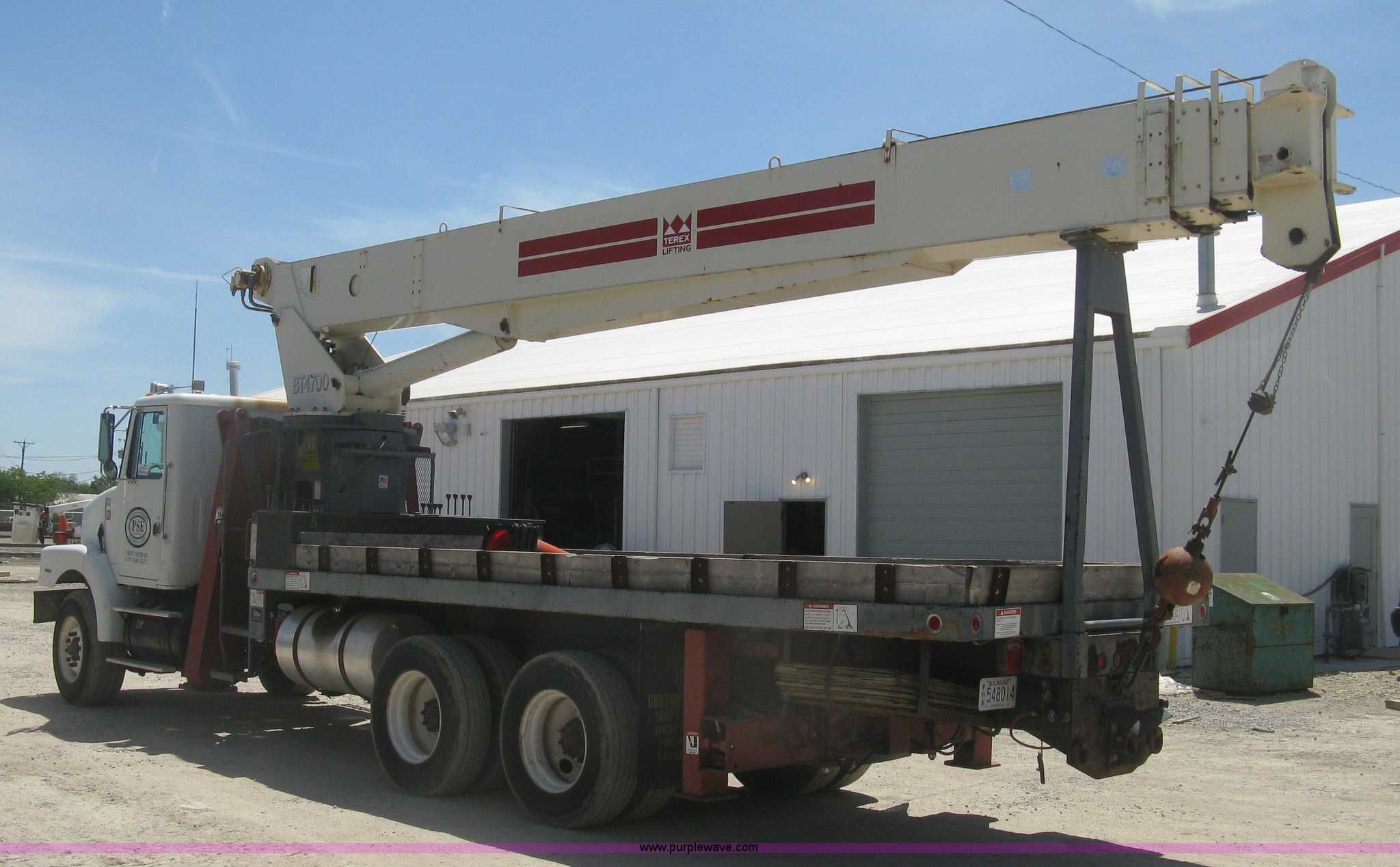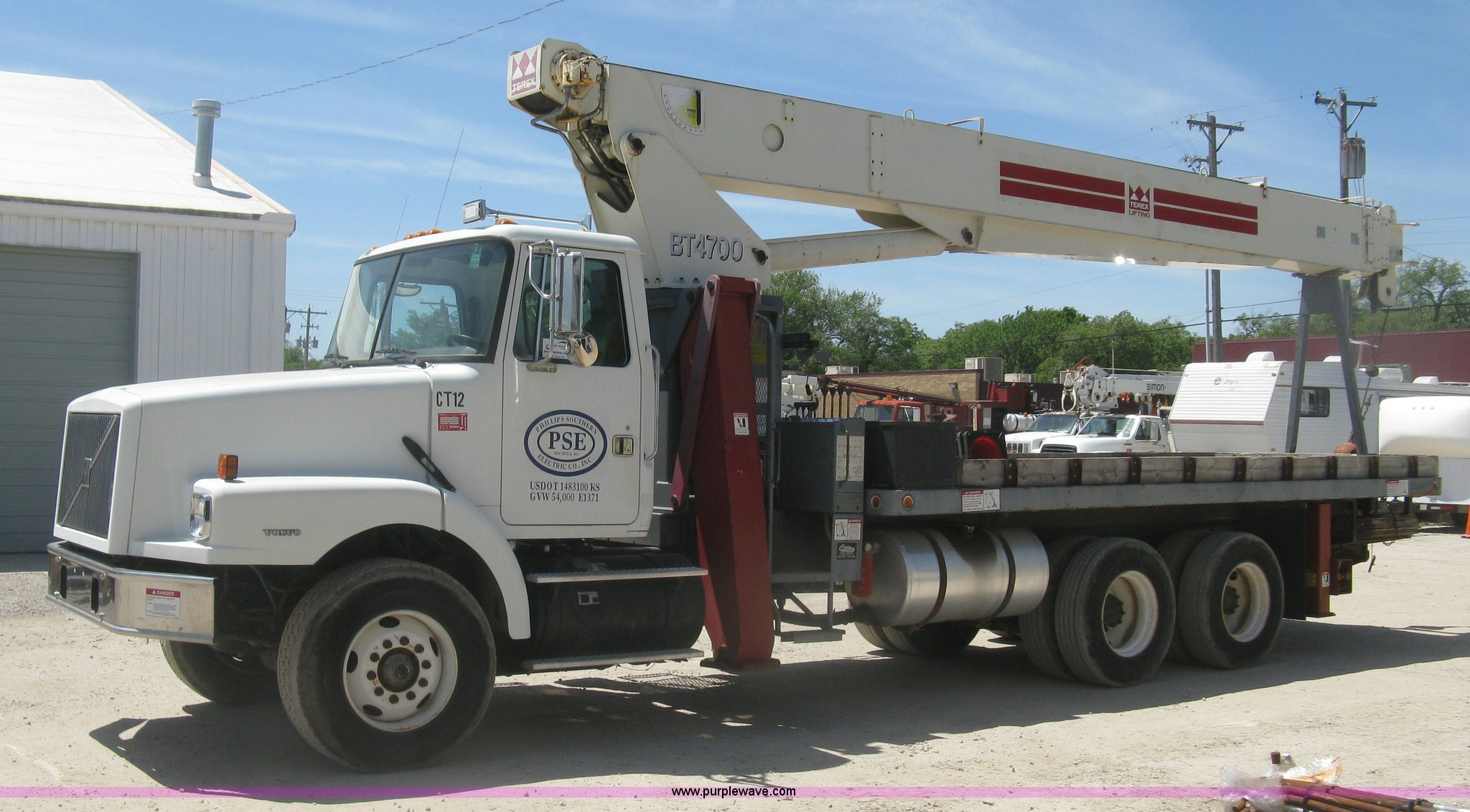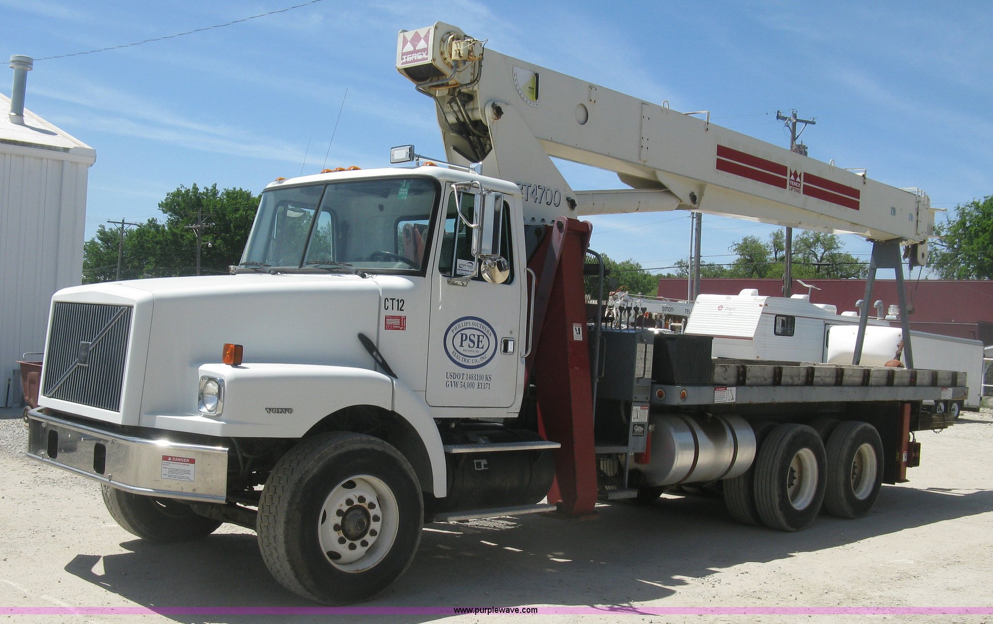Purple Wave is selling a used Crane Truck in Kansas. This item is a 2001 Volvo WG crane truck with the following: 27,234 miles on odometer, Cummins ISM 10.8L L6 turbo diesel engine, 305 HP, Eaton Fuller RT14609A nine speed manual transmission, Tandem axle, Locking differential, AC and heat, AM/FM, Cruise, Air suspension seat, Block heater, Trailer brake controller, PTO, 21'L flatbed, Pintle hitch, Trailer wiring, Gladhand couplers, Terex BT4700 crane, Serial 49008001155, 92' maximum lift height, 47,000 lbs maximum lift capacity, Boom rotation, Single and two block crane ball and hook, Telescopic boom, (4) outriggers, Certification valid through April 2017, Greer Co. MG586 monitor, Single fuel tank, Single exhaust stack, 3:730 gear ratio, 238" wheelbase, Spring suspension, Air brakes, 385/65R22.5 front tires, 11R22.5 rear tires, GVWR 58,740 lbs, FMCSA annual inspection April 2016, Boom rating/safety computer replaced 2015, Cable replaced 2015, View inspection reports, Contents are not included