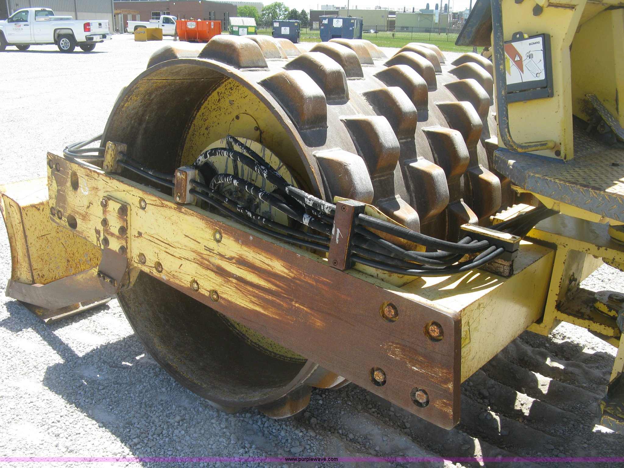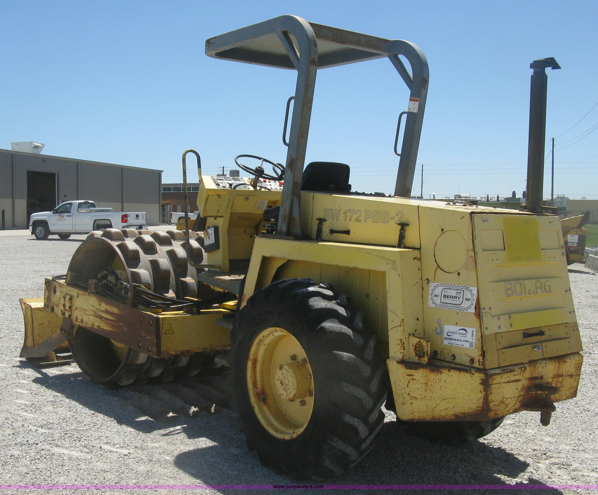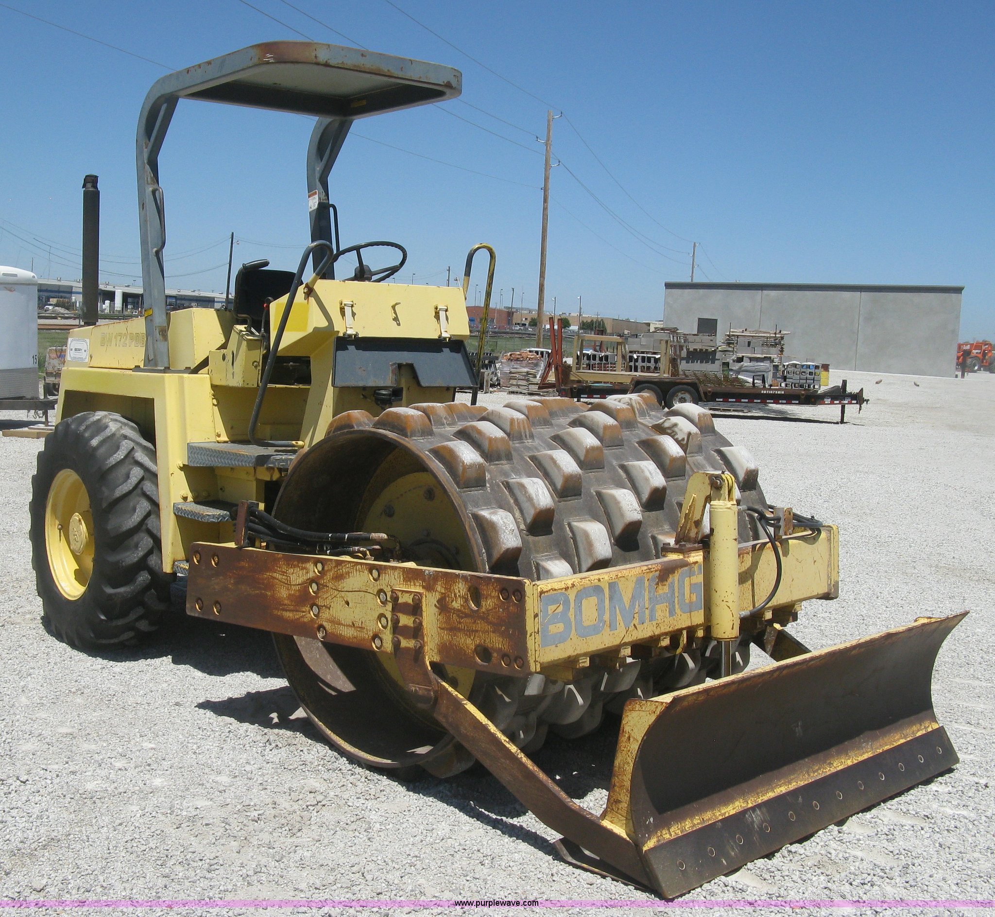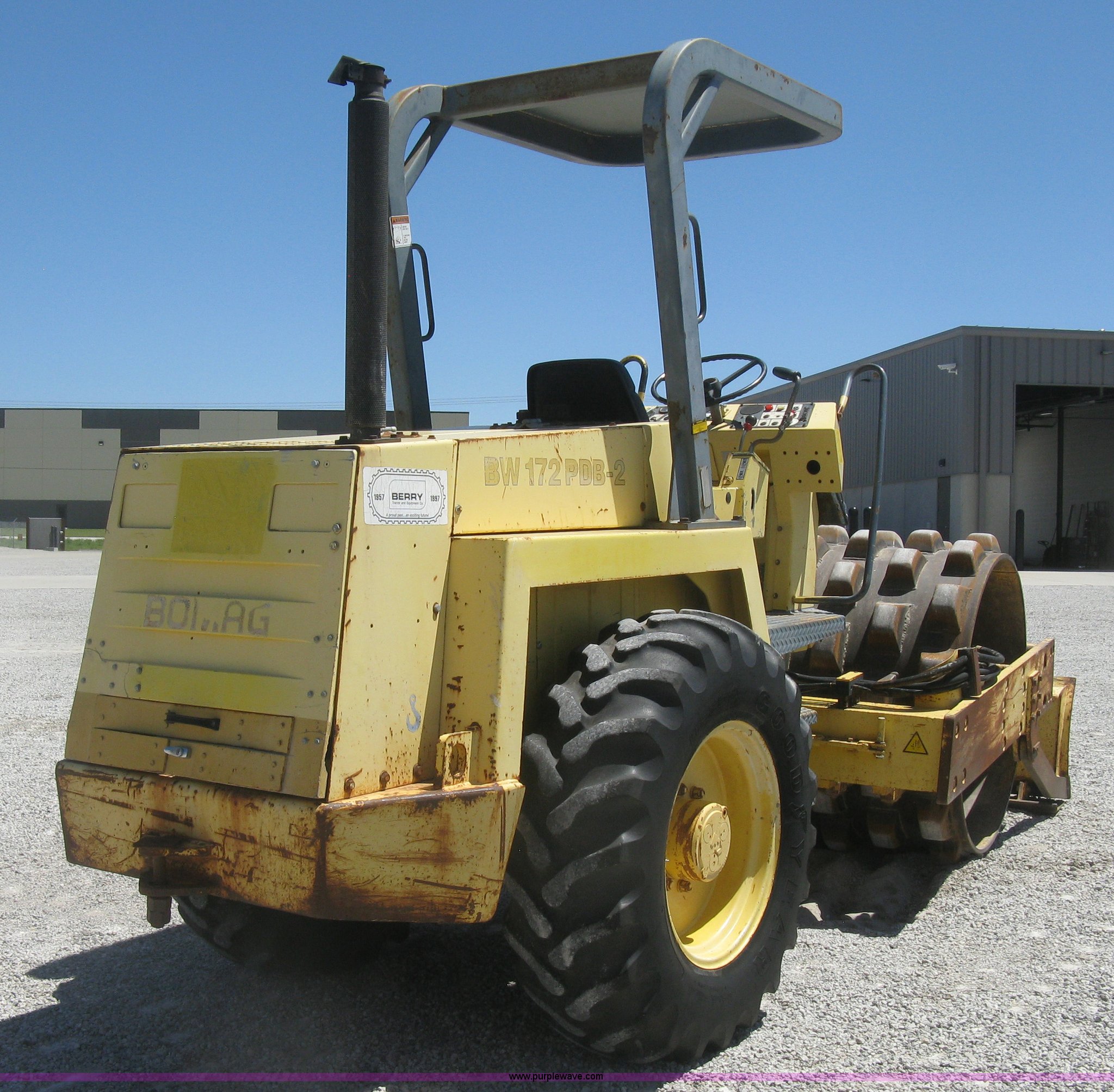 Purple Wave is selling a used Double Drum Roller Compactor in Kansas. This item is a Bomag BW172PDB-2 vibratory padfoot compactor with the following: 3,318 hours on meter, Deutz BF4L1011F four cylinder diesel engine, 53.5 kW, Hydrostatic transmission, OROPS, Vandal cover, 66"W x 47" diameter drums, Front and rear drum scrapers, 6'W front blade, 14.9-24 tires, Service records available, Serial 109520510205U