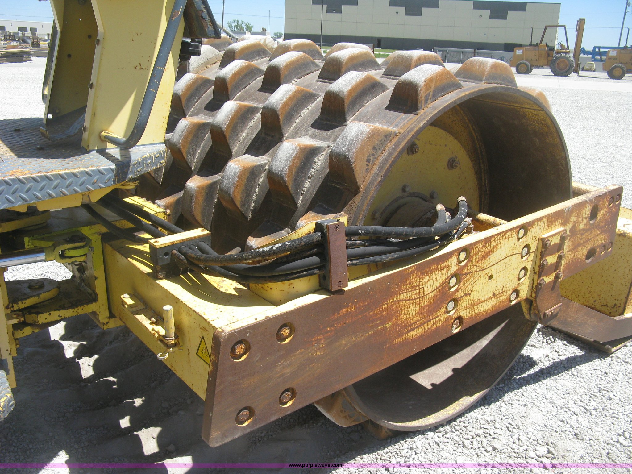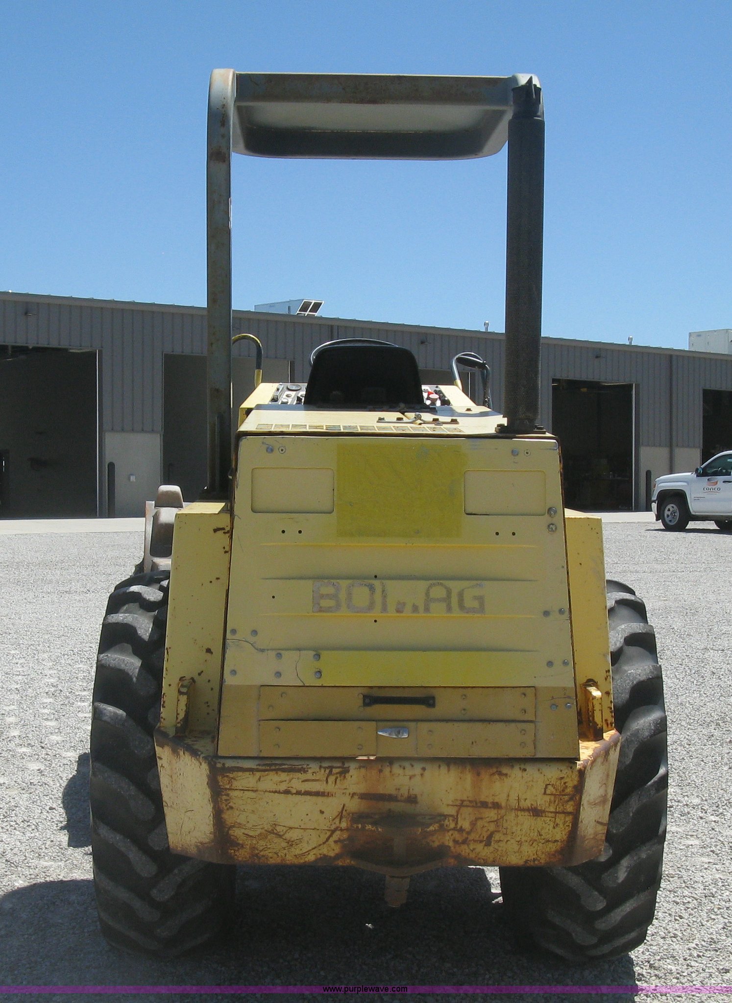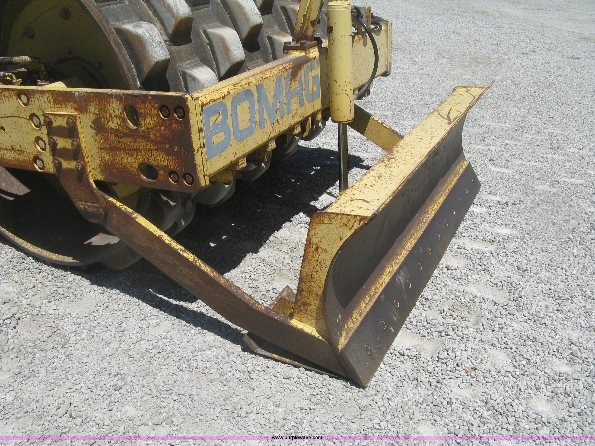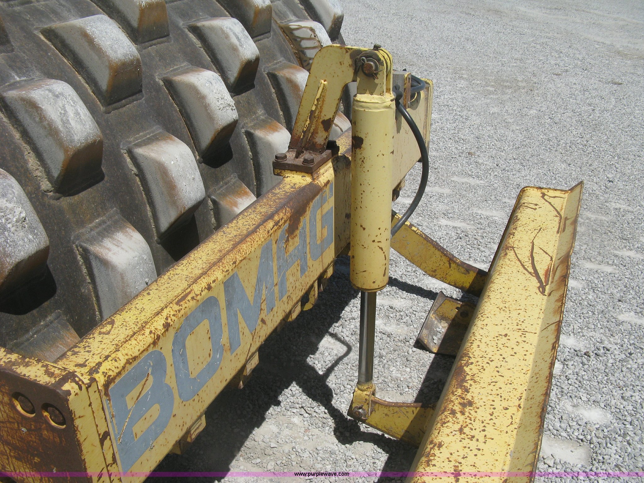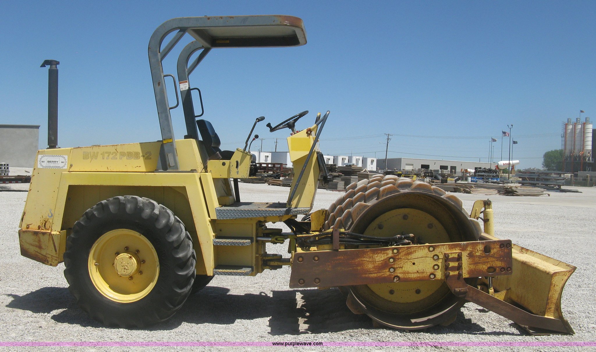 Purple Wave is selling a used Double Drum Roller Compactor in Kansas. This item is a Bomag BW172PDB-2 vibratory padfoot compactor with the following: 3,318 hours on meter, Deutz BF4L1011F four cylinder diesel engine, 53.5 kW, Hydrostatic transmission, OROPS, Vandal cover, 66"W x 47" diameter drums, Front and rear drum scrapers, 6'W front blade, 14.9-24 tires, Service records available, Serial 109520510205U