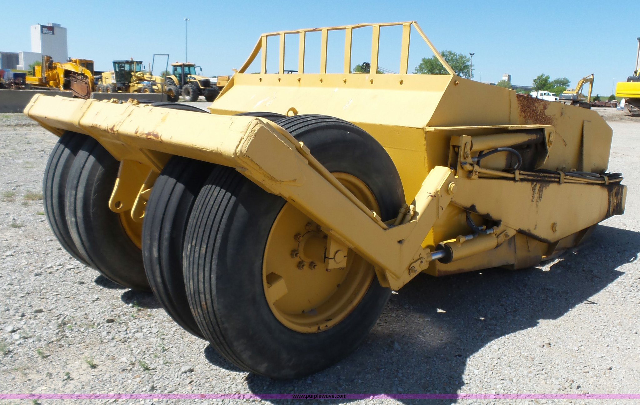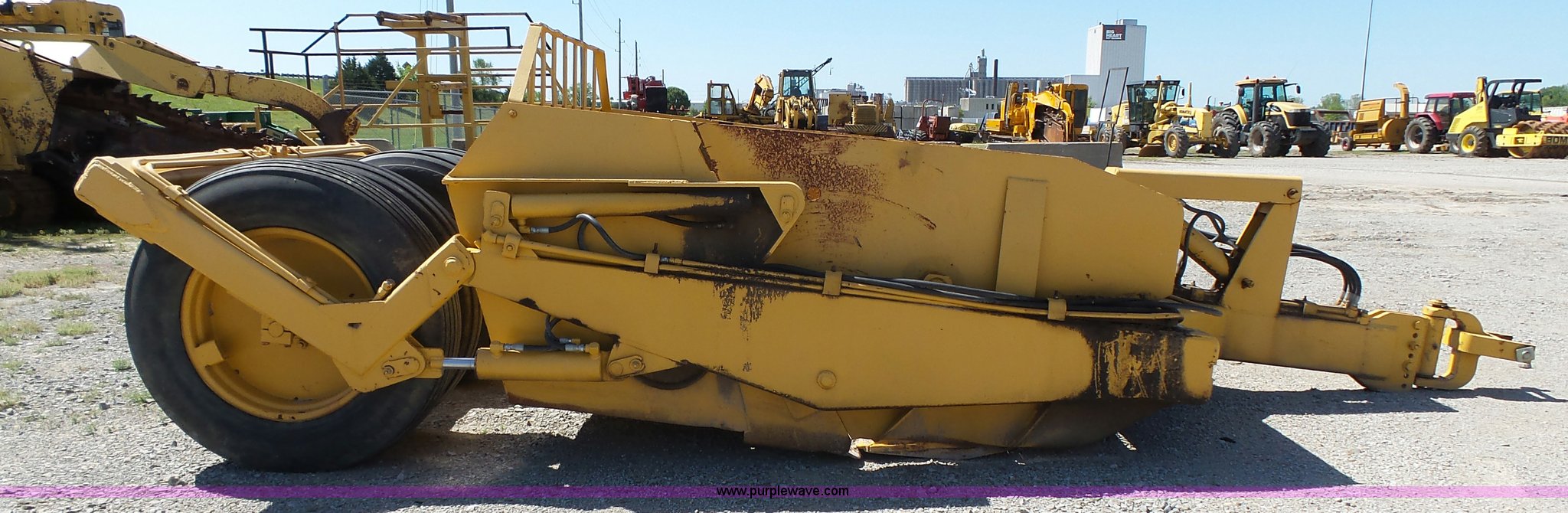 Purple Wave is selling a used Pull Type Scraper in Kansas. This item is a Reynolds 100 scraper with the following: 7' x 105" x 46" hopper dimensions, (4) hydraulic hoses, 11.25-28 tires, Serial 15606