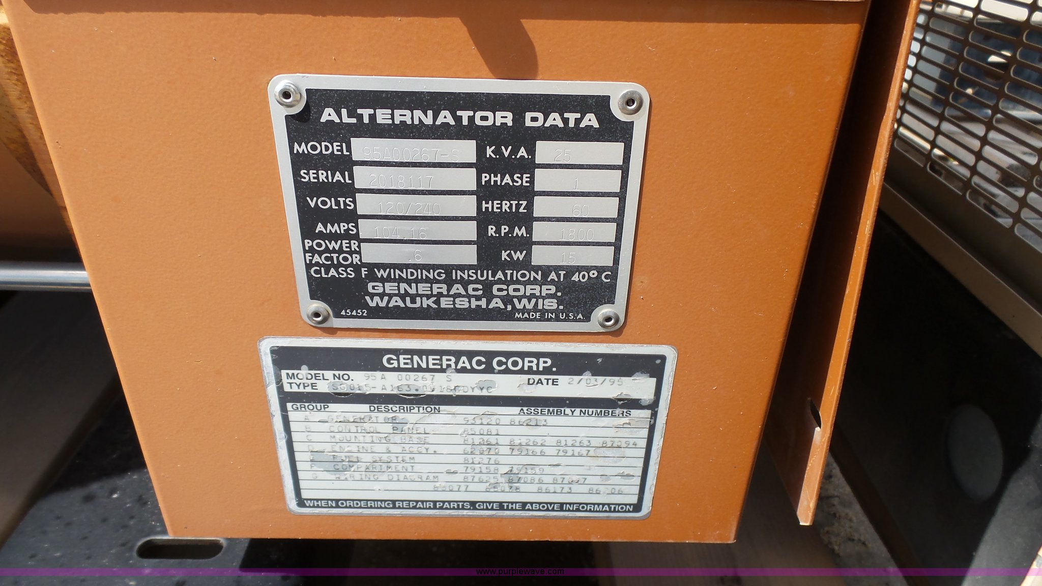 Purple Wave is selling a used Generator Set in Kansas. This item is a 1995 Generac 95A00267-S generator with the following: 330 hours on meter, Generack 3.0L four cylinder propane engine, Control panel, 25 kVA, 15 kW, Single phase, 120/240V, Skid mounted, Serial 2018117