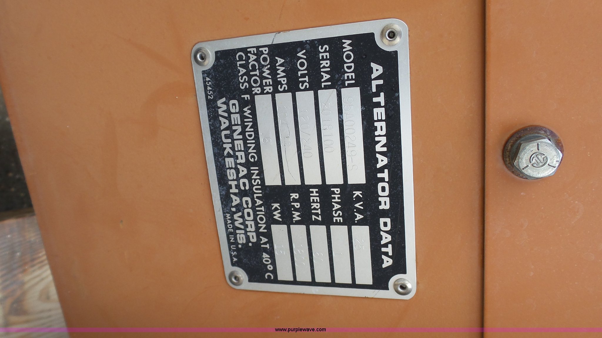 Purple Wave is selling a used Generator Set in Kansas. This item is a 1995 Generac 95A00249-S generator with the following: 606 hours on meter, Generac 3.0L four cylinder propane engine, 25 kVA, 15 kW, Single phase, 120/240V, Skid mounted, Serial 2018100