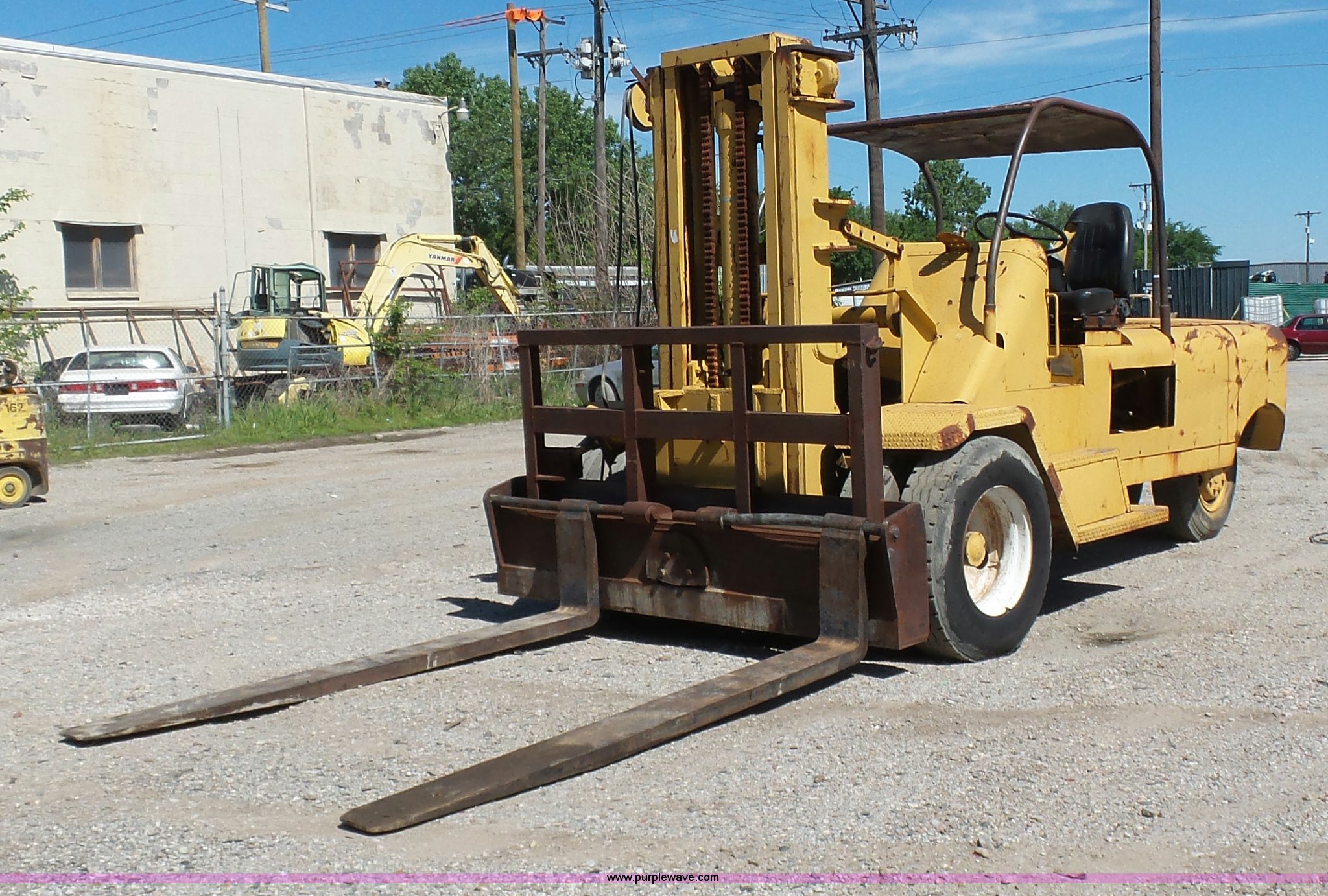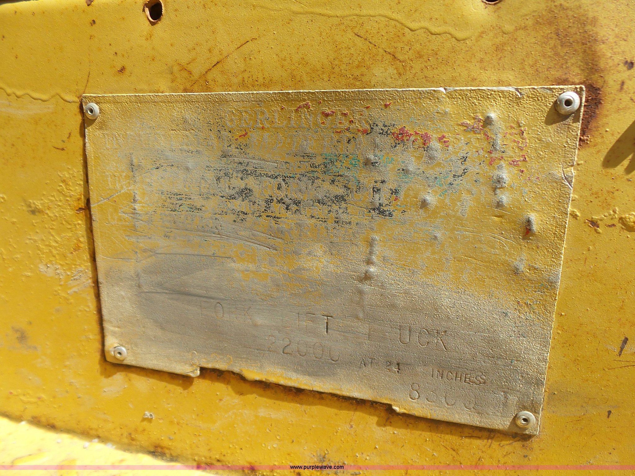 Purple Wave is selling a used Strt. Mast Rough Terr. Forklift in Oklahoma. This item is a Gerlinger G22 forklift with the following: 140 hours on meter, Eight cylinder gas engine, Manual transmission, 2F-2R gears, Canopy, 22,000 lbs maximum lift capacity, Two mast stages, Side shift, Mast tilt, 96" fork length, 11R22.5 front tires, 10.00-20 rear tires
