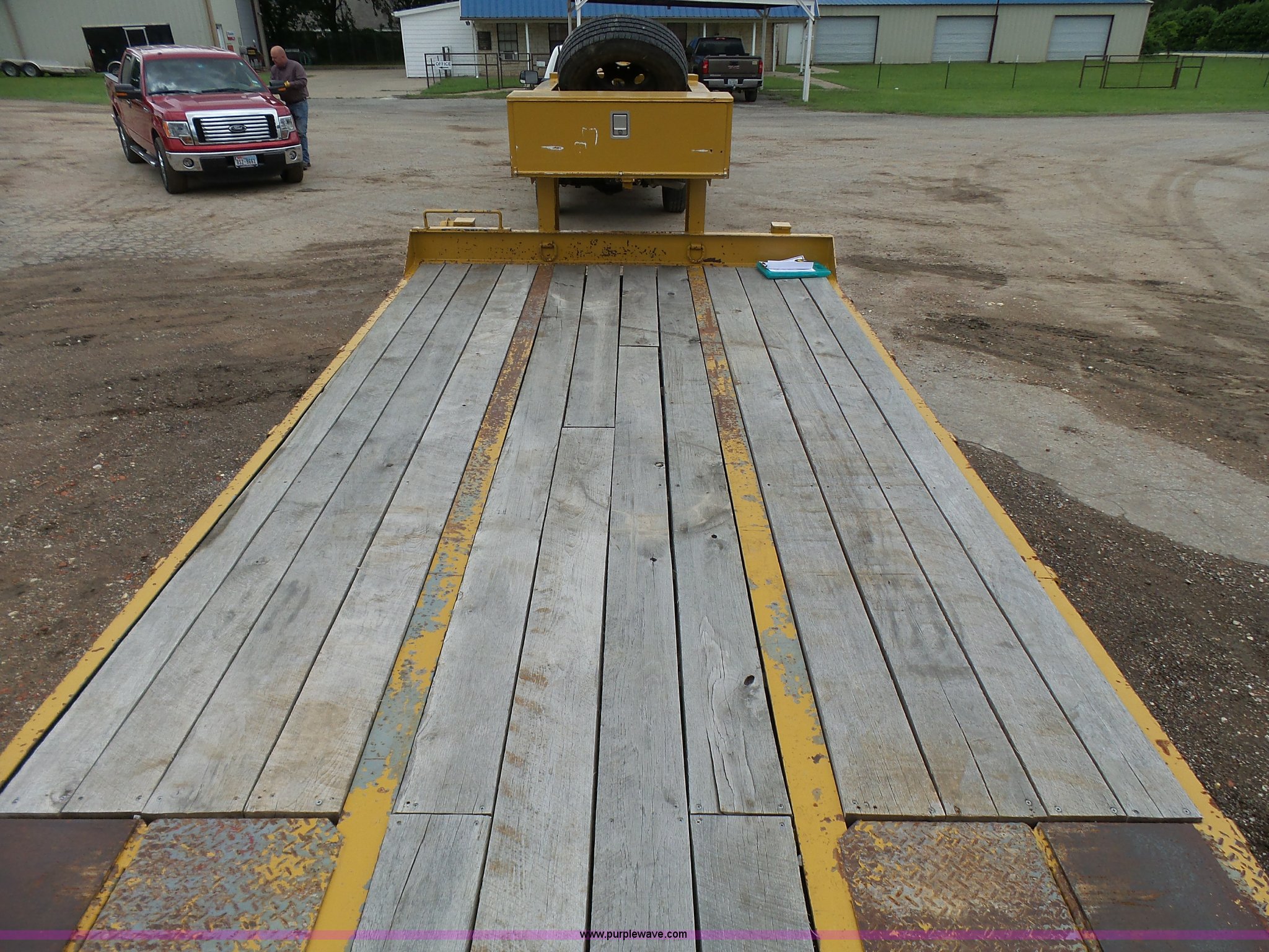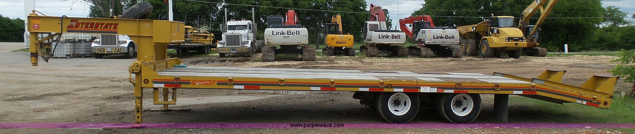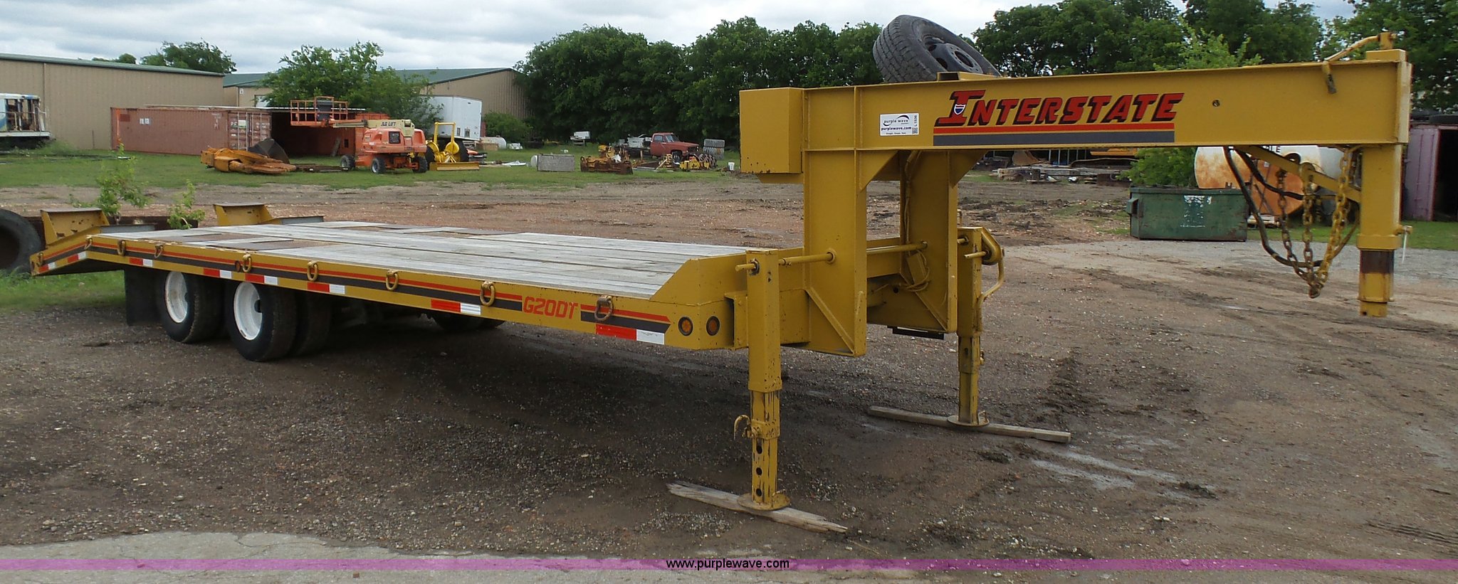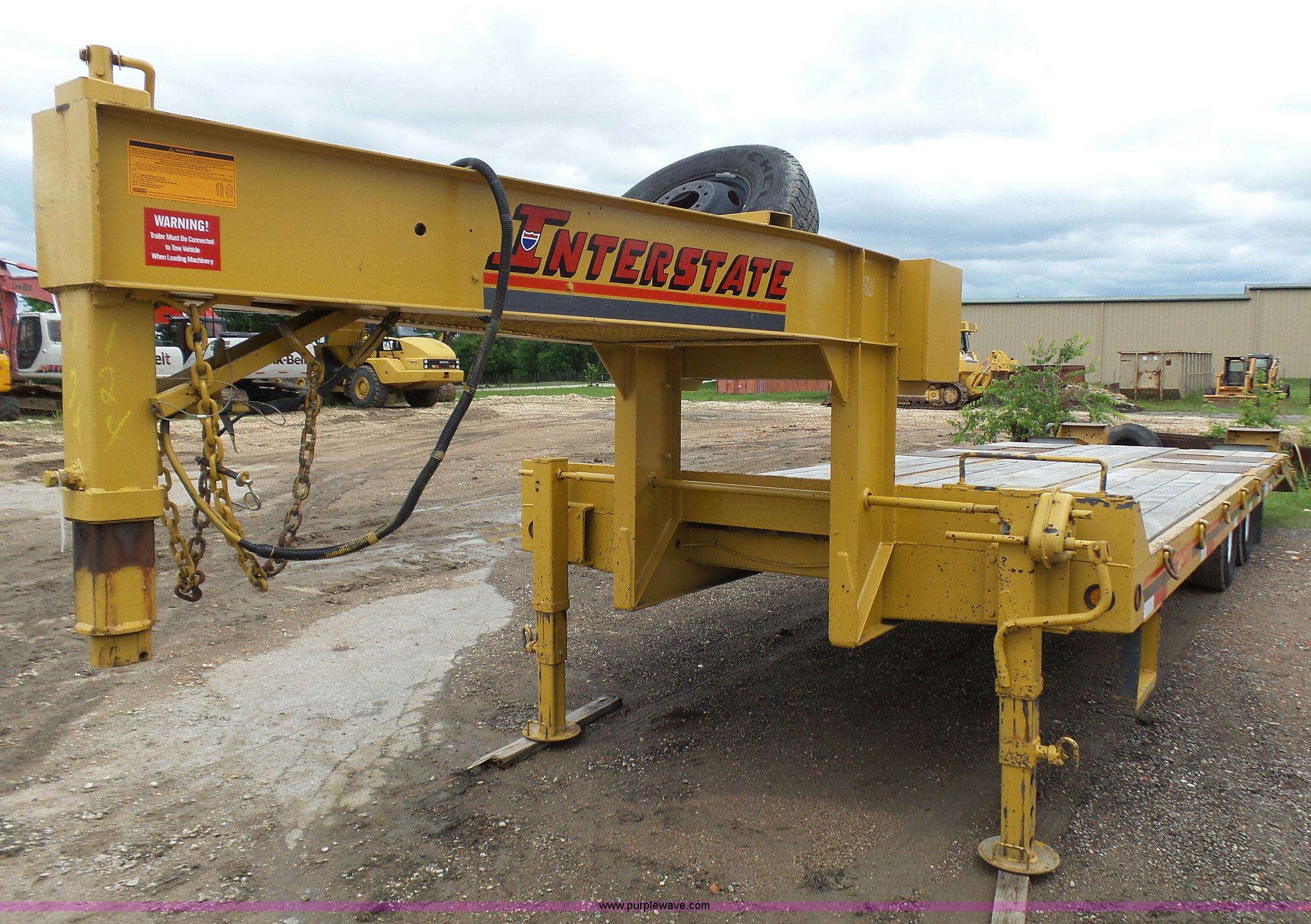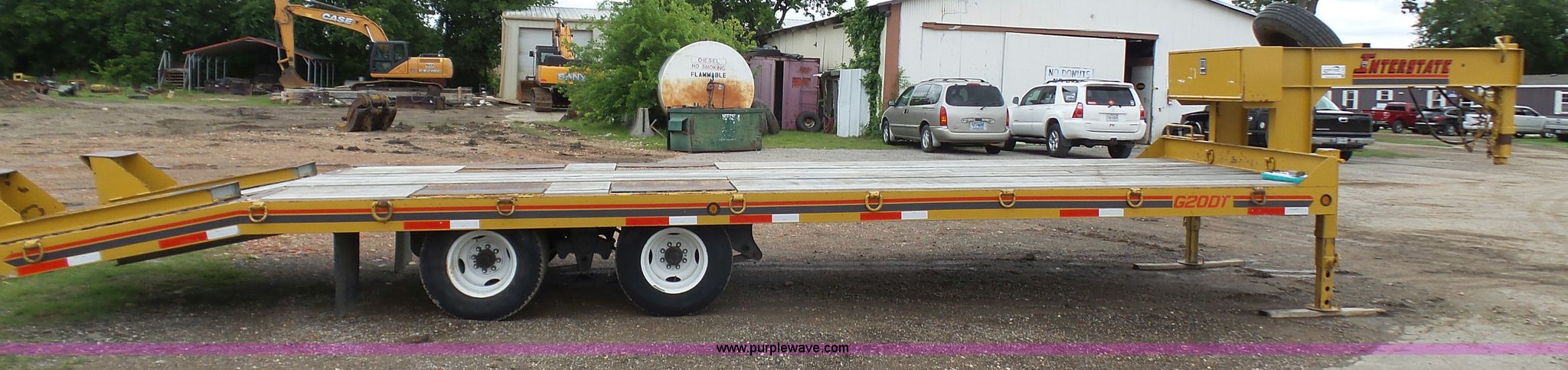 Purple Wave is selling a used Equip. Trailer in Texas. This item is a 2000 Interstate G20DT equipment trailer with the following: 37'L x 102"W overall, 24'L deck, 34" side height, 34" floor height, 5'L dovetail, 5'L ramps, (18) d-ring tie downs, Wood/steel deck, Toolbox, 2 5/16" gooseneck hitch, Dual leg two speed landing gear, Spring suspension, Electric brakes, Tandem axle, Steel wheels, LT235/85R16 tires, GAWR 20,000 lbs, Spare tire and wheel