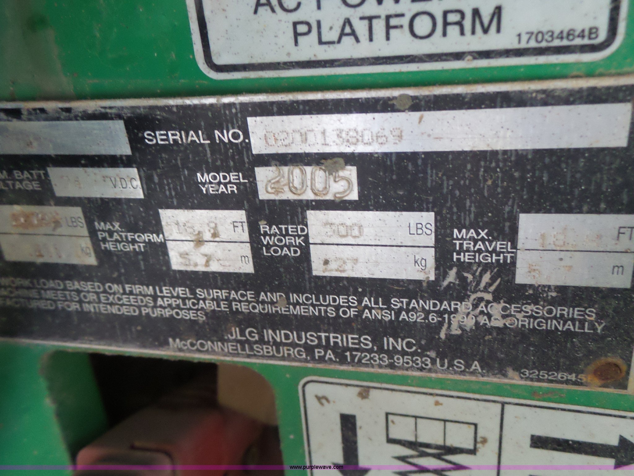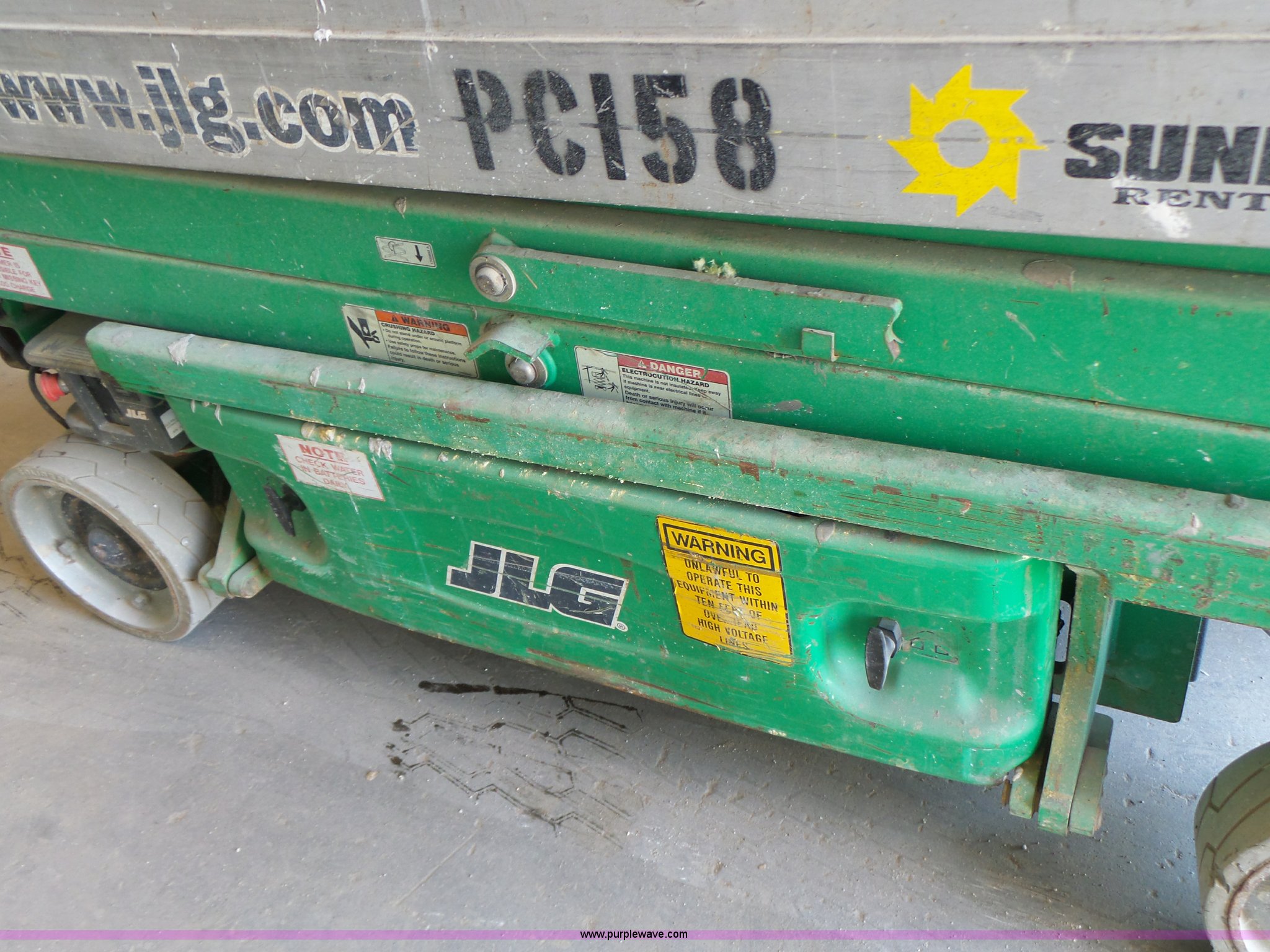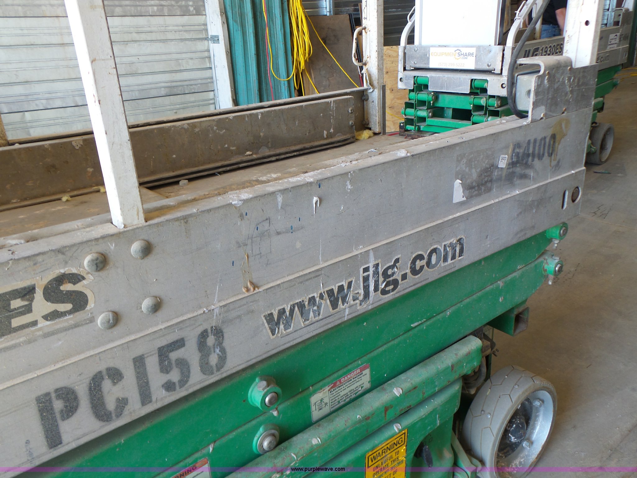 Purple Wave is selling a used Scissor or Vertical Lift in Missouri. This item is a 2005 JLG 1930ES scissor lift with the following: 382 hours on meter, Electric operation, 500 lbs maximum lift capacity, 19' maximum lift height, 62"L x 2.5'W platform, AC platform outlet, Manual platform extensions, Platform and ground controls, Safety alarm, 12.5 x 4 solid non-marking tires, Serial 0200138069, Unit# PC158