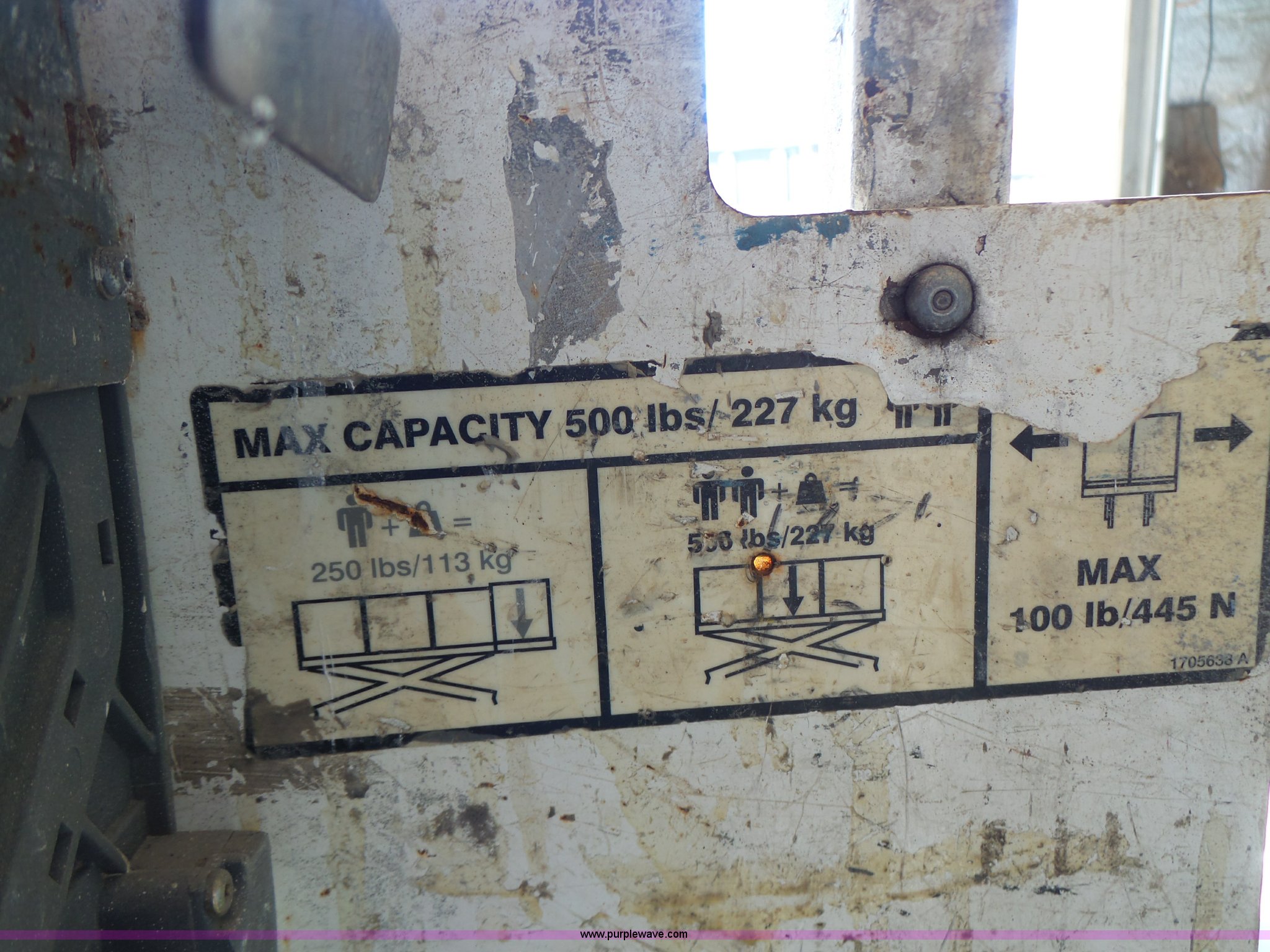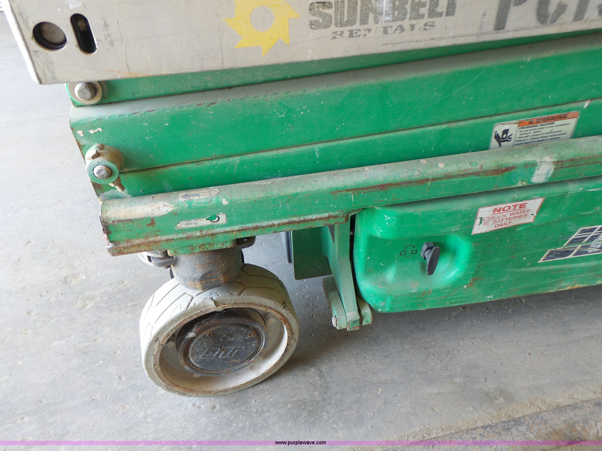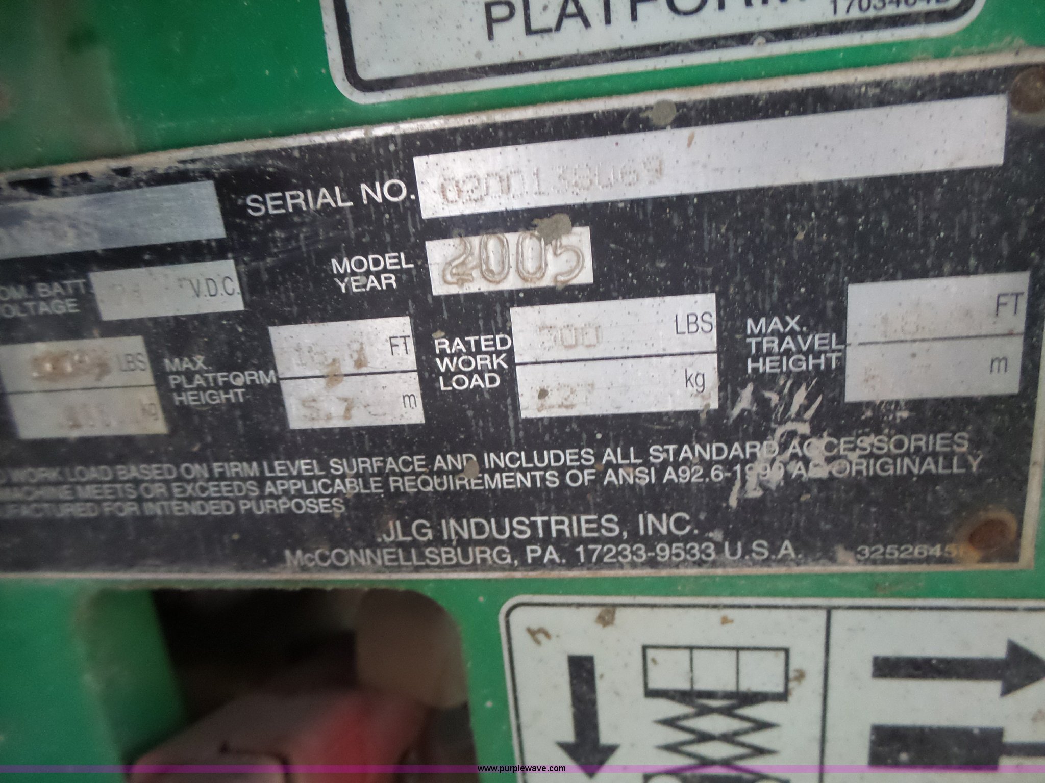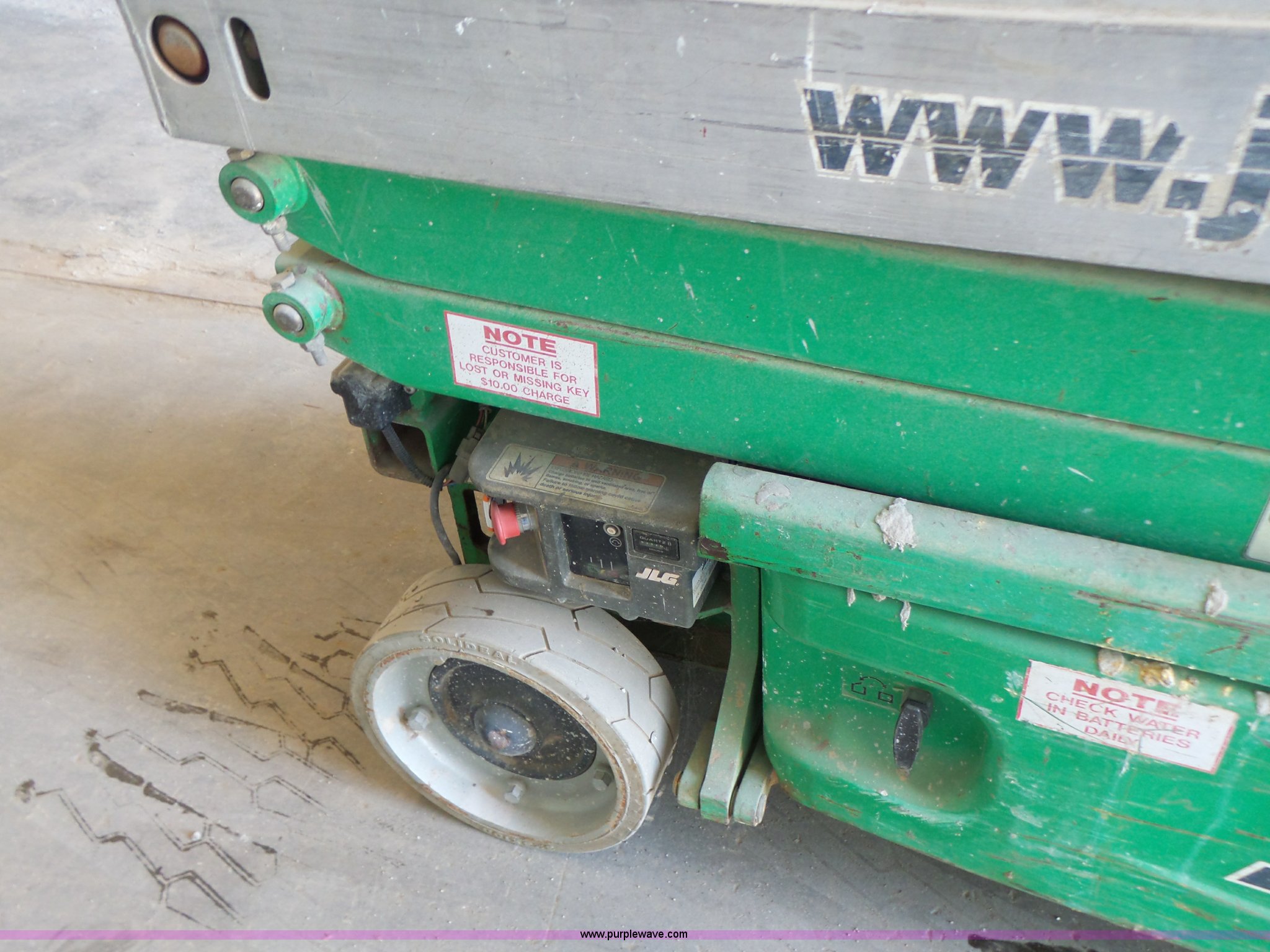 Purple Wave is selling a used Scissor or Vertical Lift in Missouri. This item is a 2005 JLG 1930ES scissor lift with the following: 382 hours on meter, Electric operation, 500 lbs maximum lift capacity, 19' maximum lift height, 62"L x 2.5'W platform, AC platform outlet, Manual platform extensions, Platform and ground controls, Safety alarm, 12.5 x 4 solid non-marking tires, Serial 0200138069, Unit# PC158
