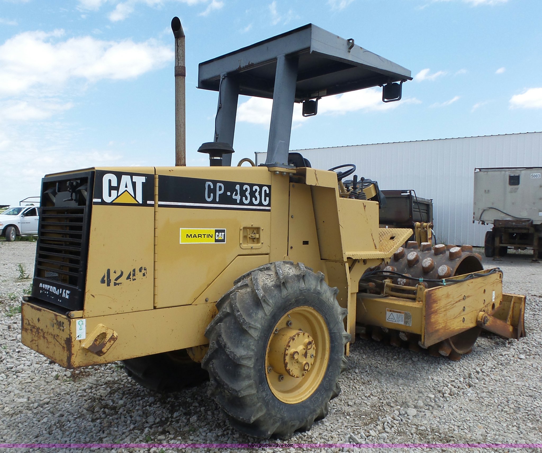 Purple Wave is selling a used Single Drum Roller Compactor in Kansas. This item is a 2000 Caterpillar CP-433C vibratory padfoot roller with the following: Caterpillar 3054 3.9L four cylinder diesel engine, Hydrostatic transmission, OROPS, Vandal cover, Work lights, Double vibratory system, 66"W x 42" diameter drum, Front drum scraper, 83"W front blade, 14.9-24 rear tires, 14,600 lbs. base operating weight, Serial 2JM01040