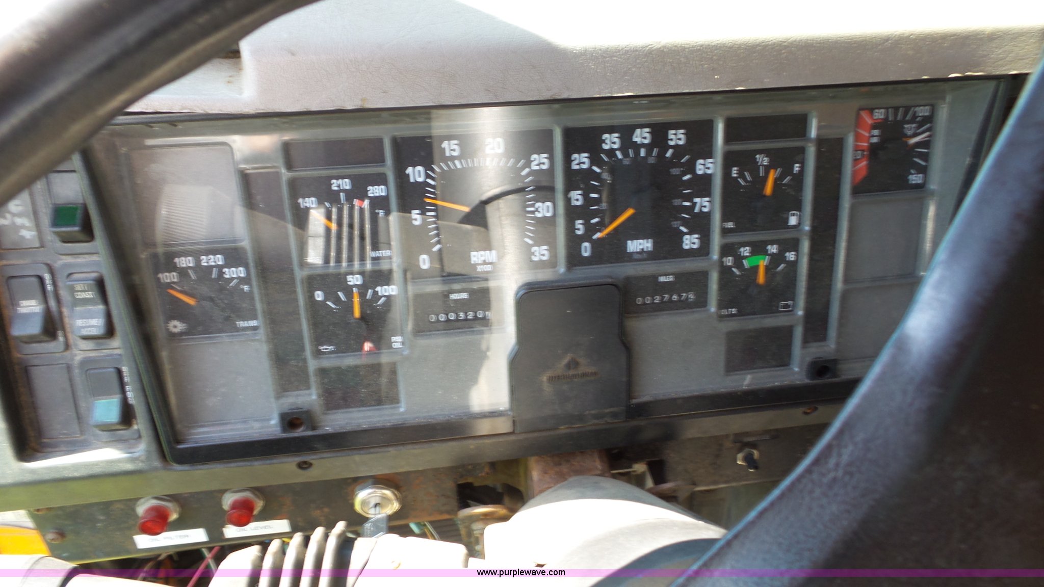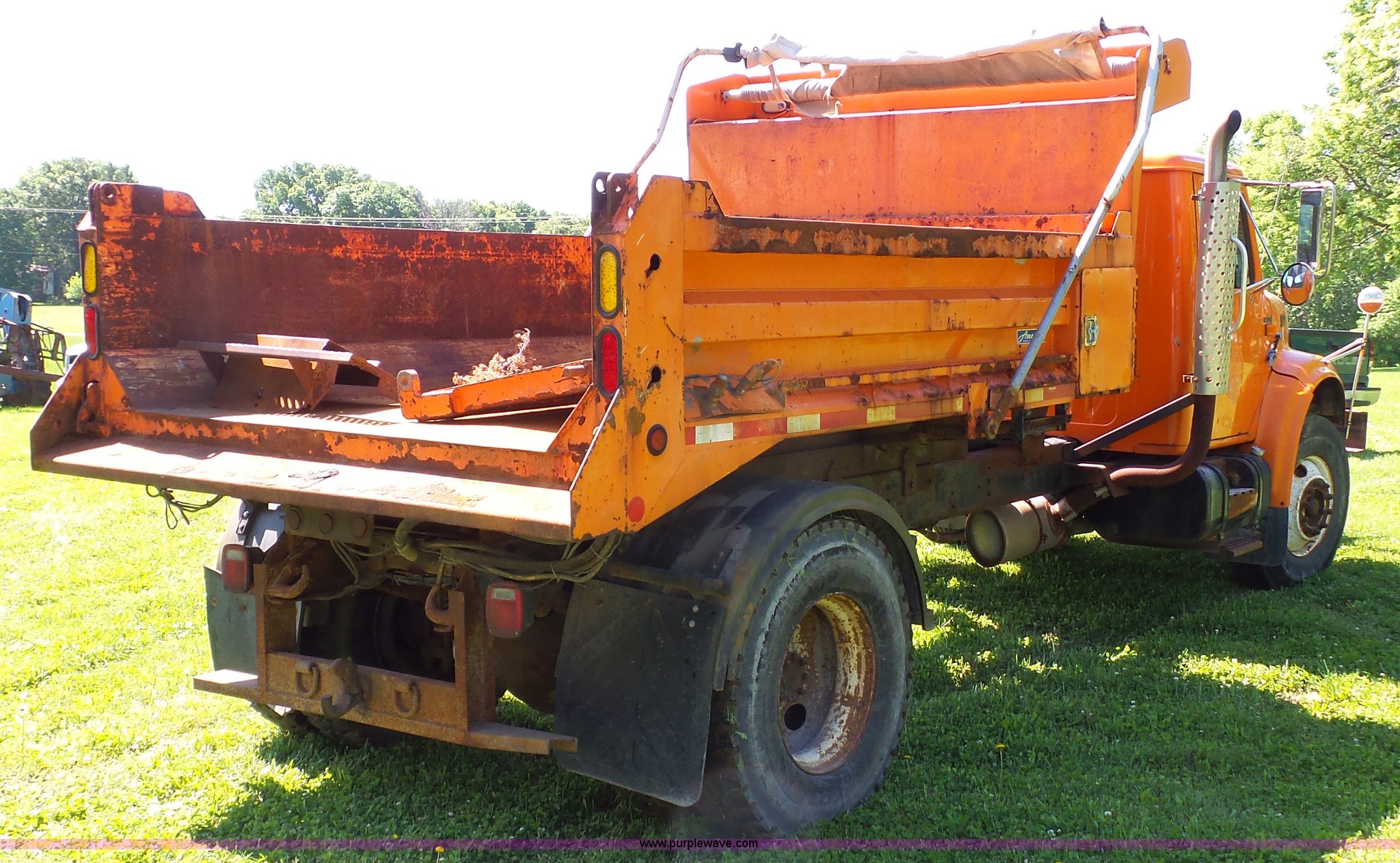 Purple Wave is selling a used Construction Dump Truck in Missouri. This item is a 1999 International 4900 dump truck with the following: 2,767 miles on odometer, Actual miles unknown, 320 hours on meter, International DT466 7.6L L6 turbo diesel engine, Serial XH667813, Automatic transmission, Single axle, AC and heat, AM/FM, Air suspension seat, Block heater, Front mounted PTO, In-cab snow plow controls, American WXL-11 steel dump bed, 11'L x 8'W, 24" side height, Seven cubic yard capacity, Single ram hoist, Air operated end gate, Roll-over tarp, Toolbox, Auxiliary hydraulic couplers, Single fuel tank, Pintle hitch, Trailer wiring, 206" wheelbase, Air brakes, 12R22.5 tires, GVWR 35,000 lbs, FAWR 14,000 lbs, RAWR 21,000 lbs