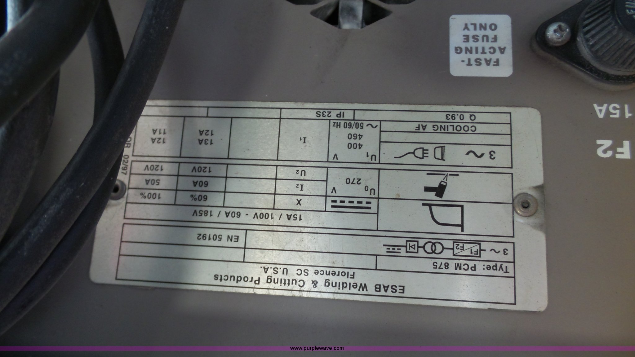 Purple Wave is selling a used Hand Held Plasma Cutter in Missouri. This item is a ESAA PCM-875 plasma cutter with the following: Three phase, 120V, Gun, Cord, Serial PE-1840095