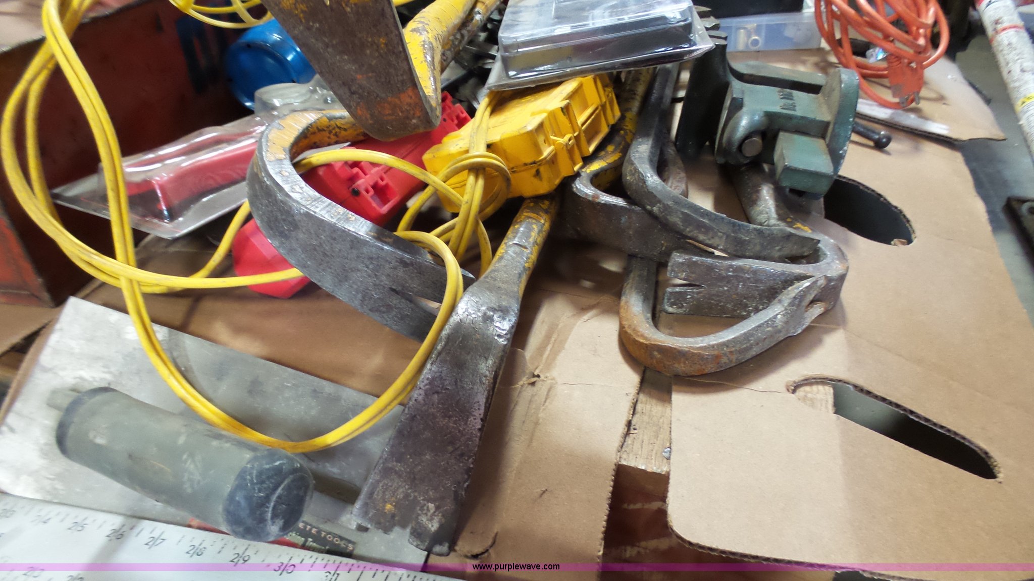 Purple Wave is selling a used Tools in Missouri. This item is a Shop tools with the following: (3) fans, Tarps, Pry bars, Hammers, Handy Man jacks, Wrenches, Ratchets, (2) tool cases, Tire cover, Unknown operating condition