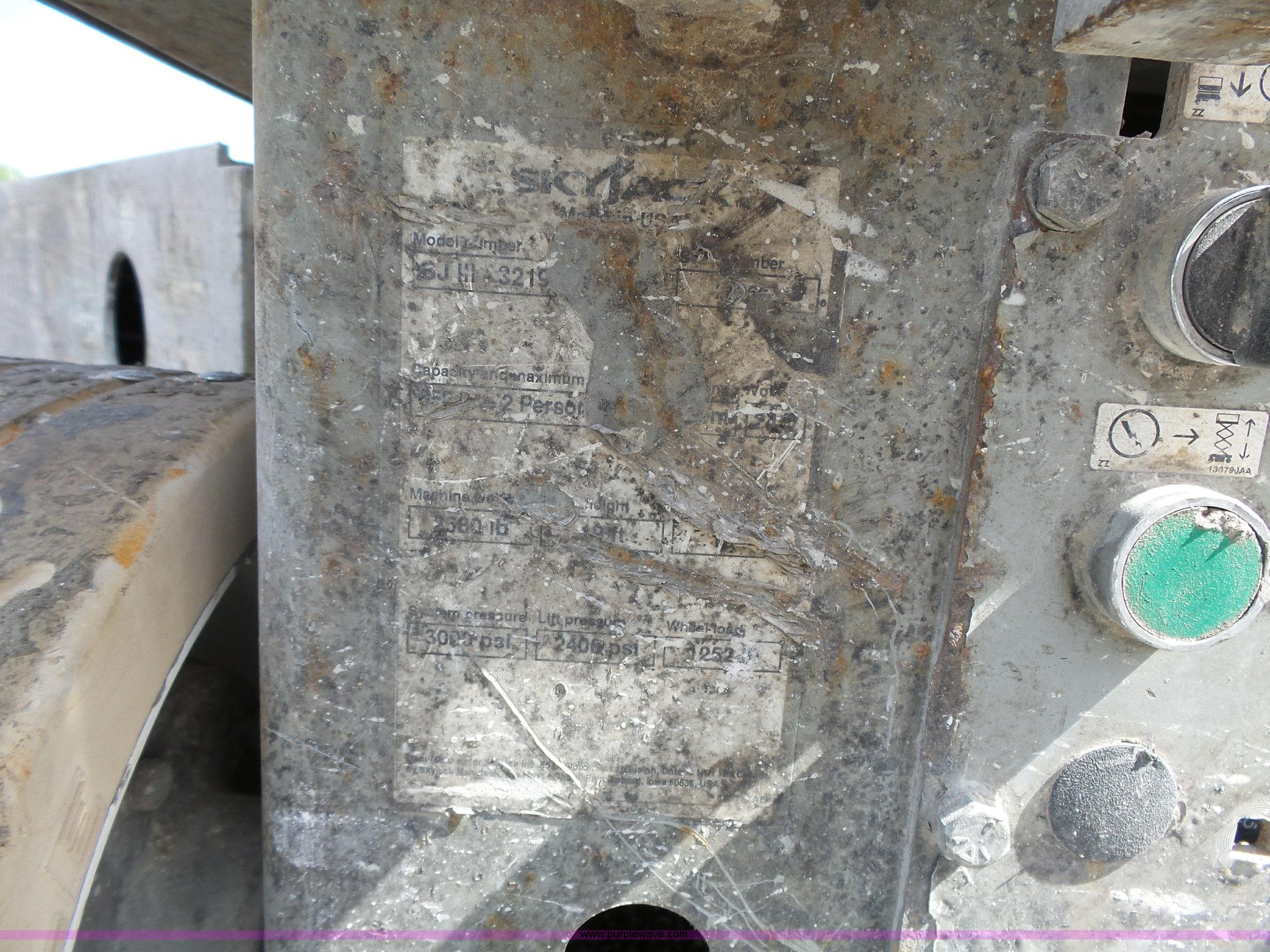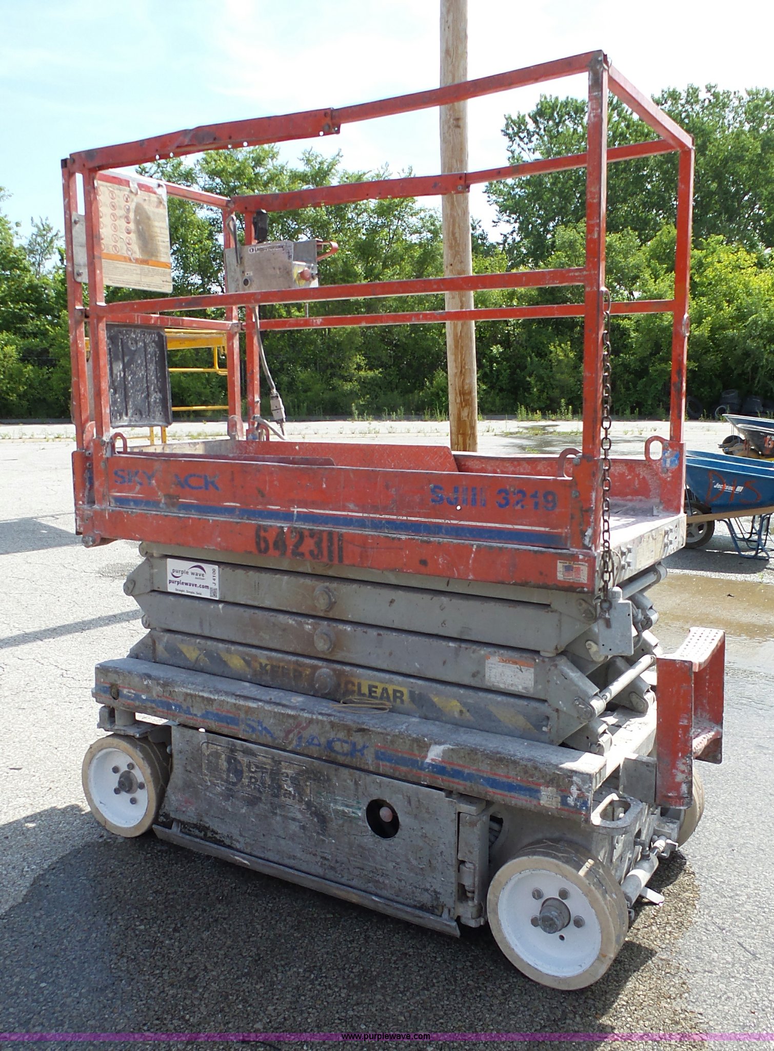 Purple Wave is selling a used Scissor or Vertical Lift in Missouri. This item is a Skyjack SJIII 3219 scissor lift with the following: 246 hours on meter, 19' platform height, 550 lbs capacity, Solid tires, 24V battery charger