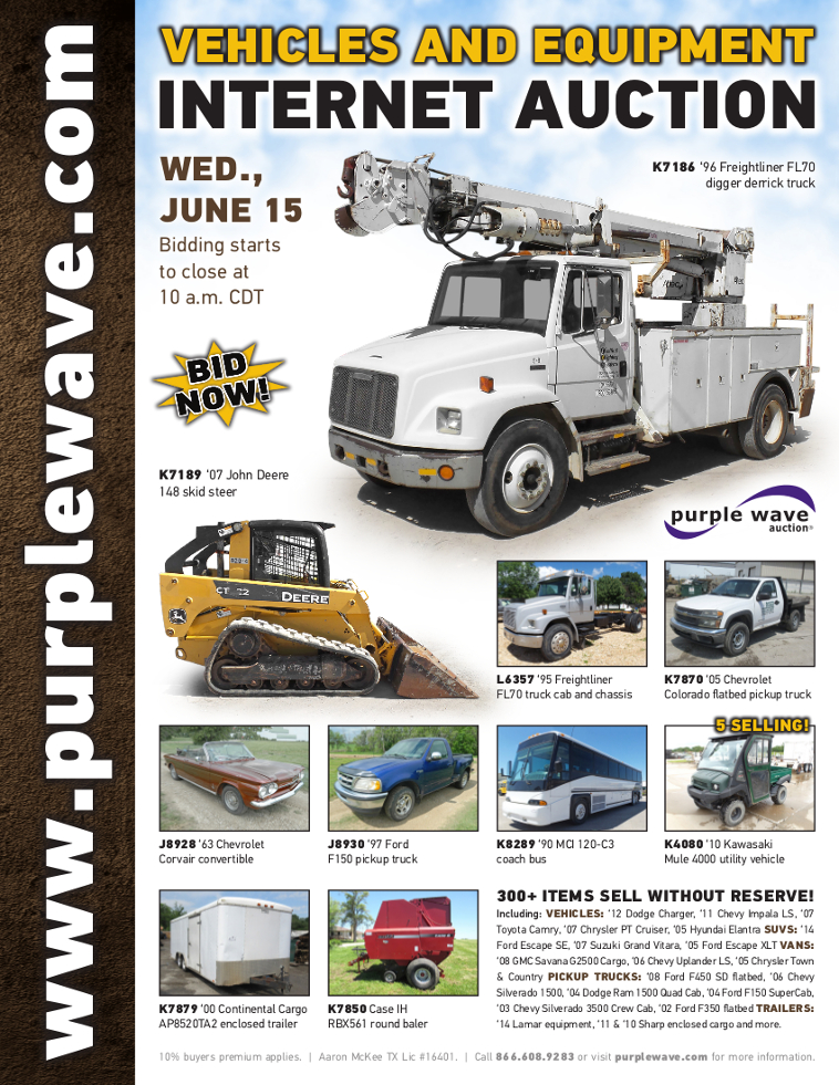 Payments must be made by 4 p.m. CDT on the second business day following the auction. Purple Wave reserves the right to charge the credit card on file the total purchase price, $30.00 late payment fee for invoices not paid within our terms. Business hours are Monday through Friday 8 a.m. to 5 p.m CDT. Cash and wire transfers (wire instructions) in any amount will be accepted. Checks up to $10,000.00 will be accepted without a bank guaranty letter. Checks of $10,000.00 or greater will be accepted only with a bank guaranty letter (letter requirements) or with prior approval from Purple Wave's credit department. MasterCard or Visa will be accepted only for charges up to $2,000.00, and only after authorization (via website or email) or in-person signatures are obtained from the cardholder. Purple Wave reserves the right to hold assets and/or certificates of title until funds availability is confirmed.