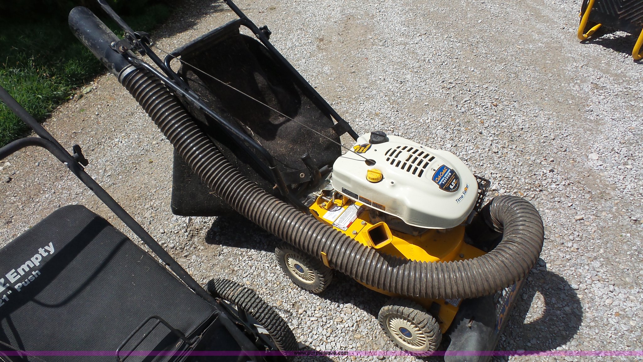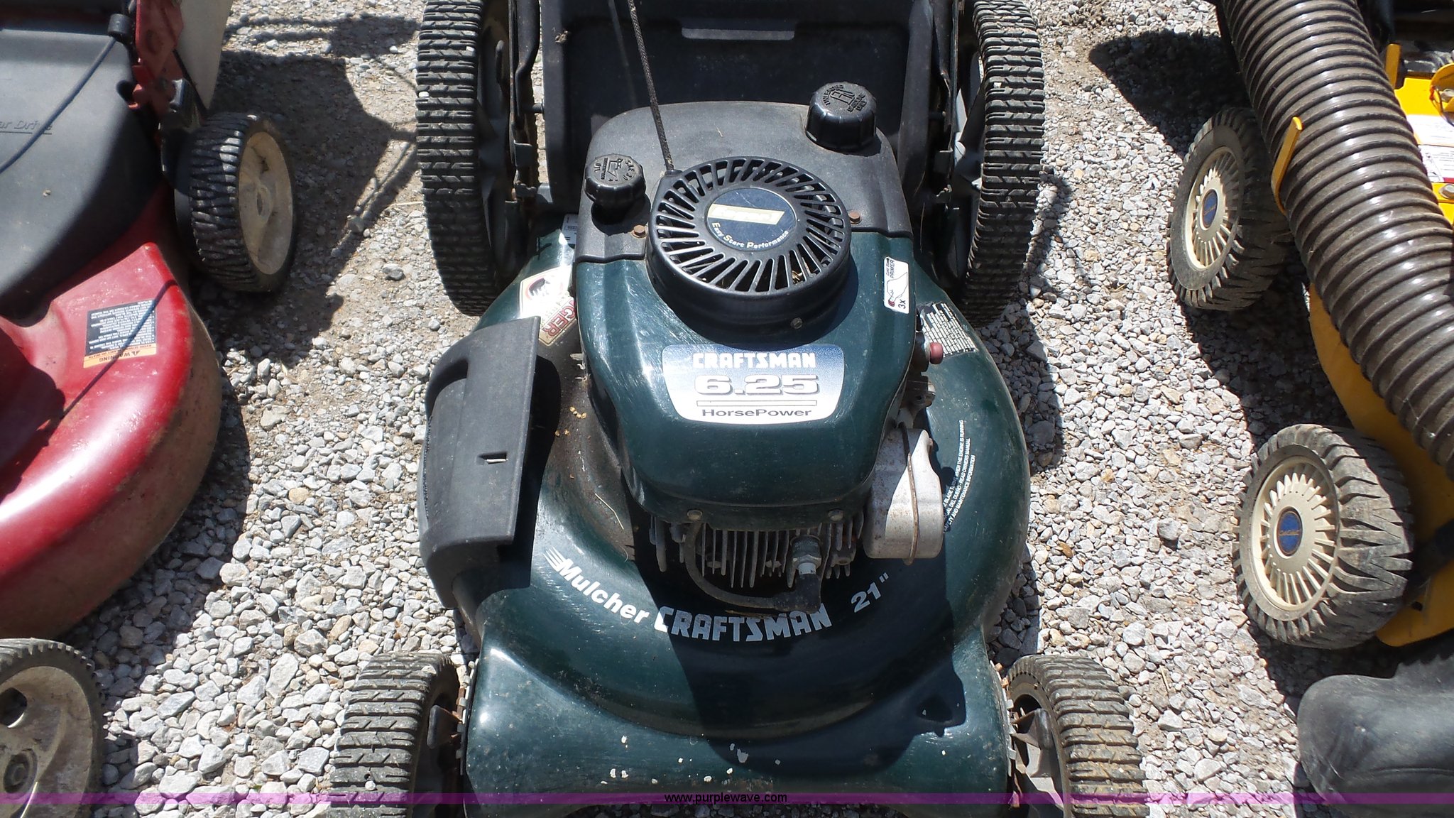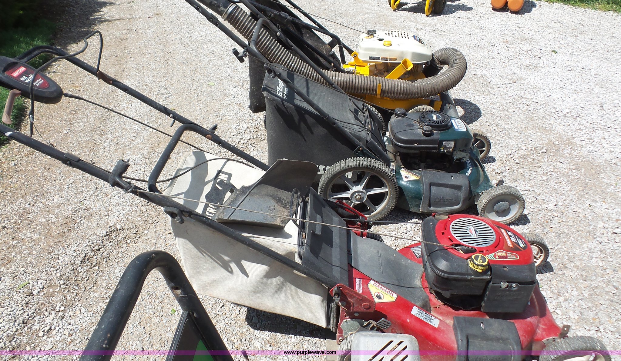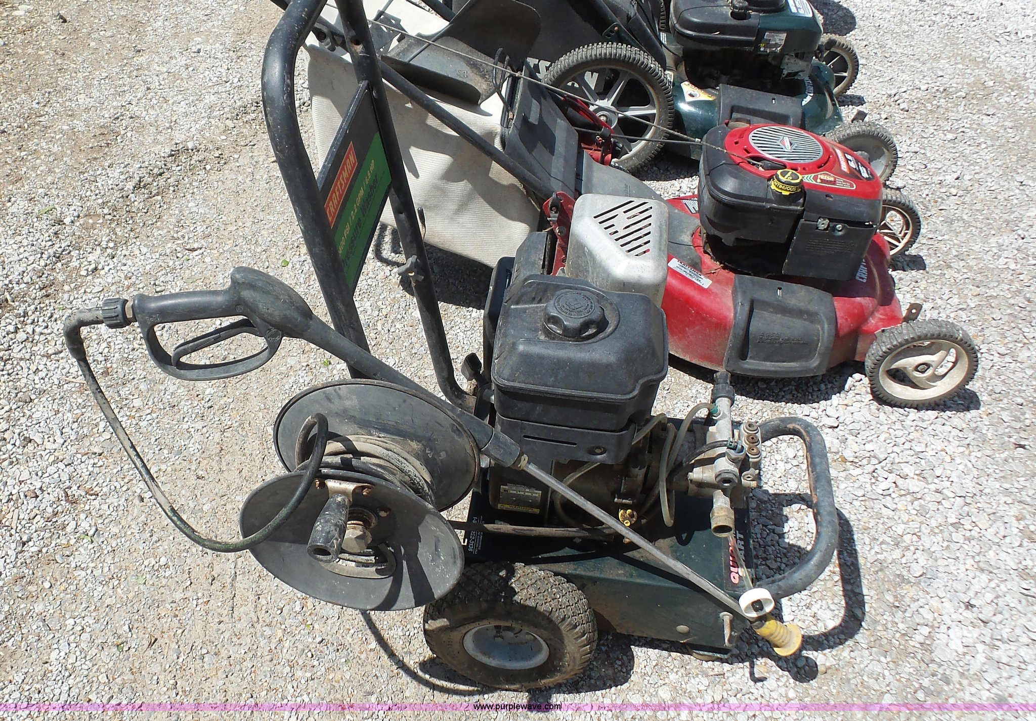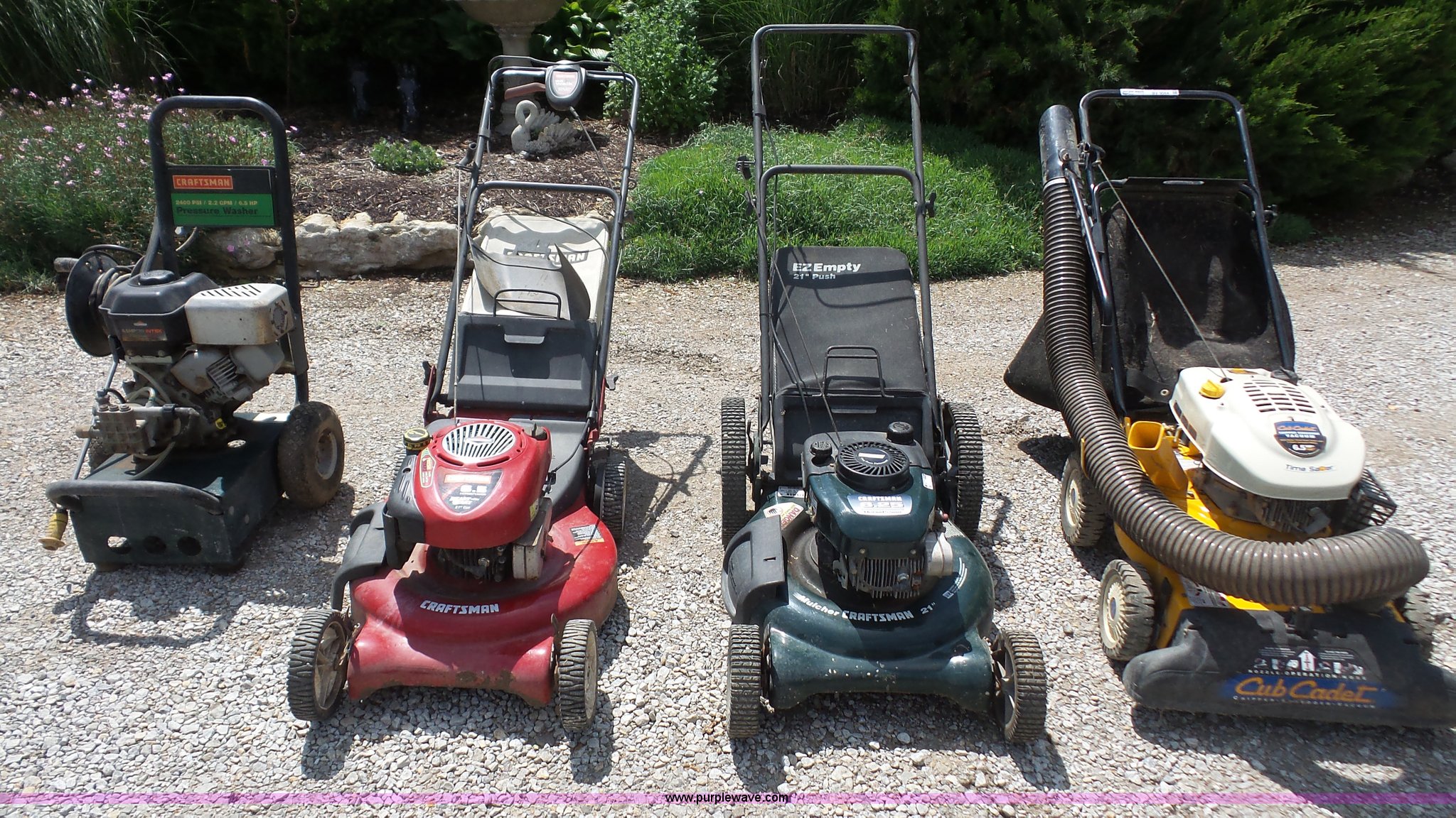 Purple Wave is selling a used Lawn and Garden in Kansas. This item is a Lawn and garden equipment with the following: Cub Cadet chipper shredder vacuum, 6.5 HP, Craftsman mower, 21" cut, 6.25 HP, Craftsman mulcher mower, 21" cut, 6.25 HP, Craftsman pressure washer, 6.5 HP, 2.2 gpm, 2,400 psi, Unknown operating condition