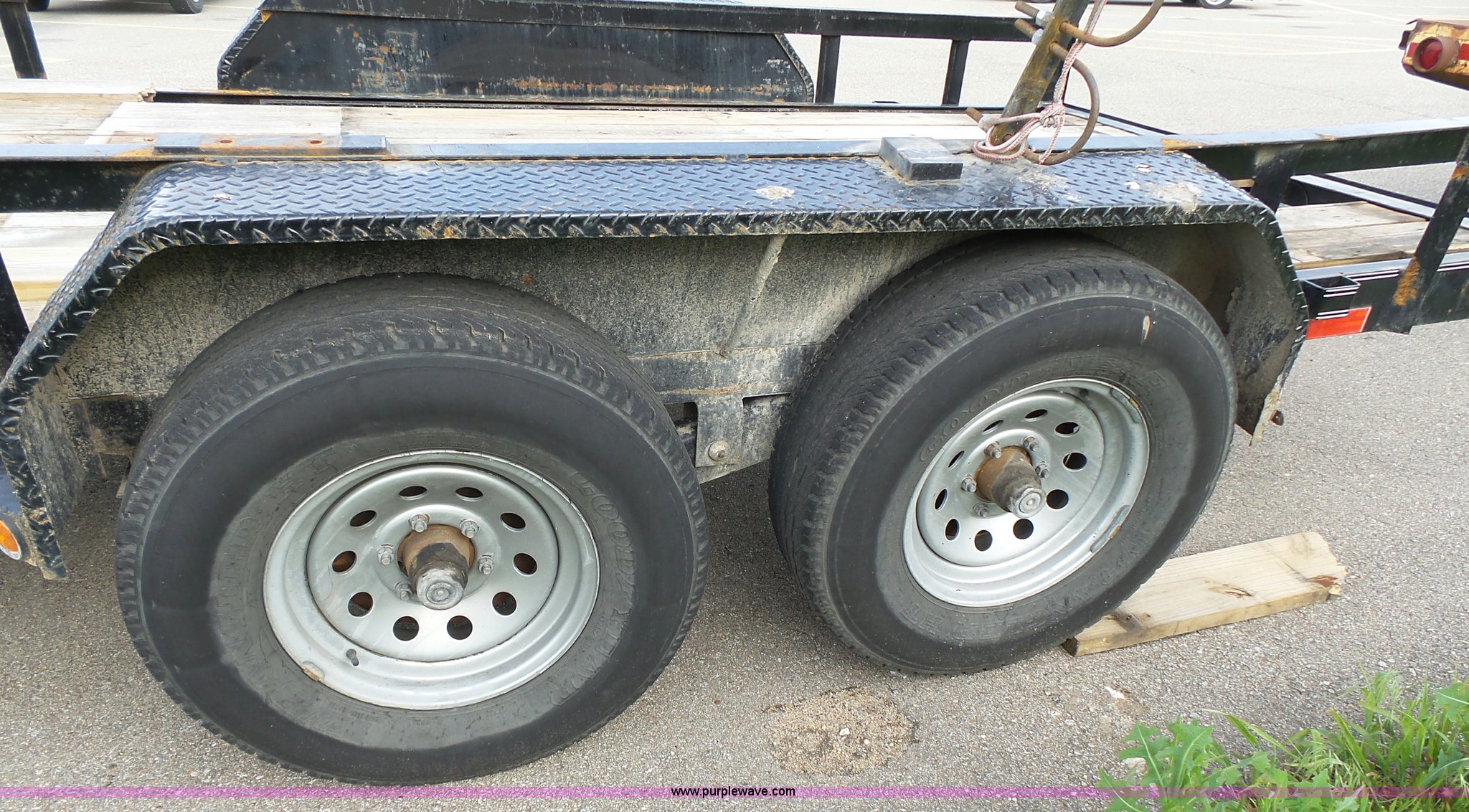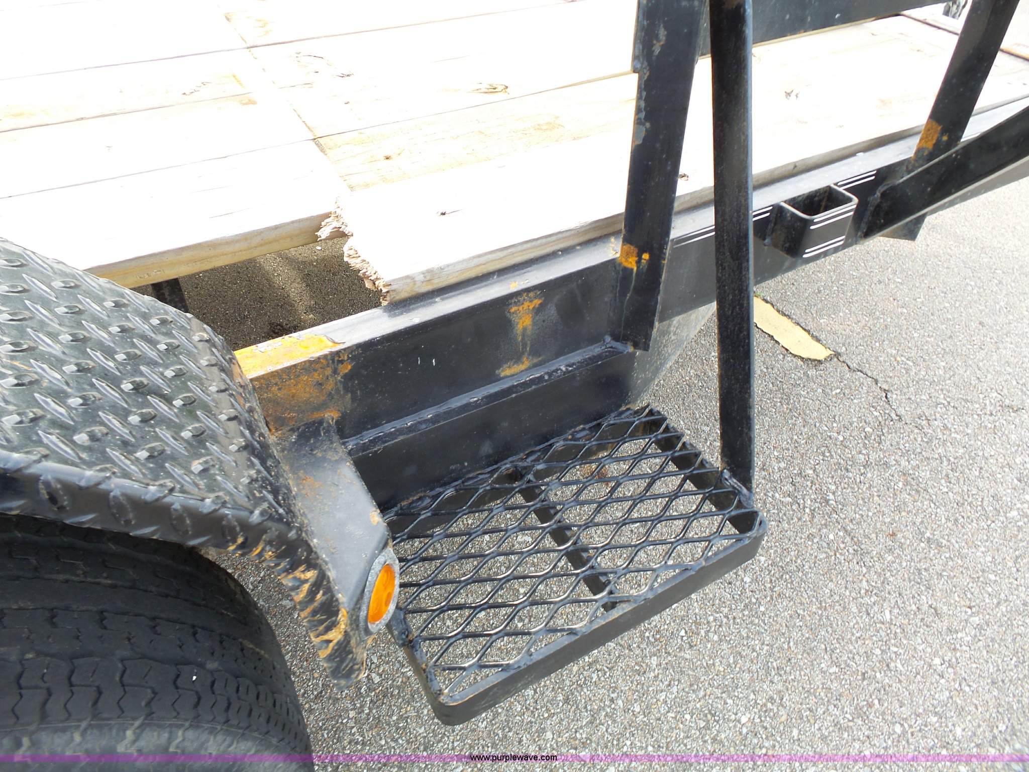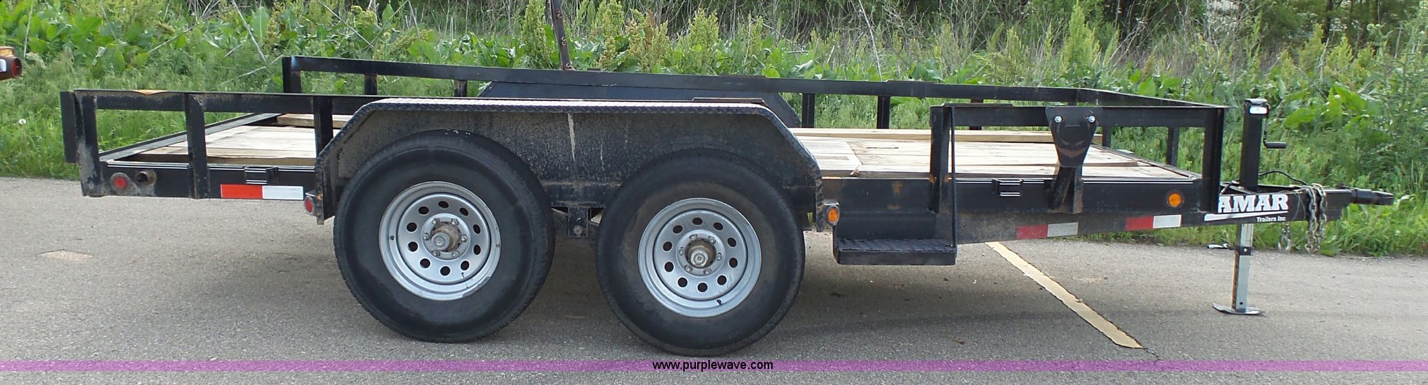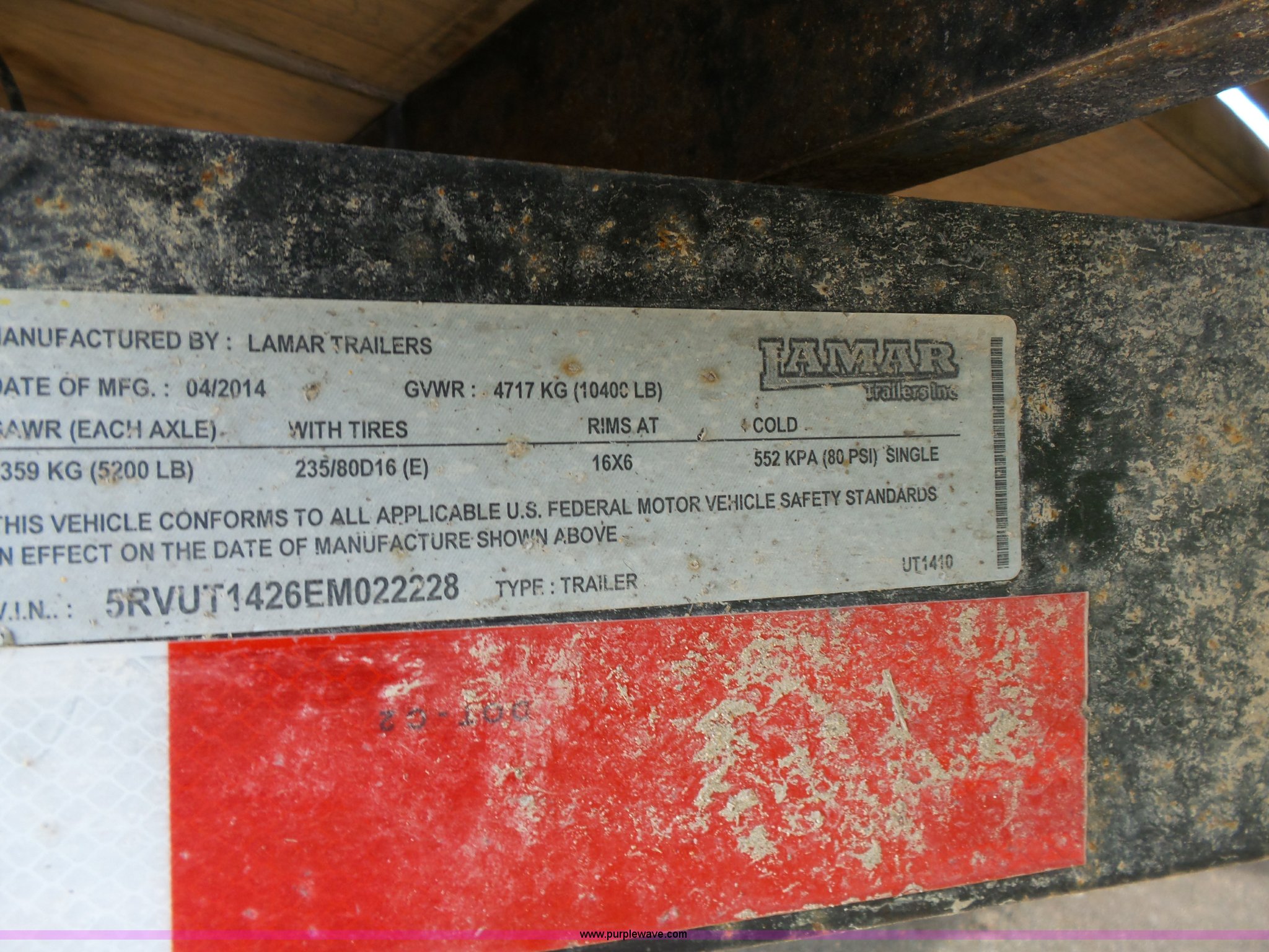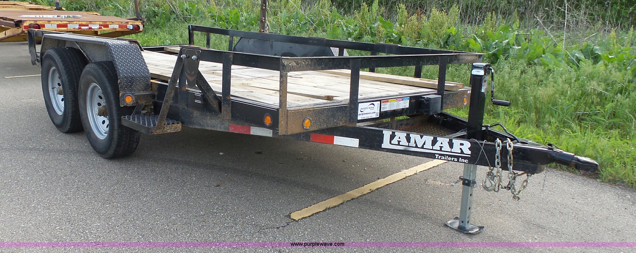 Purple Wave is selling a used Equip. Trailer in Kansas. This item is a 2014 Lamar equipment trailer with the following: 14'L x 97", 78" wheel width, Wood deck, Stake side pockets, Side step, Safety chains, Break-away cable, 2 5/16" ball hitch, Tandem axle, 235/80R16 tires, GVWR 10,400 lbs