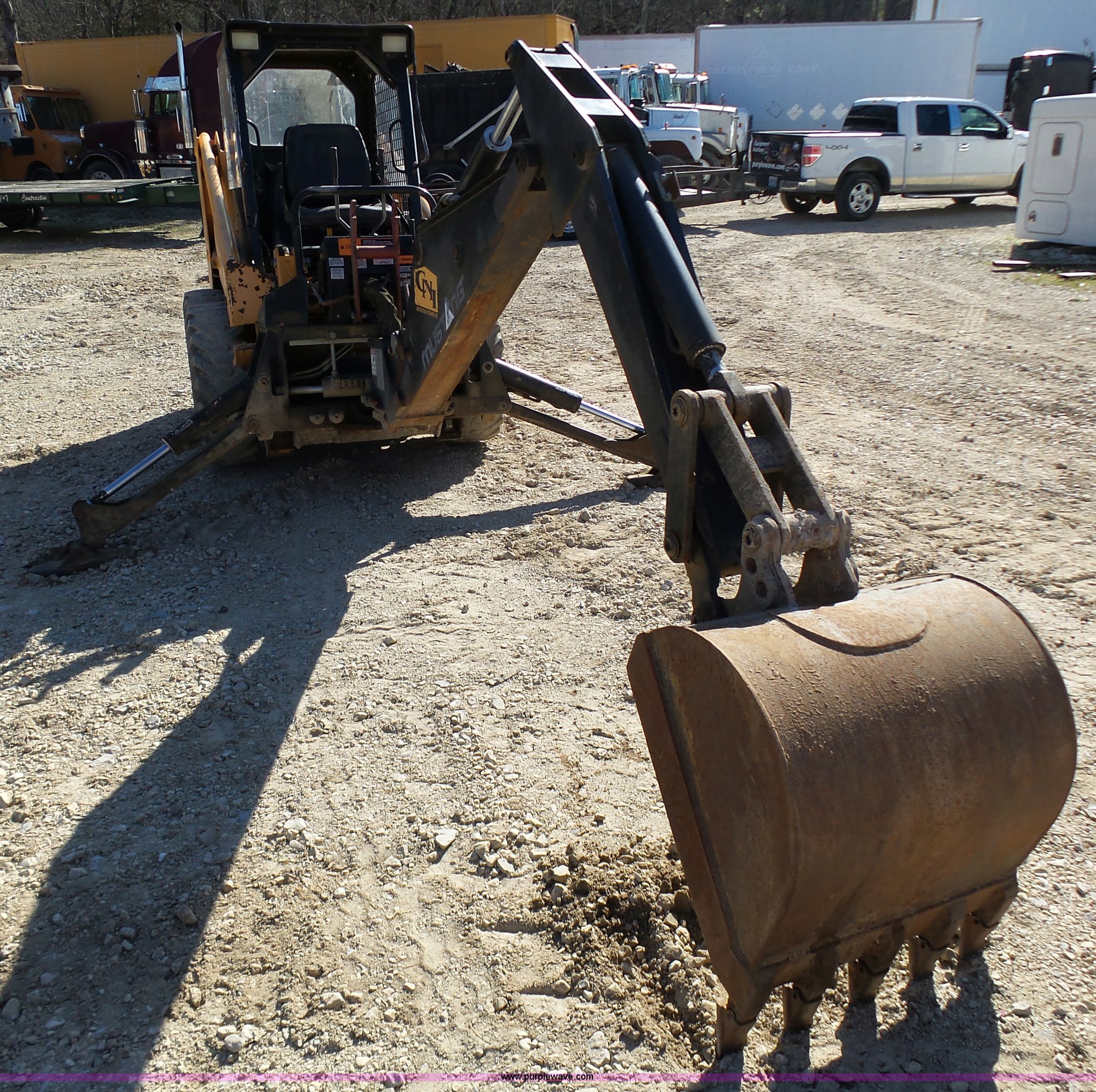 Purple Wave is selling a used Skid Steer Attach. in Missouri. This item is a Mustang MBH9 excavator skid steer attachment with the following: 48"L stick, 23"W toothed bucket, Replaceable teeth, Joystick controls, Operator's seat, Hydraulic outriggers, Skid steer not included, Serial 89M20L2268