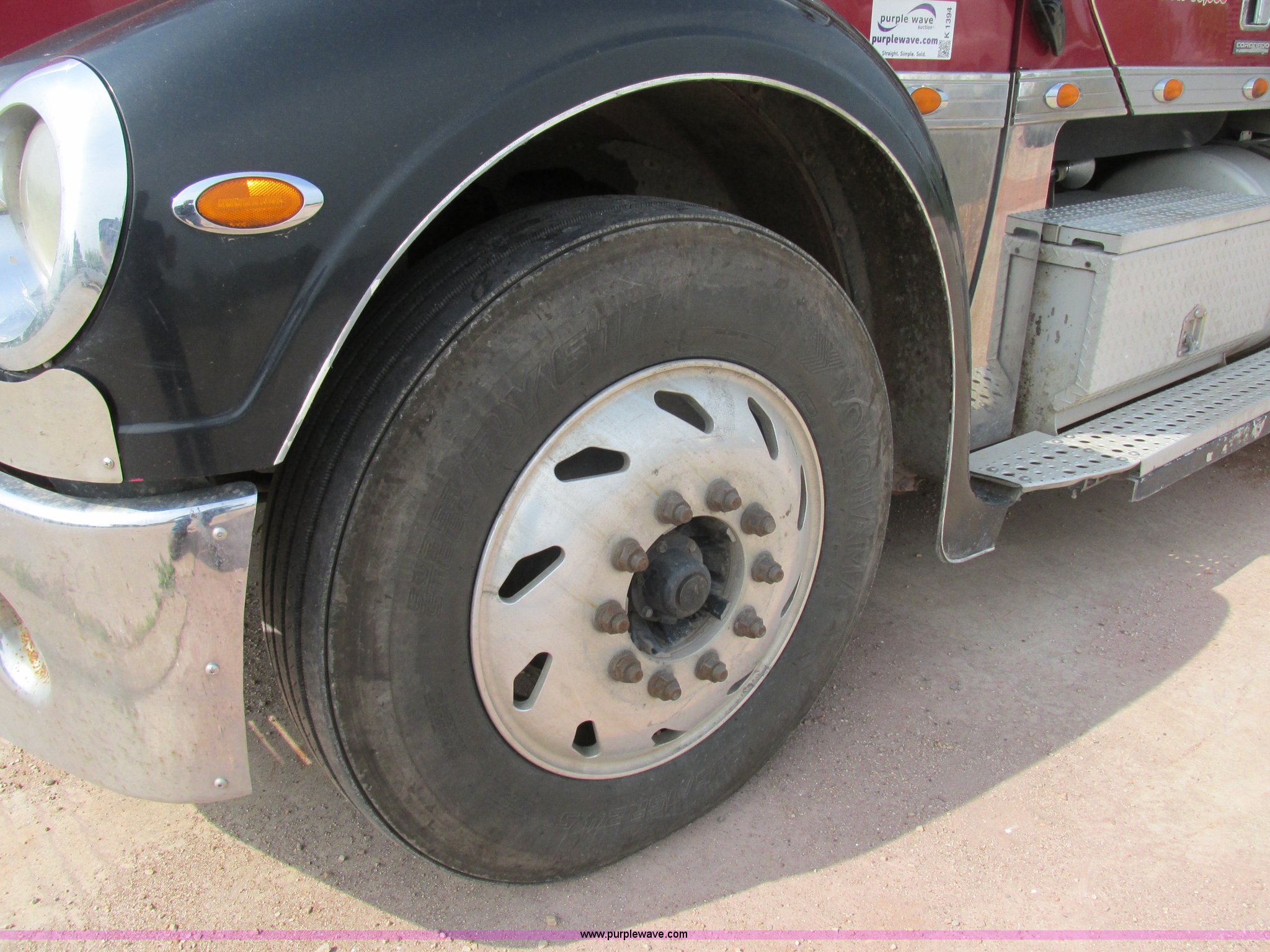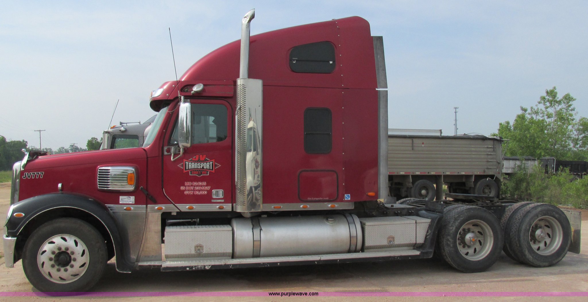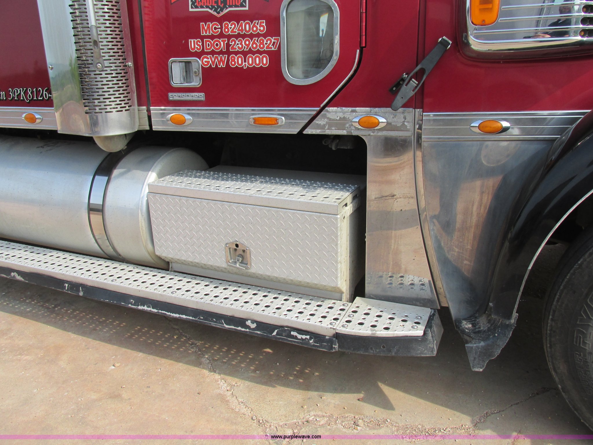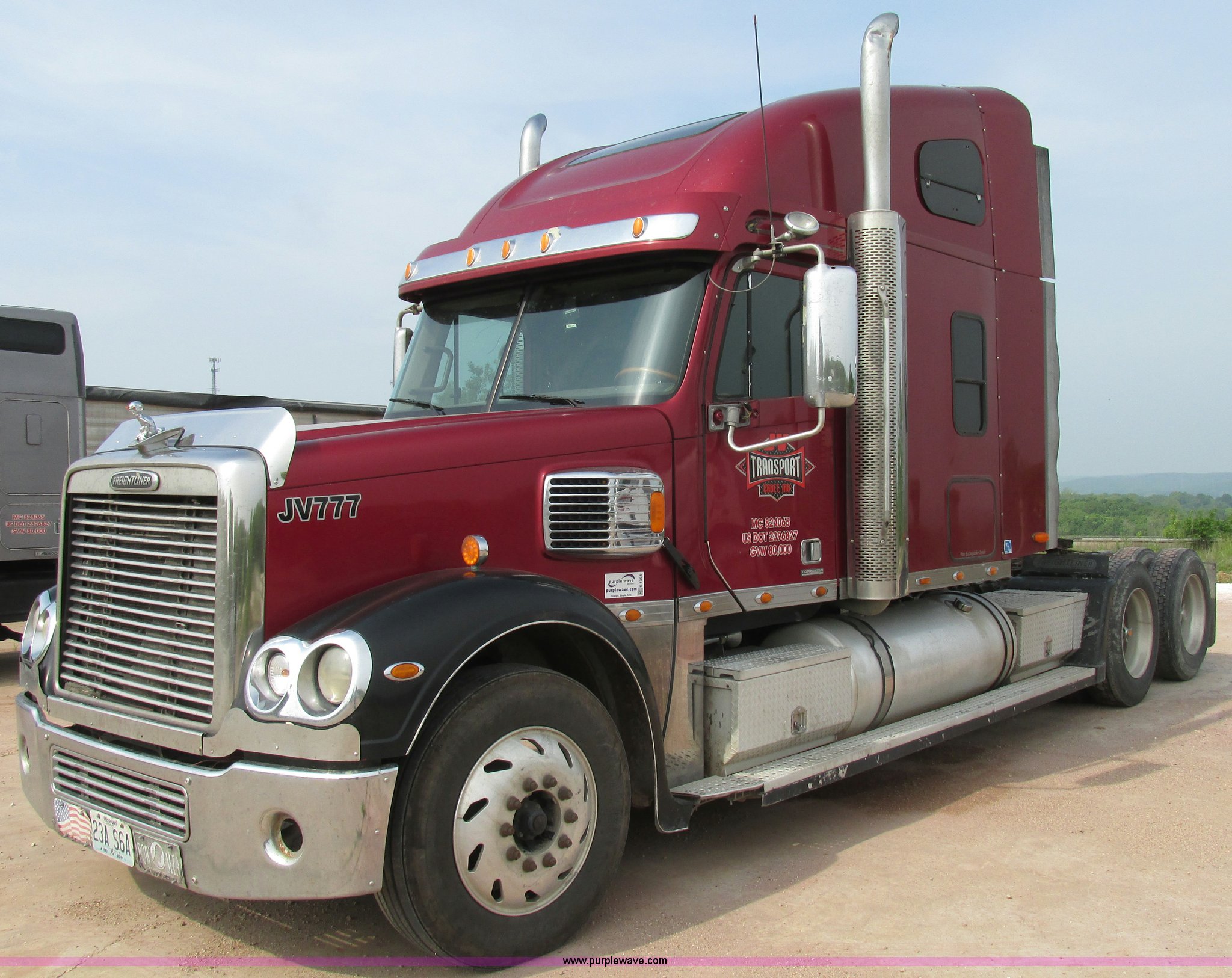 Purple Wave is selling a used Truck Tractor in Missouri. This item is a 2003 Freightliner Coronado semi truck with the following: 1,508,929 miles on odometer, Detroit Diesel Series 60 14.0L L6 diesel engine, 430 HP, 13 speed manual transmission, Tandem axle, Inter-axle differential lock, AC and heat, AM/FM, Air suspension seat, Sleeper, Single bed, Storage cabinets, Rear climate control, PTO, Wet kit, Exterior visor, Dual exhaust stacks, Air operated sliding fifth wheel plate, Dual fuel tanks, Plastic quarter fenders, Mud flaps, Air suspension, Air brakes, 285/75R24.5 tires, GVWR 52,000 lbs, FAWR 12,000 lbs, IAWR 20,000 lbs, RAWR 20,000 lbs, Interior/exterior cosmetic damage, Cracked windshield, Unit# JV777
