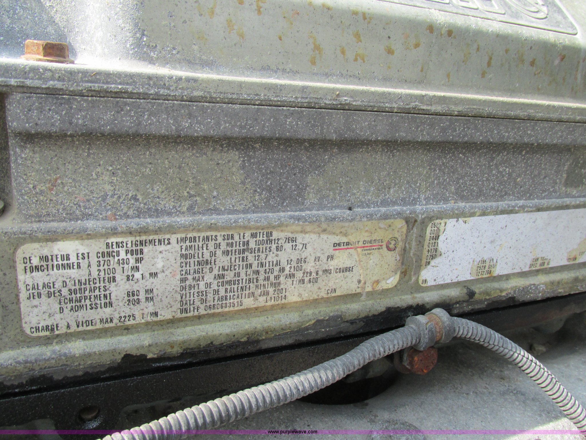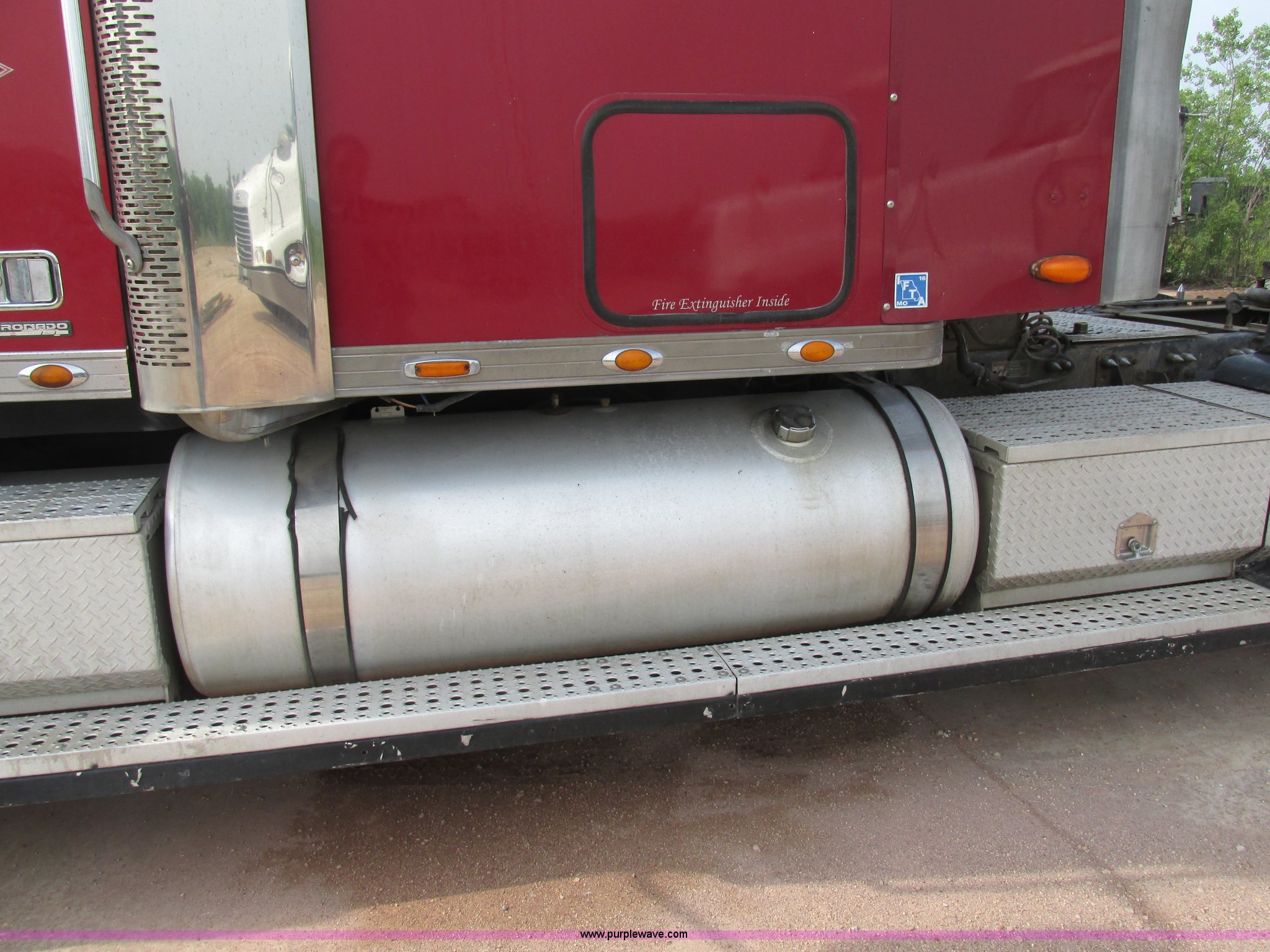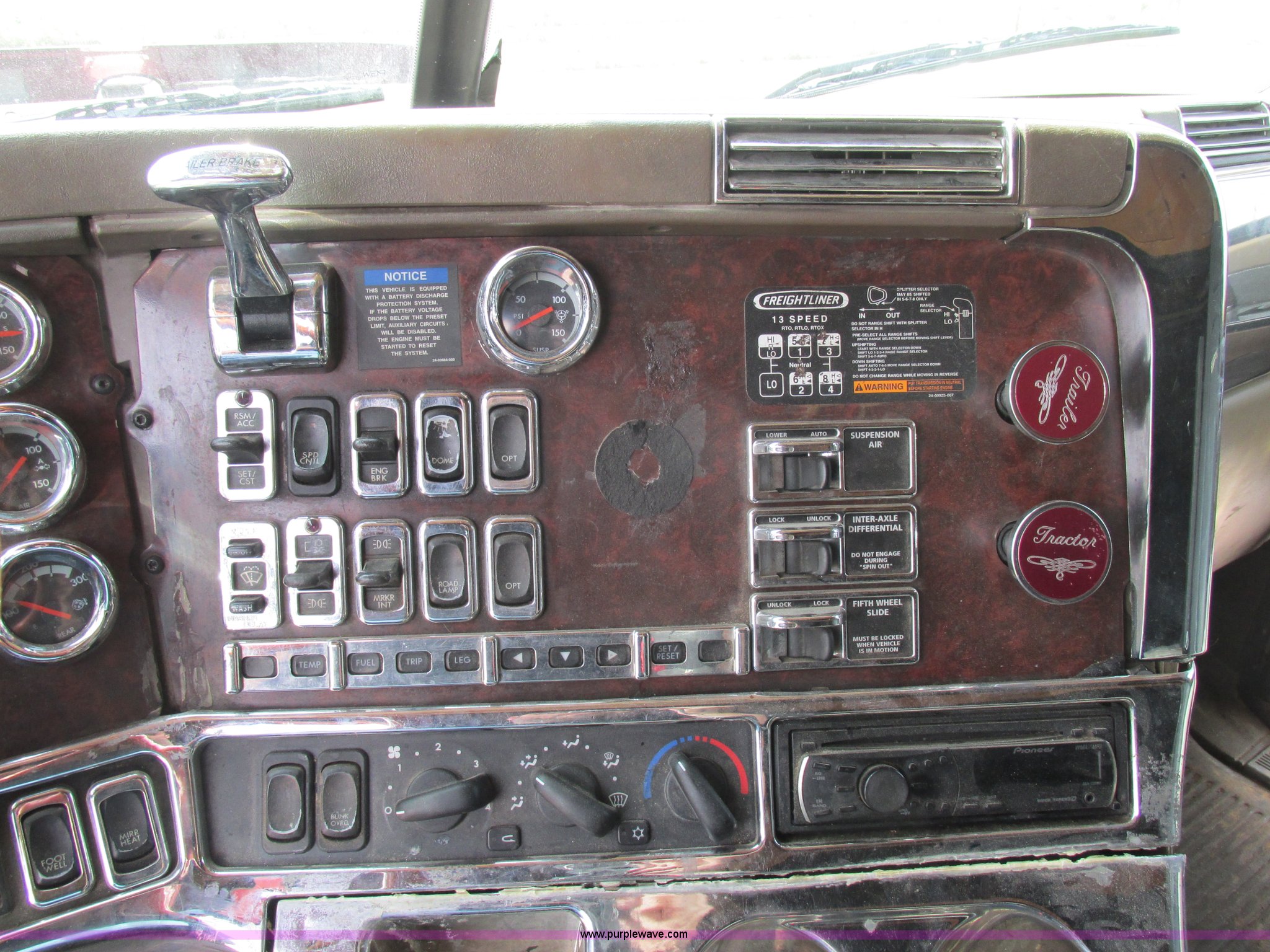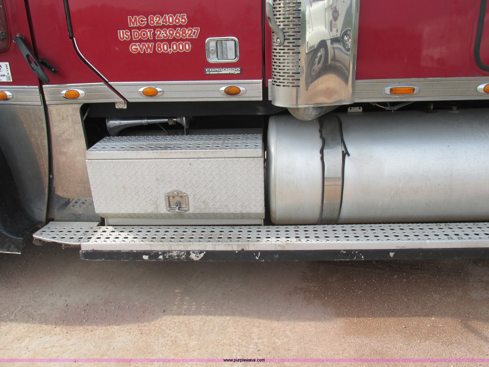 Purple Wave is selling a used Truck Tractor in Missouri. This item is a 2003 Freightliner Coronado semi truck with the following: 1,508,929 miles on odometer, Detroit Diesel Series 60 14.0L L6 diesel engine, 430 HP, 13 speed manual transmission, Tandem axle, Inter-axle differential lock, AC and heat, AM/FM, Air suspension seat, Sleeper, Single bed, Storage cabinets, Rear climate control, PTO, Wet kit, Exterior visor, Dual exhaust stacks, Air operated sliding fifth wheel plate, Dual fuel tanks, Plastic quarter fenders, Mud flaps, Air suspension, Air brakes, 285/75R24.5 tires, GVWR 52,000 lbs, FAWR 12,000 lbs, IAWR 20,000 lbs, RAWR 20,000 lbs, Interior/exterior cosmetic damage, Cracked windshield, Unit# JV777