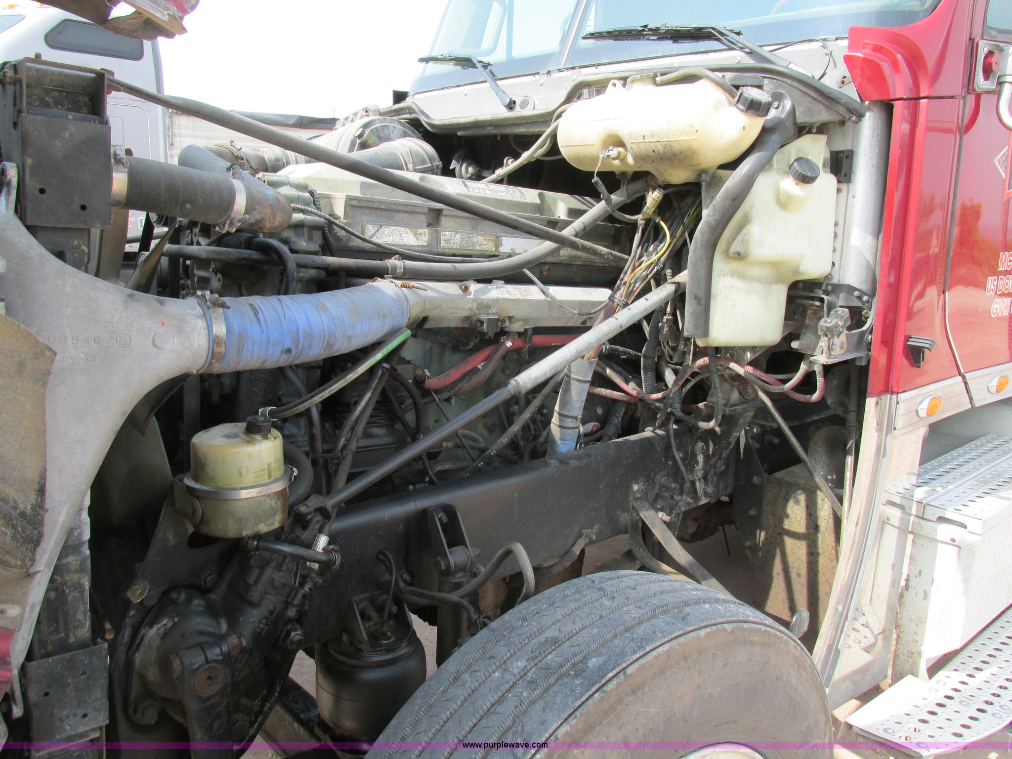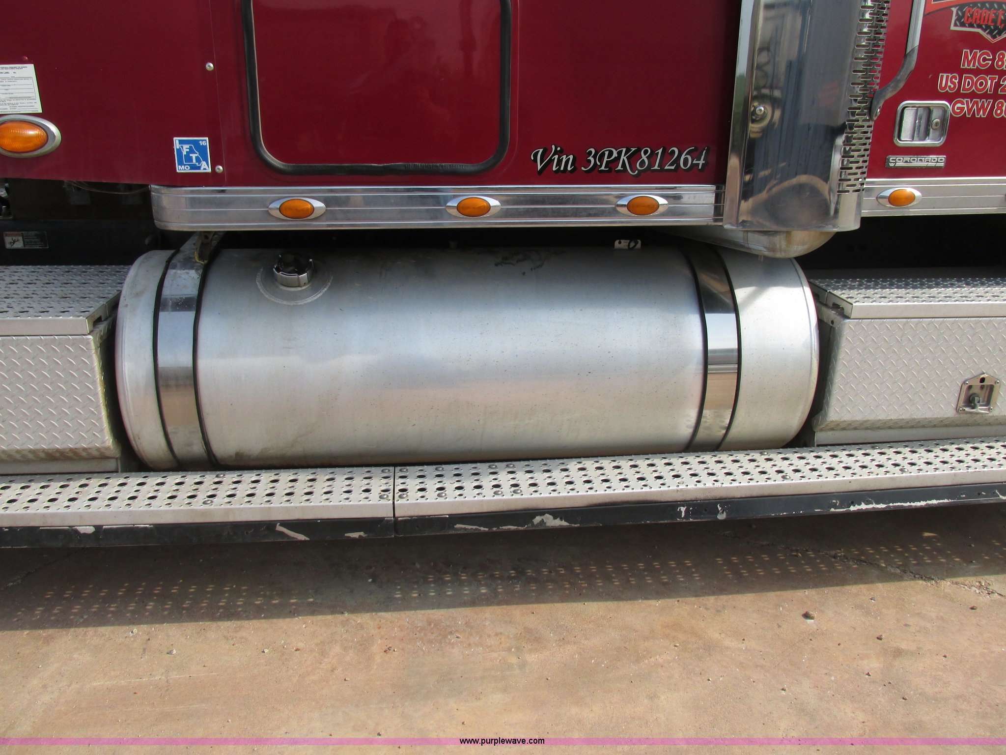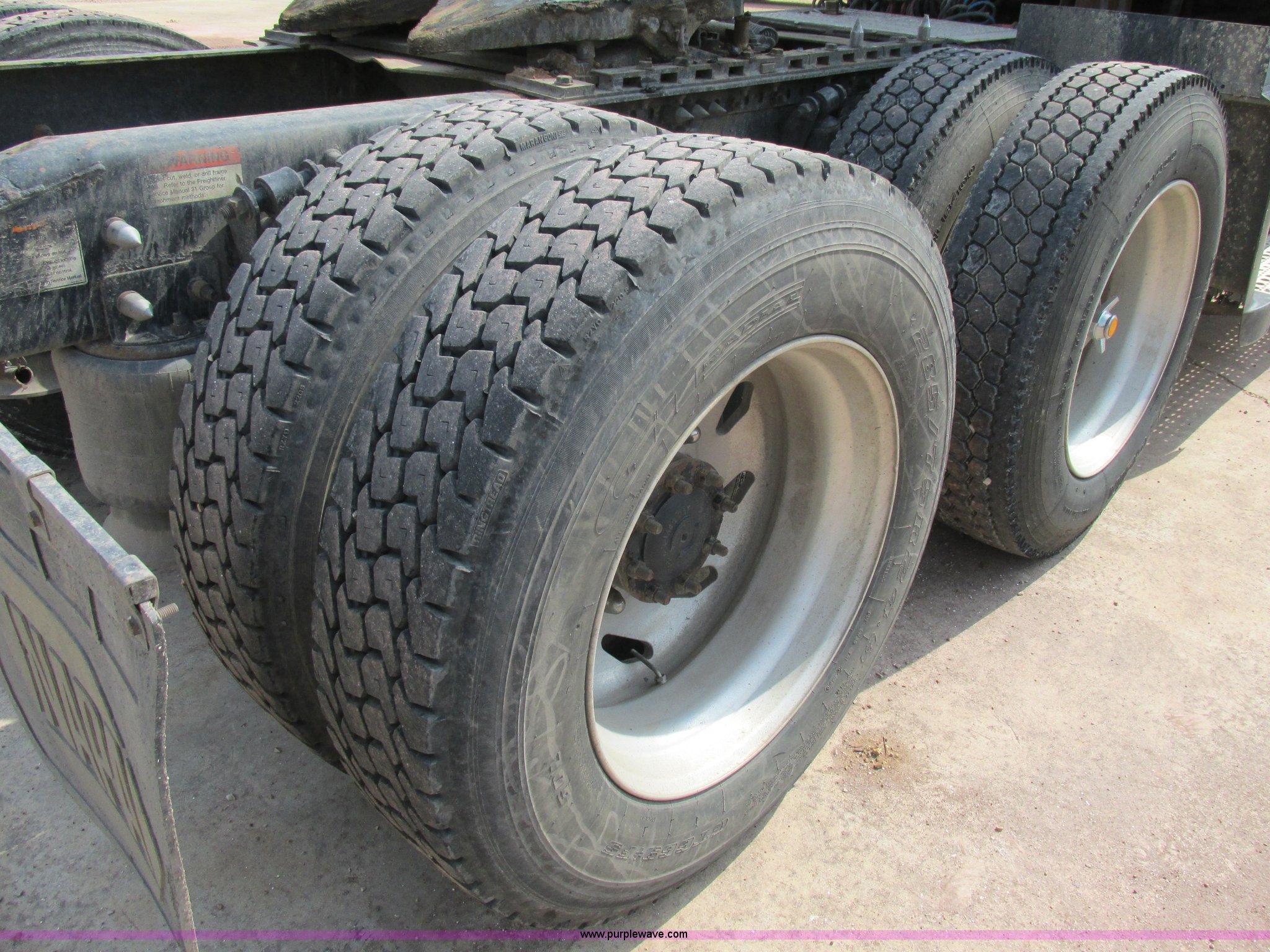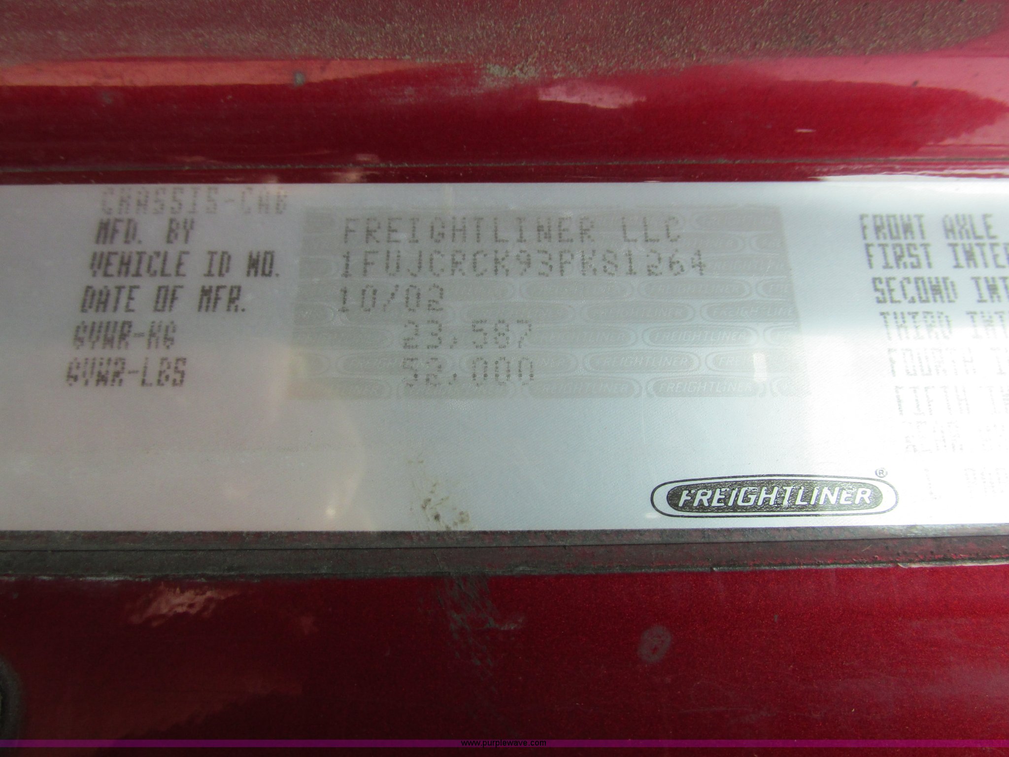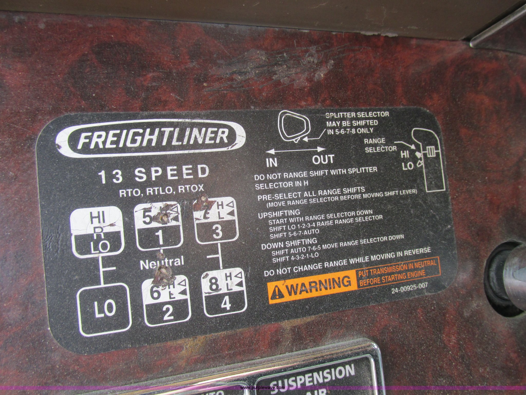 Purple Wave is selling a used Truck Tractor in Missouri. This item is a 2003 Freightliner Coronado semi truck with the following: 1,508,929 miles on odometer, Detroit Diesel Series 60 14.0L L6 diesel engine, 430 HP, 13 speed manual transmission, Tandem axle, Inter-axle differential lock, AC and heat, AM/FM, Air suspension seat, Sleeper, Single bed, Storage cabinets, Rear climate control, PTO, Wet kit, Exterior visor, Dual exhaust stacks, Air operated sliding fifth wheel plate, Dual fuel tanks, Plastic quarter fenders, Mud flaps, Air suspension, Air brakes, 285/75R24.5 tires, GVWR 52,000 lbs, FAWR 12,000 lbs, IAWR 20,000 lbs, RAWR 20,000 lbs, Interior/exterior cosmetic damage, Cracked windshield, Unit# JV777