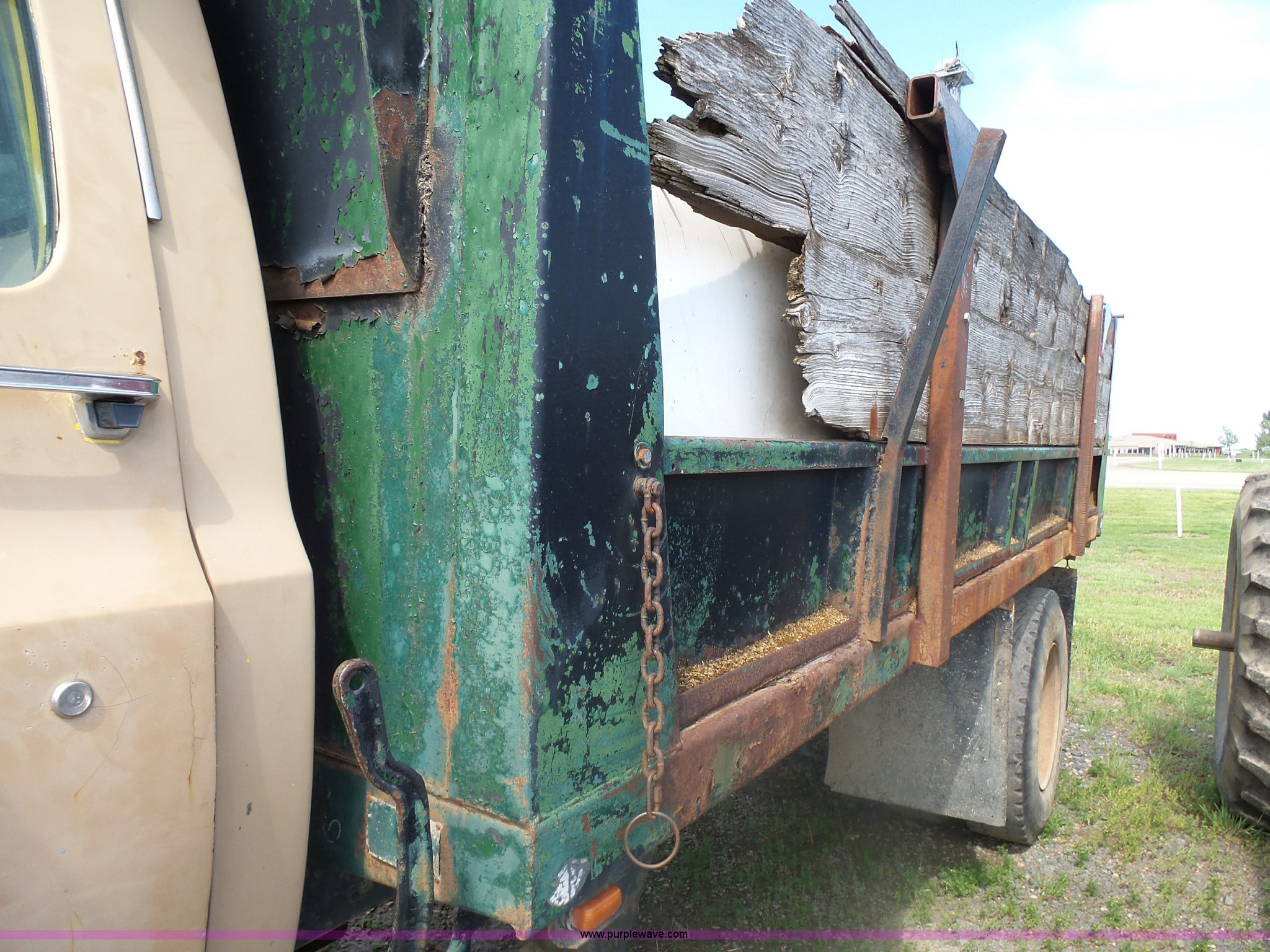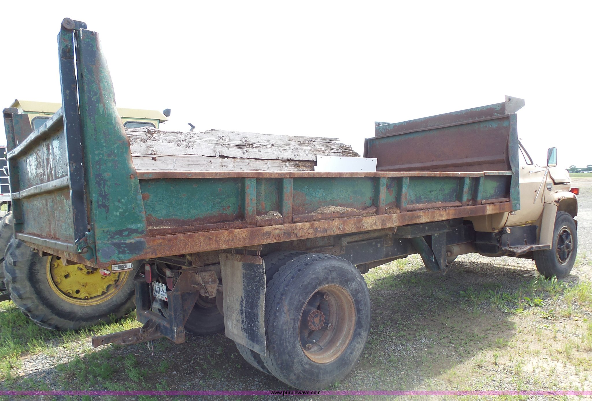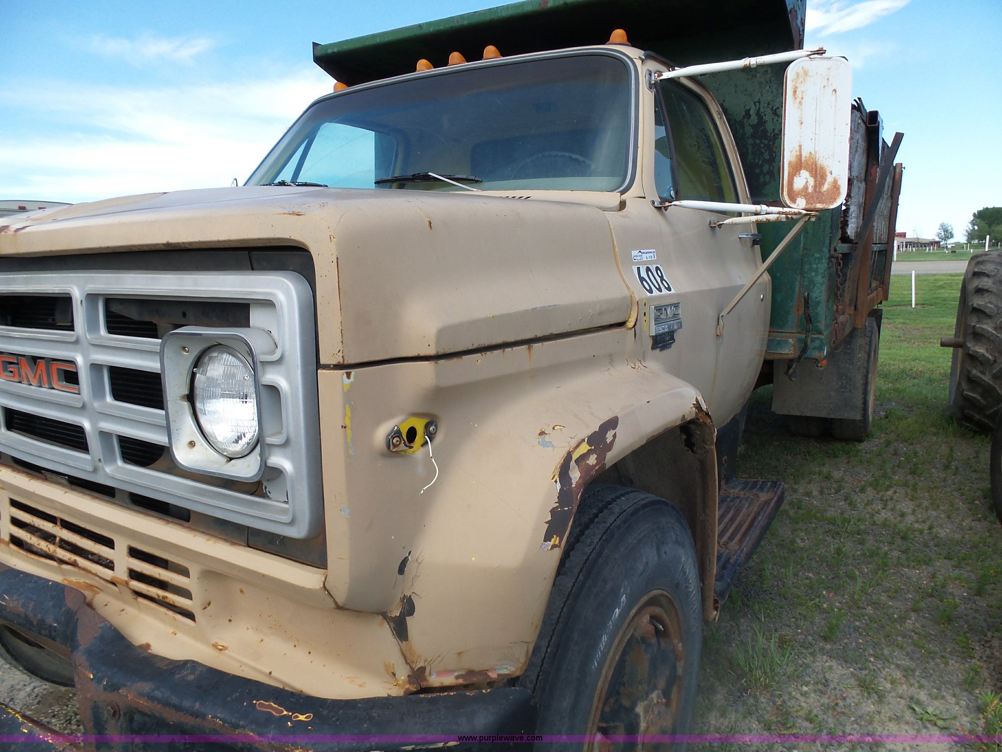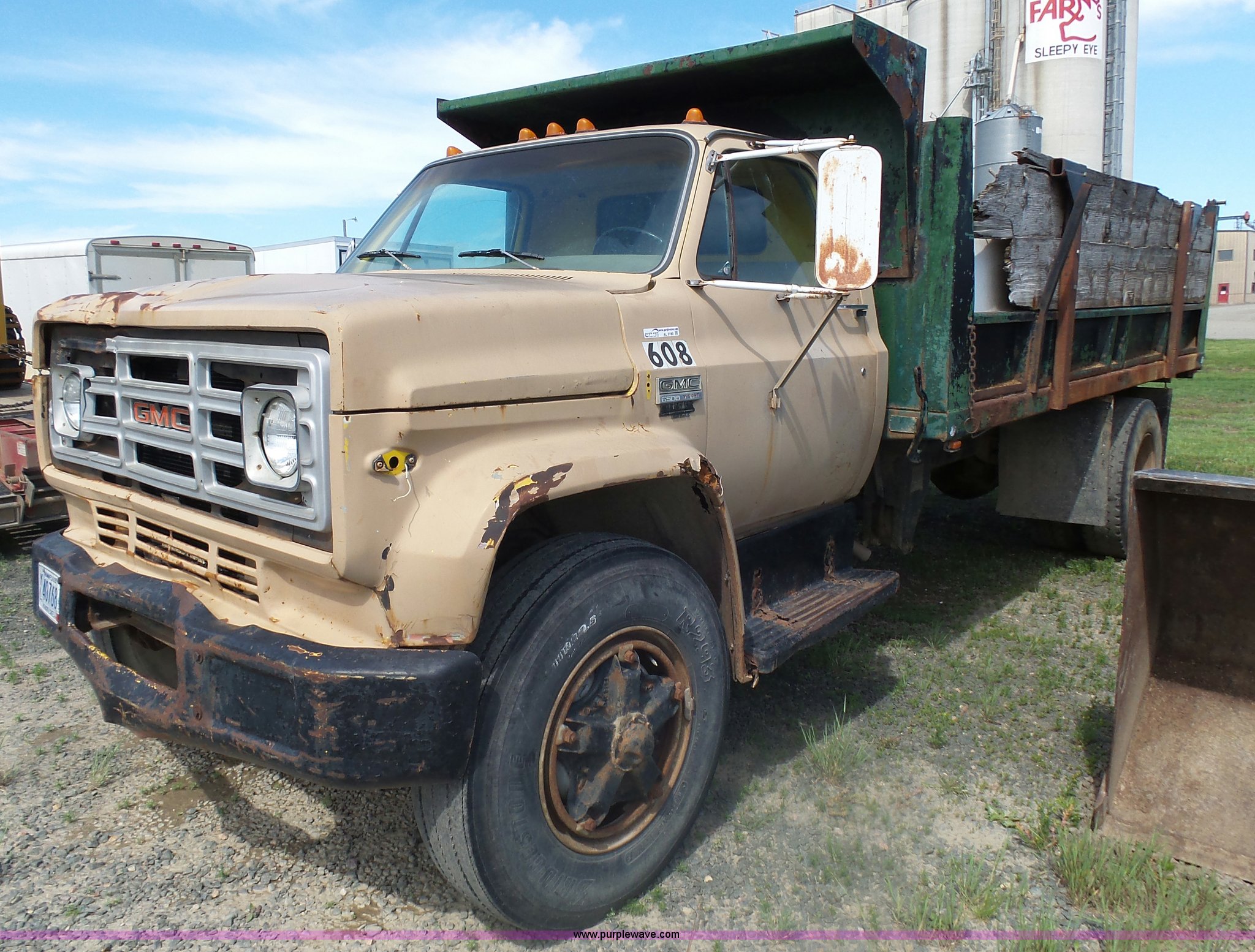 Purple Wave is selling a used Grain Truck in Minnesota. This item is a 1973 GMC 6500 grain truck with the following: 61,396 miles on odometer, V8 gas engine, Five speed manual transmission, Two speed rear end, Single axle, AC and heat, AM/FM, Suspension seat, 14'L x 4'W dump bed, 12" side board height, Manual end gate, Single ram hoist, Single fuel tank, Receiver hitch, Spring suspension, Hydraulic brakes, 11R22.5 tires, Seats torn, Cracked windshield