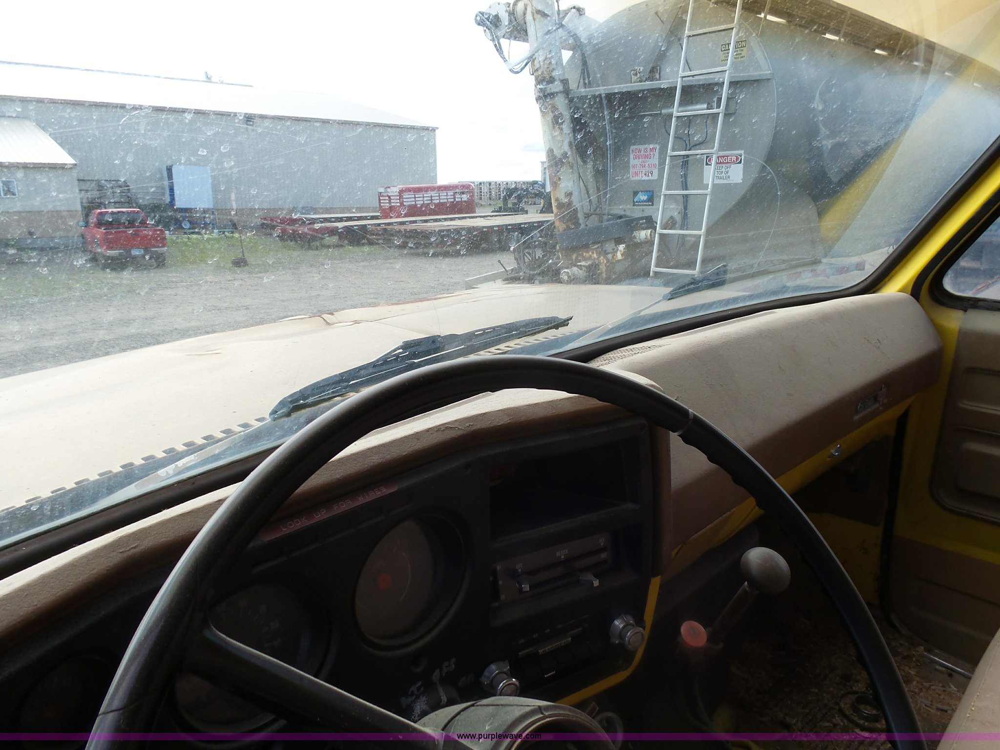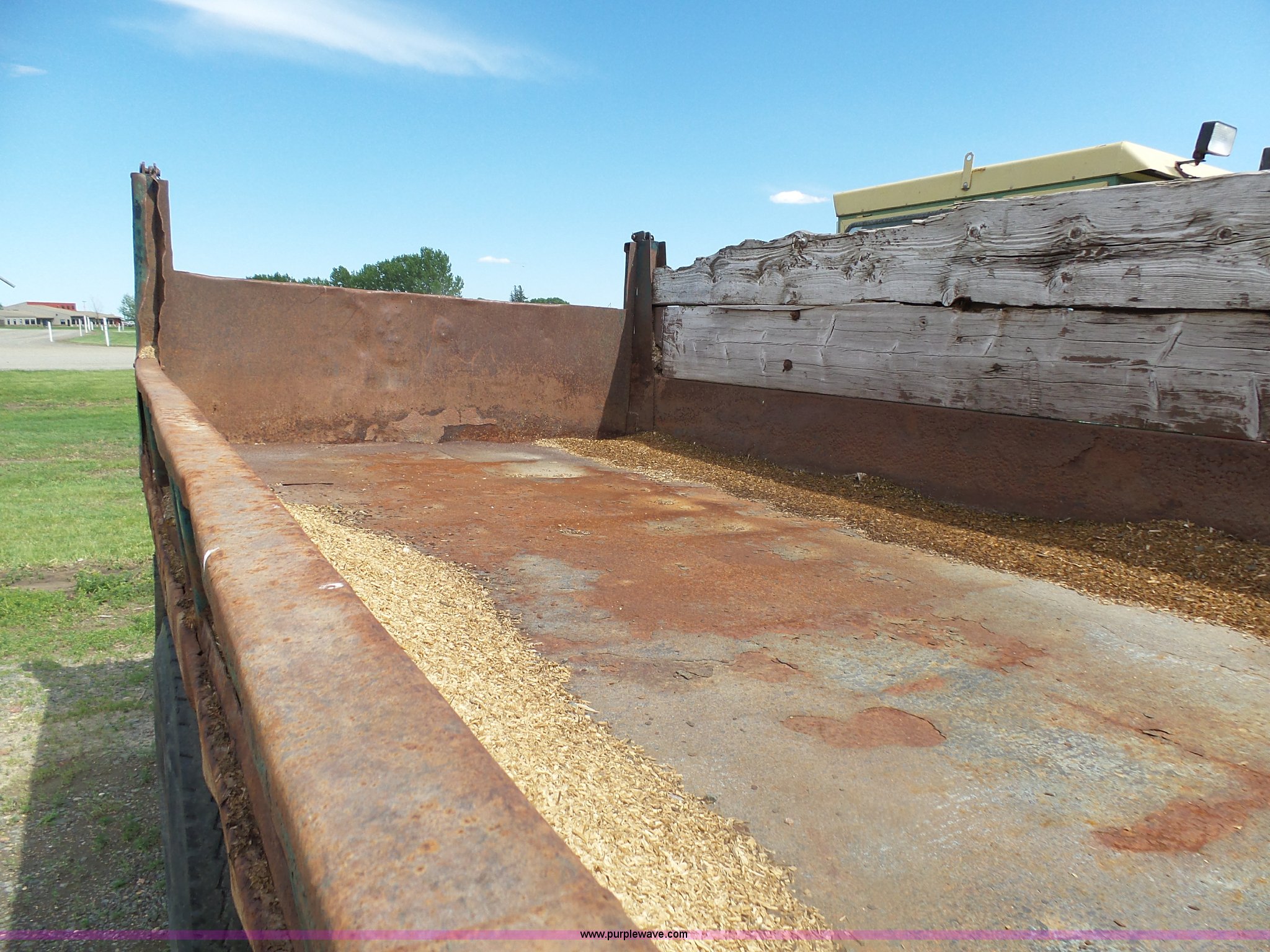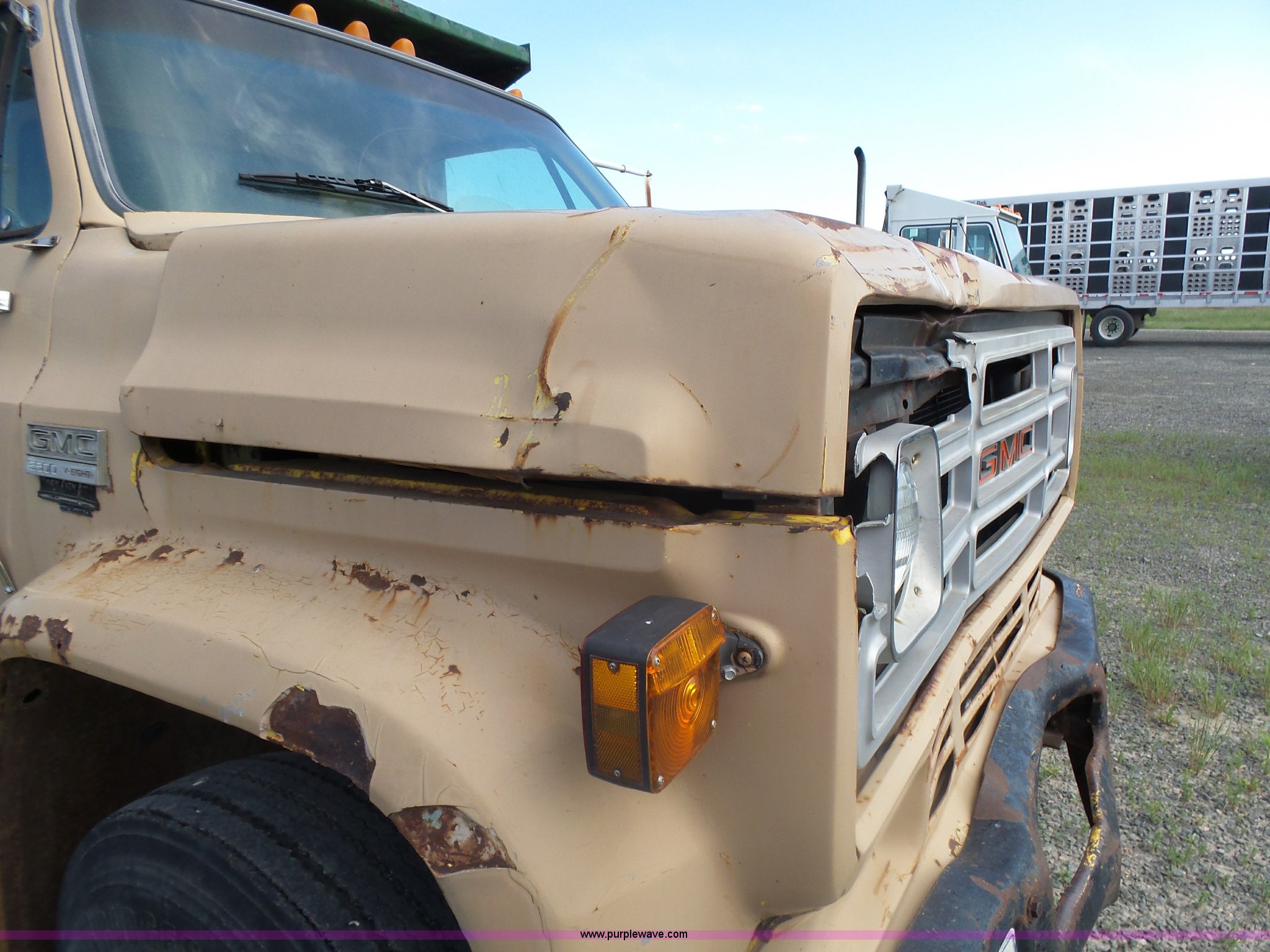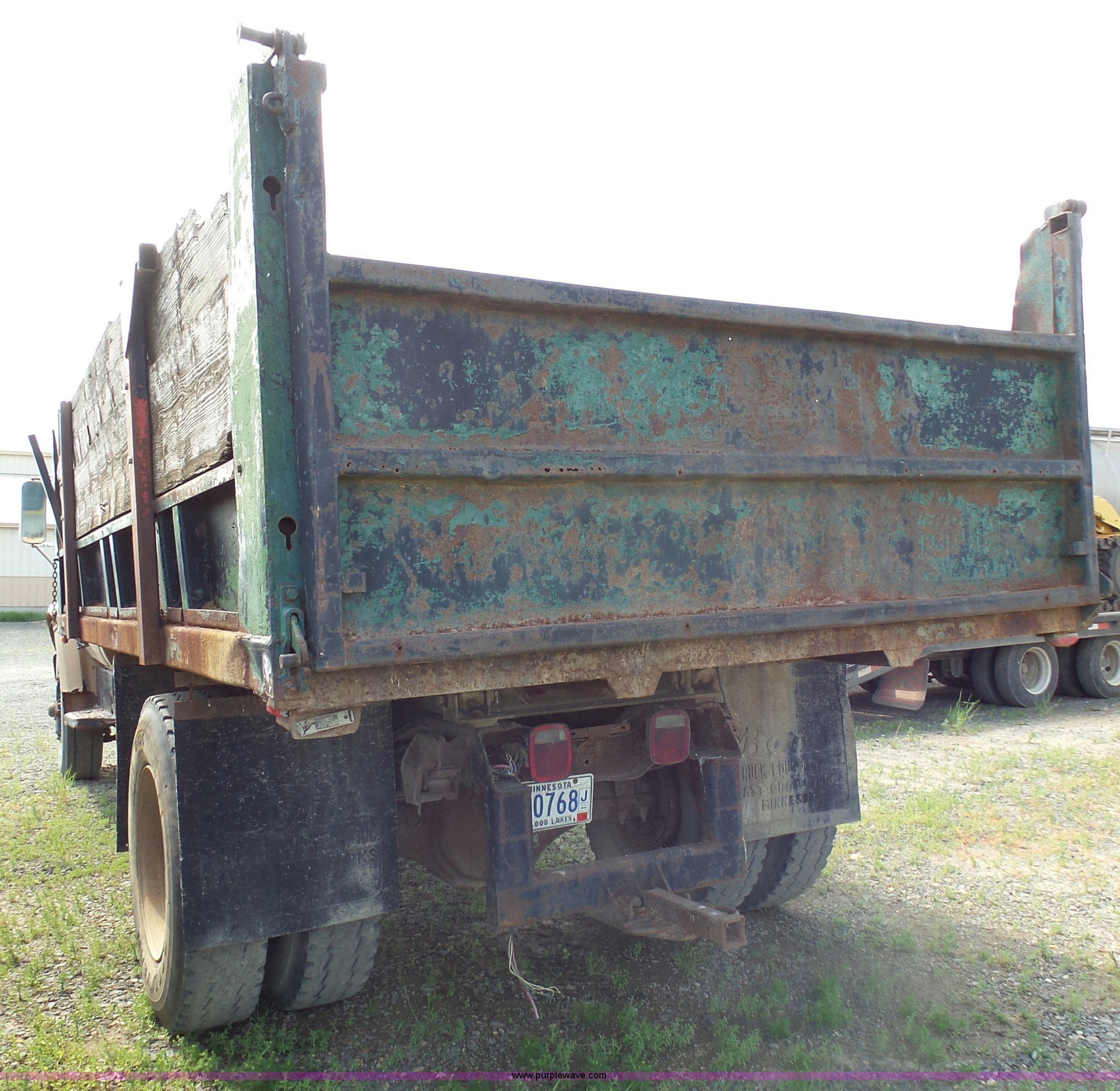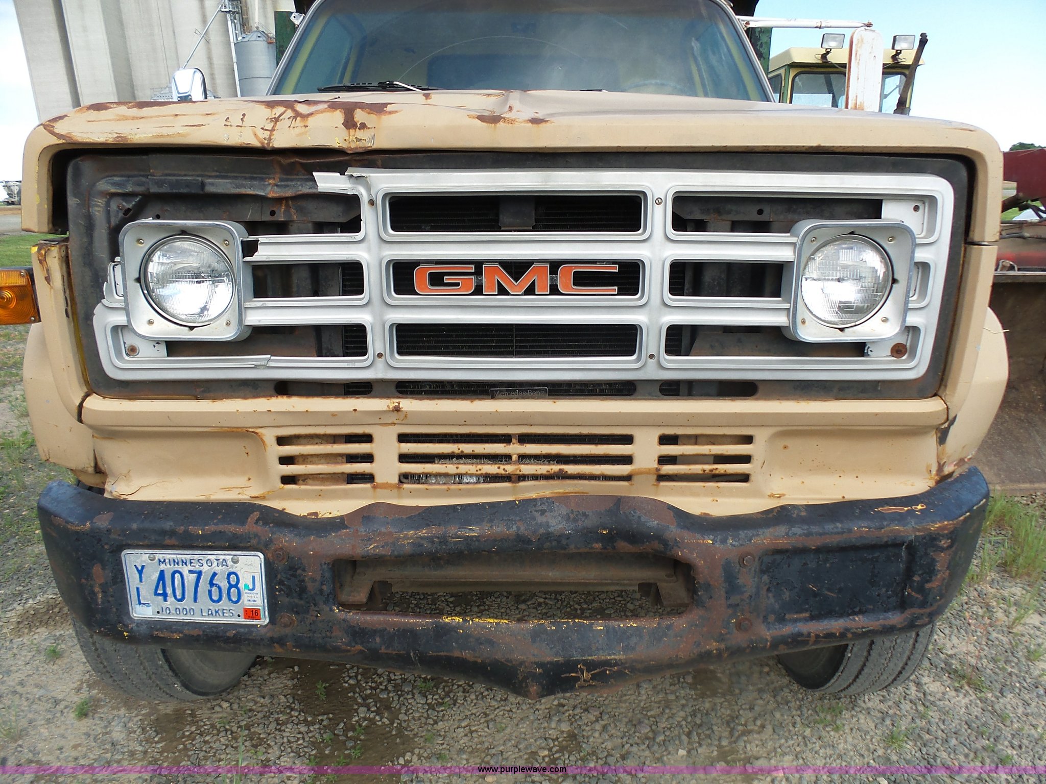 Purple Wave is selling a used Grain Truck in Minnesota. This item is a 1973 GMC 6500 grain truck with the following: 61,396 miles on odometer, V8 gas engine, Five speed manual transmission, Two speed rear end, Single axle, AC and heat, AM/FM, Suspension seat, 14'L x 4'W dump bed, 12" side board height, Manual end gate, Single ram hoist, Single fuel tank, Receiver hitch, Spring suspension, Hydraulic brakes, 11R22.5 tires, Seats torn, Cracked windshield
