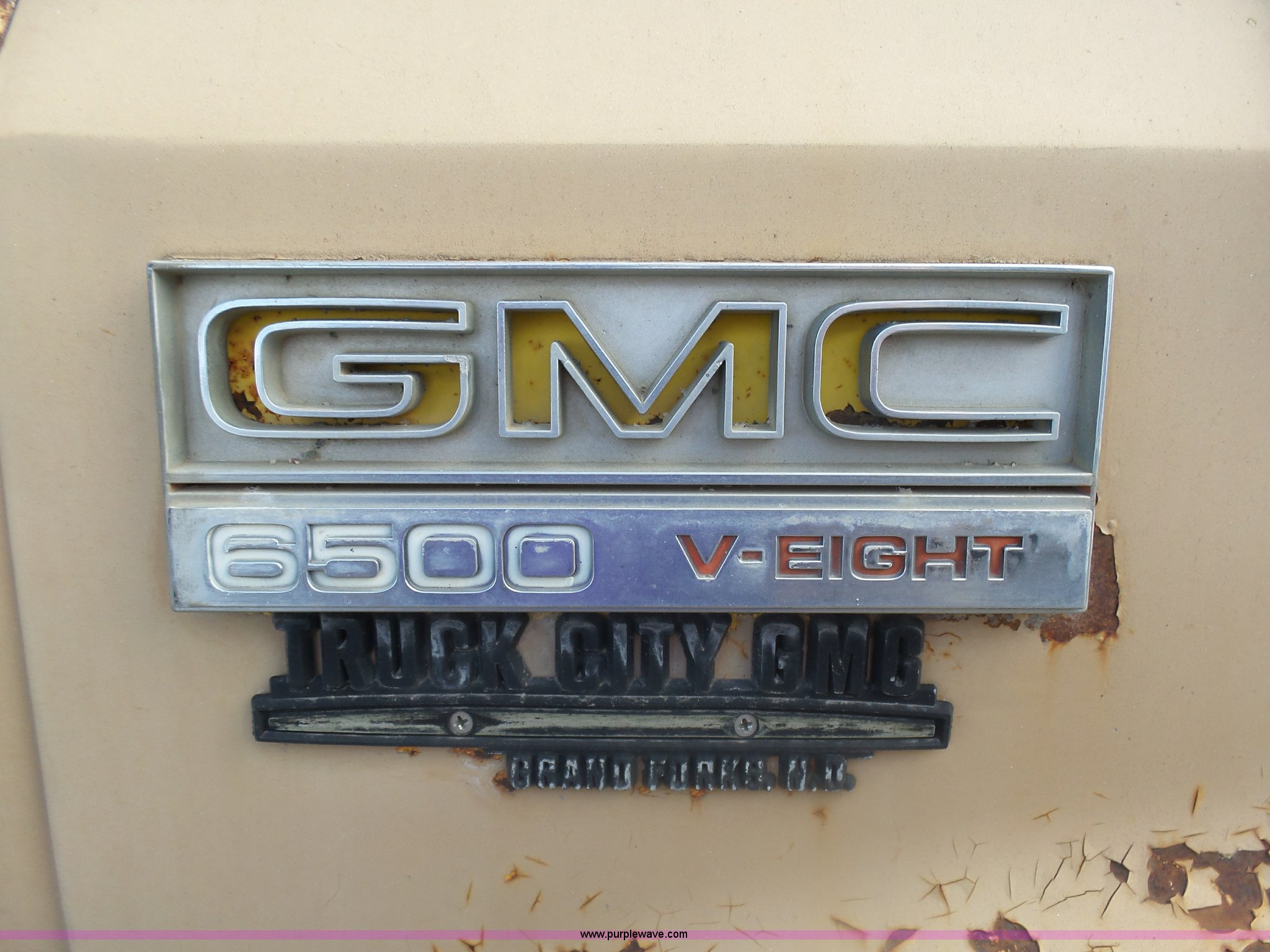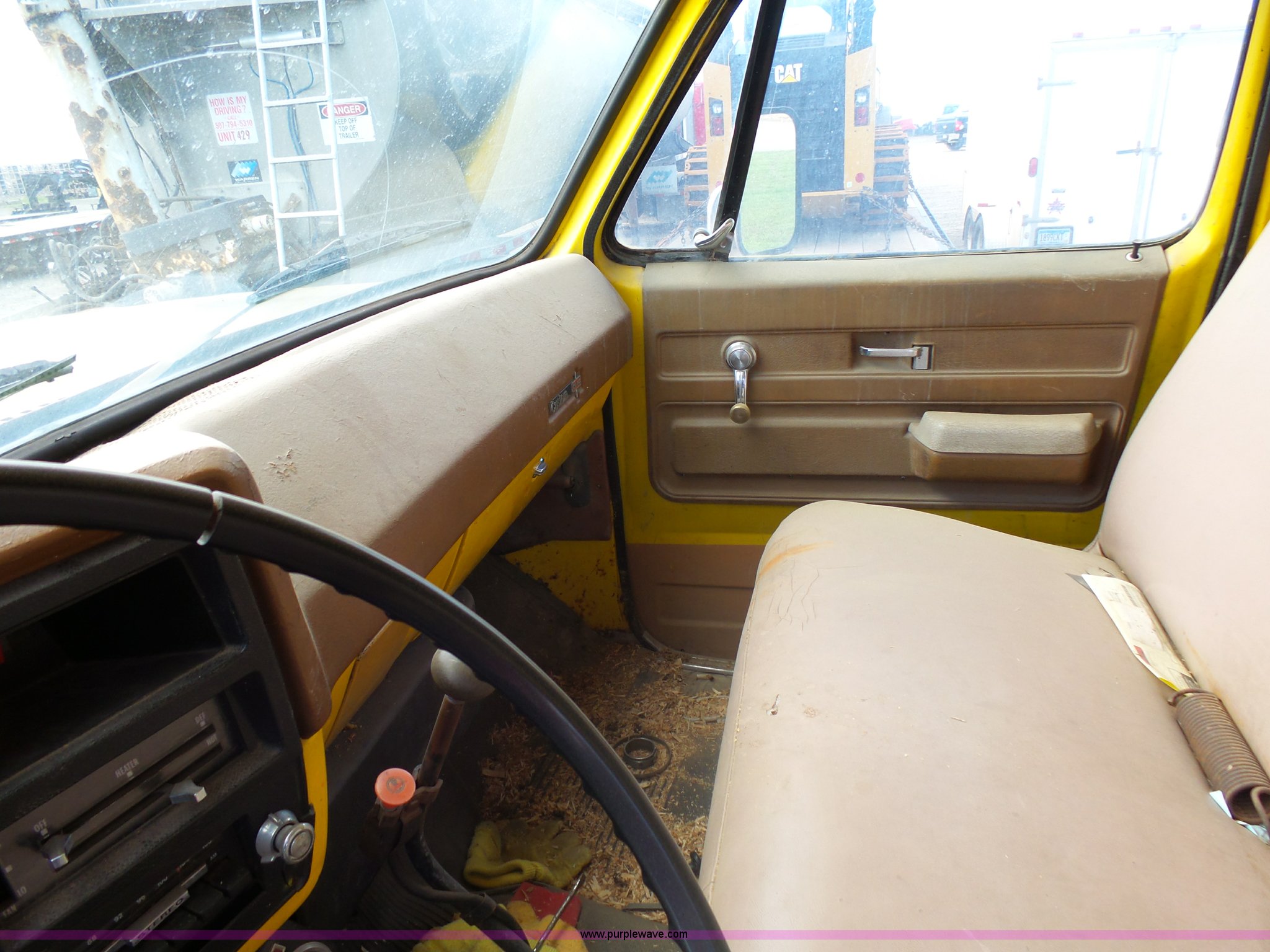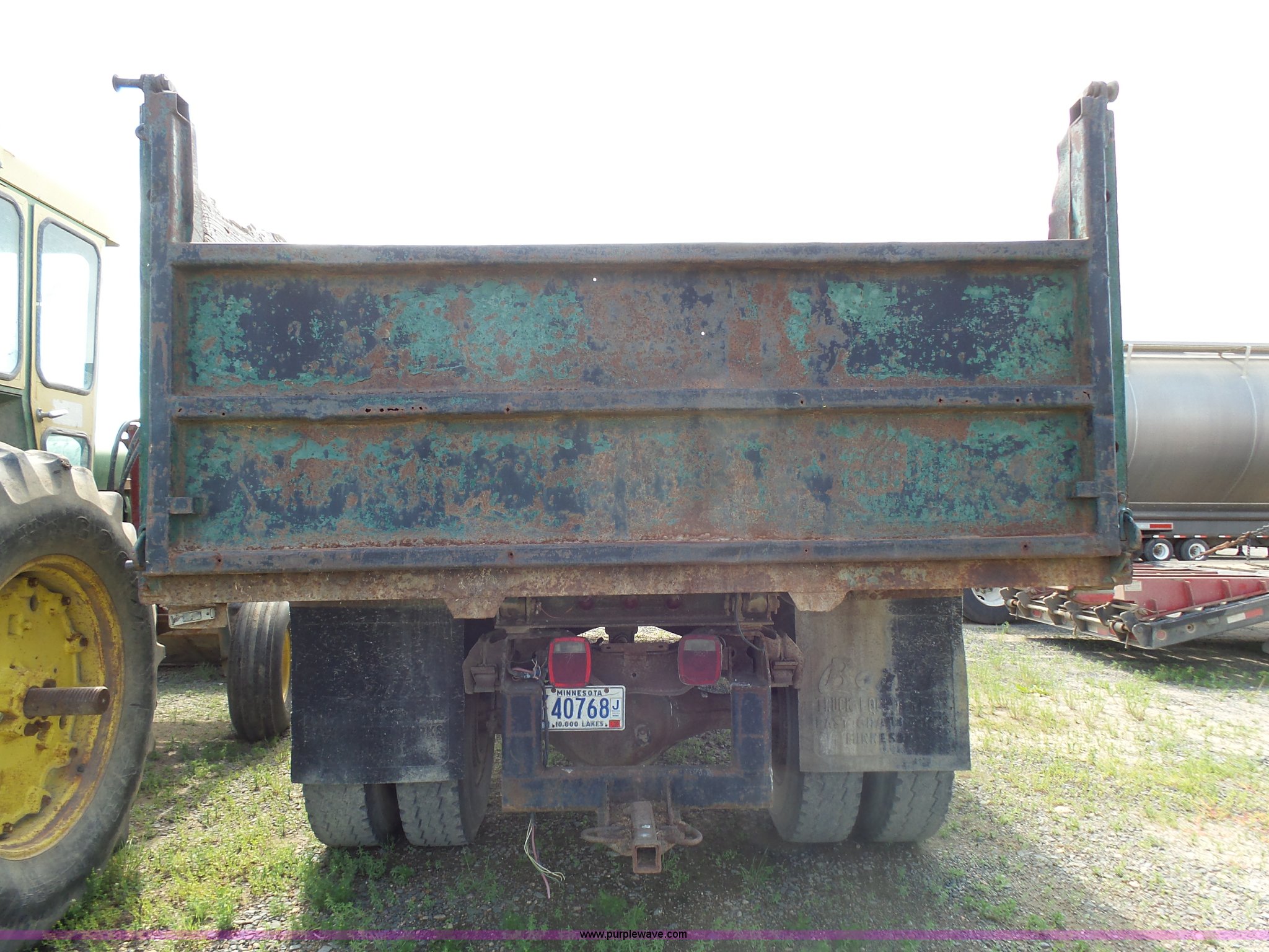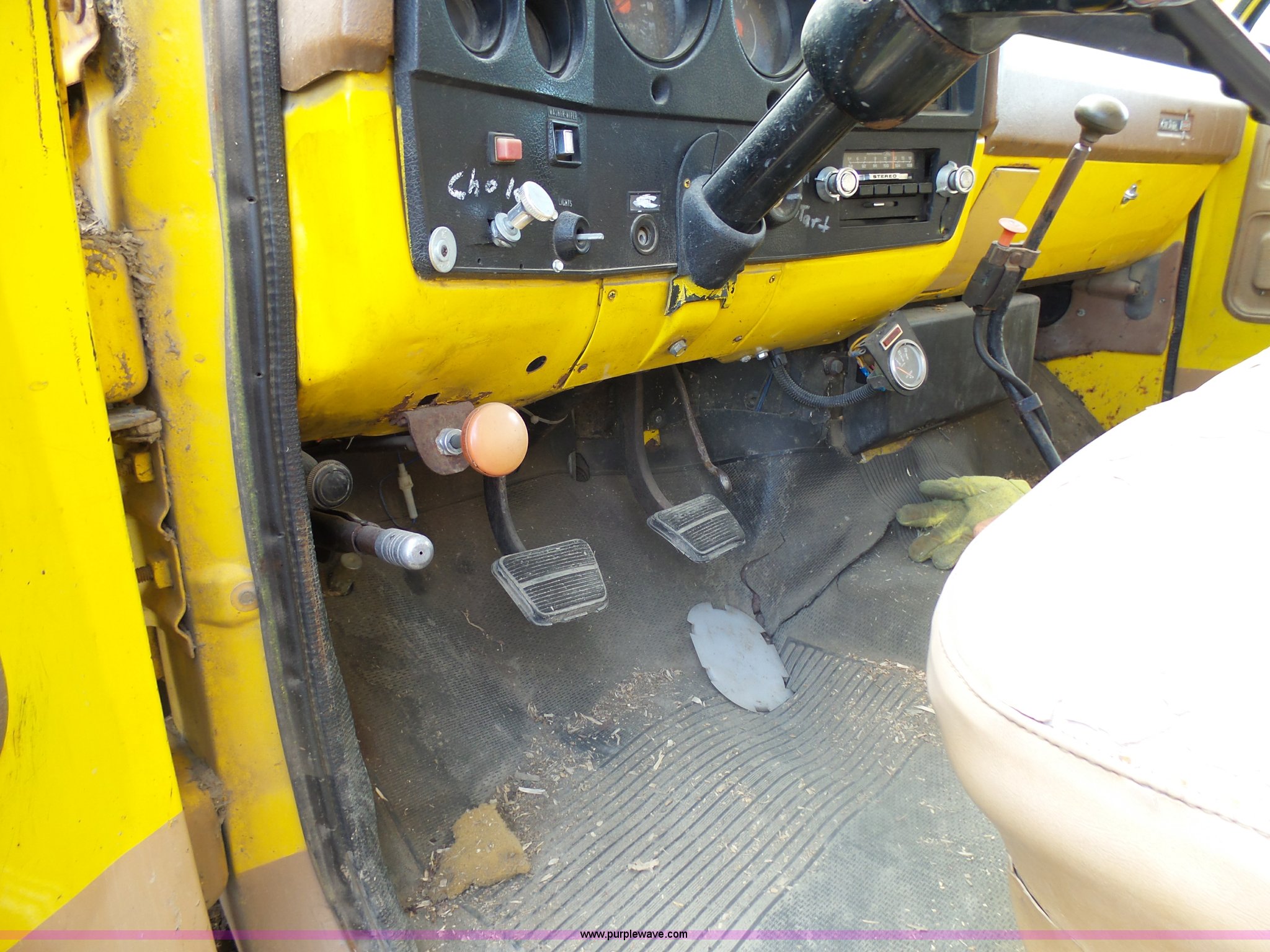 Purple Wave is selling a used Grain Truck in Minnesota. This item is a 1973 GMC 6500 grain truck with the following: 61,396 miles on odometer, V8 gas engine, Five speed manual transmission, Two speed rear end, Single axle, AC and heat, AM/FM, Suspension seat, 14'L x 4'W dump bed, 12" side board height, Manual end gate, Single ram hoist, Single fuel tank, Receiver hitch, Spring suspension, Hydraulic brakes, 11R22.5 tires, Seats torn, Cracked windshield