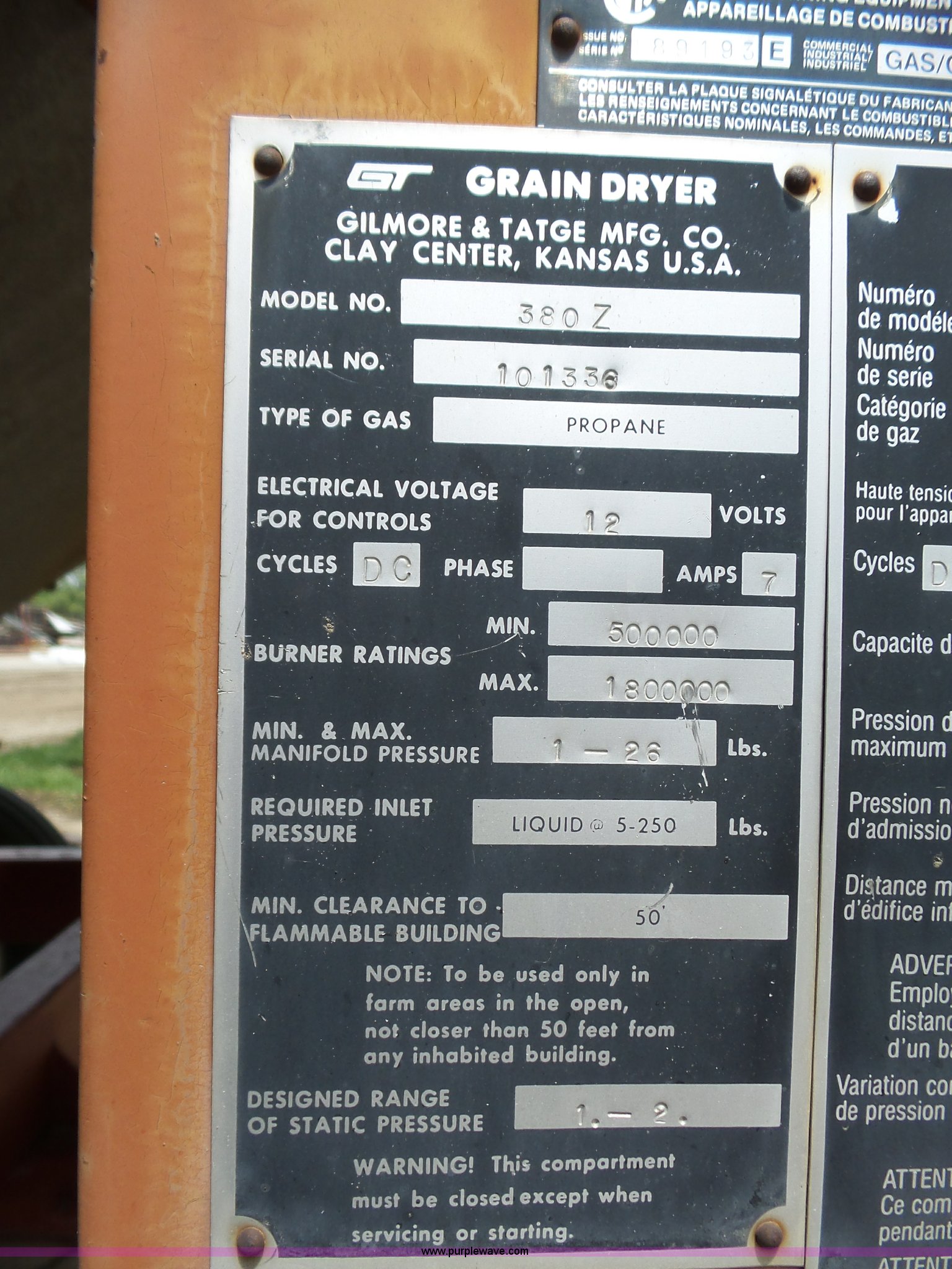 GT 3802 grain dryer. 180,000 BTU, Propane fired, Micro-Pro monitor, 540 PTO, Pin hitch, Serial 101338. 1331 Xylan Rd. Piqua, KS 66761