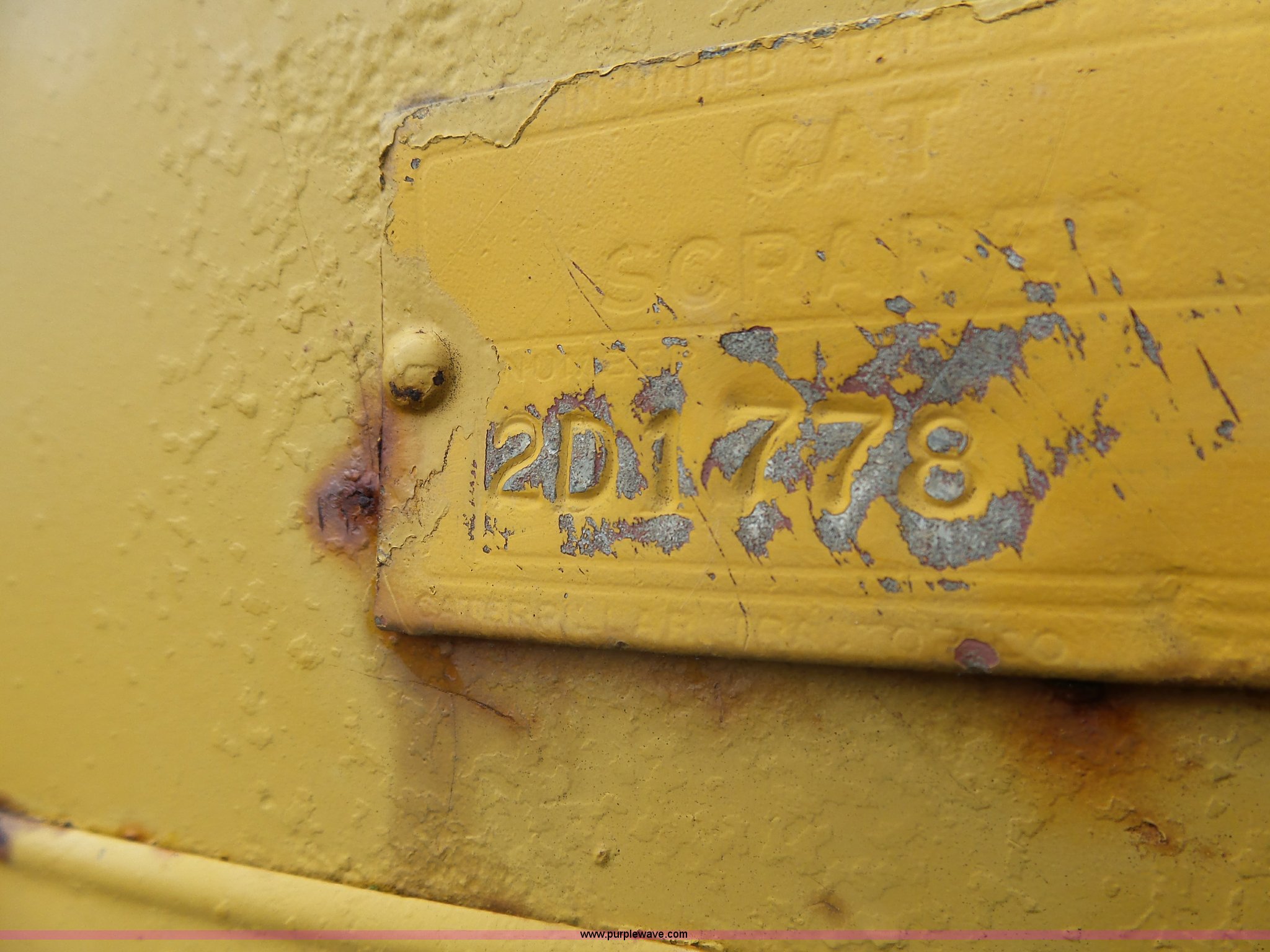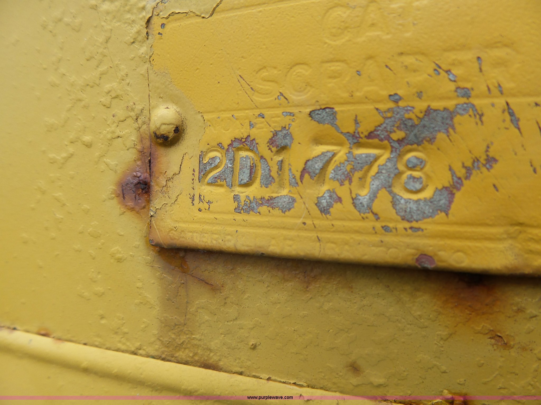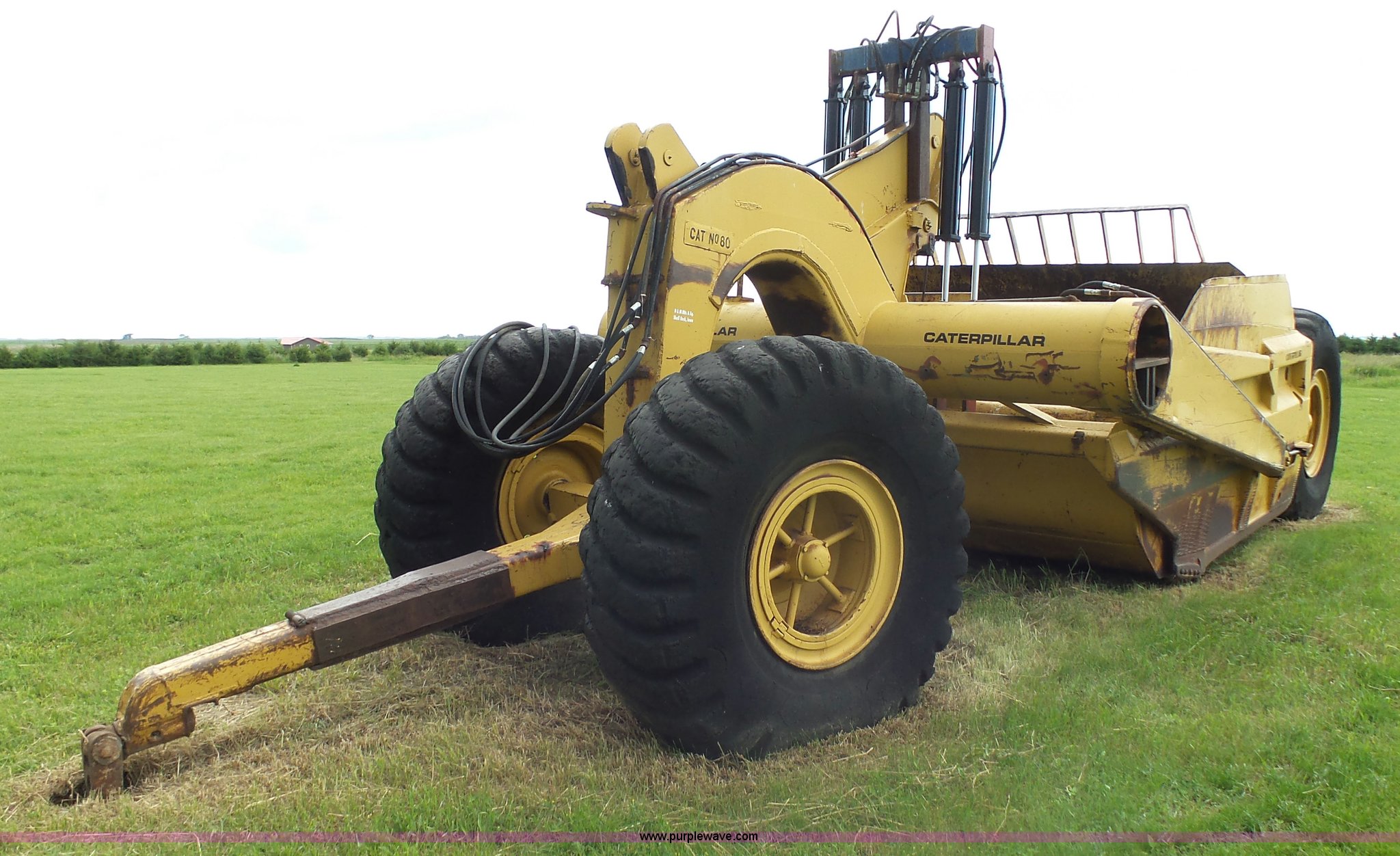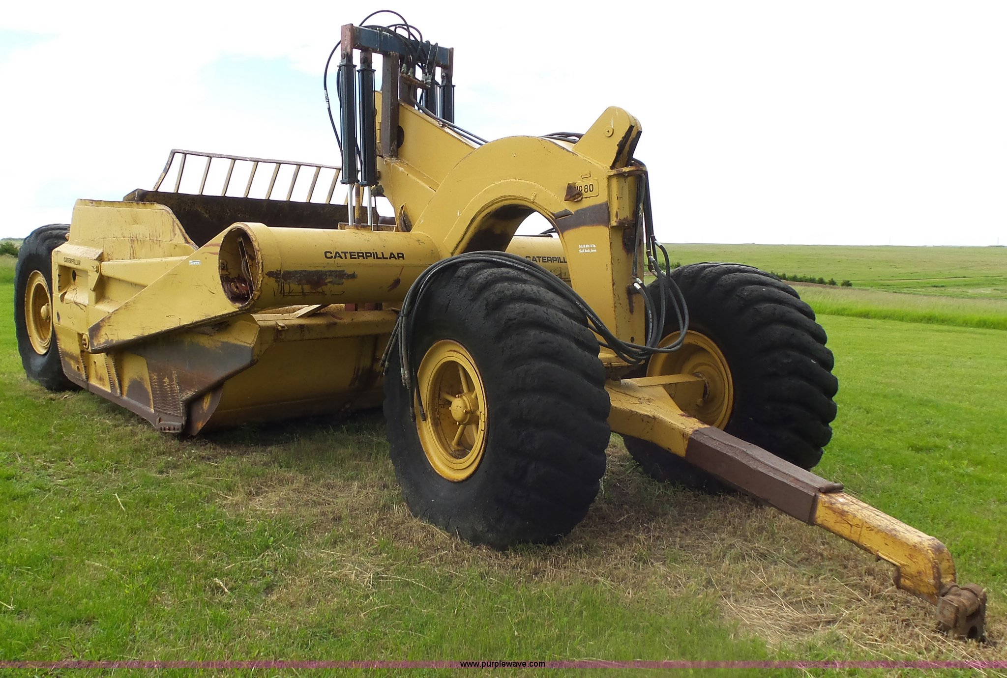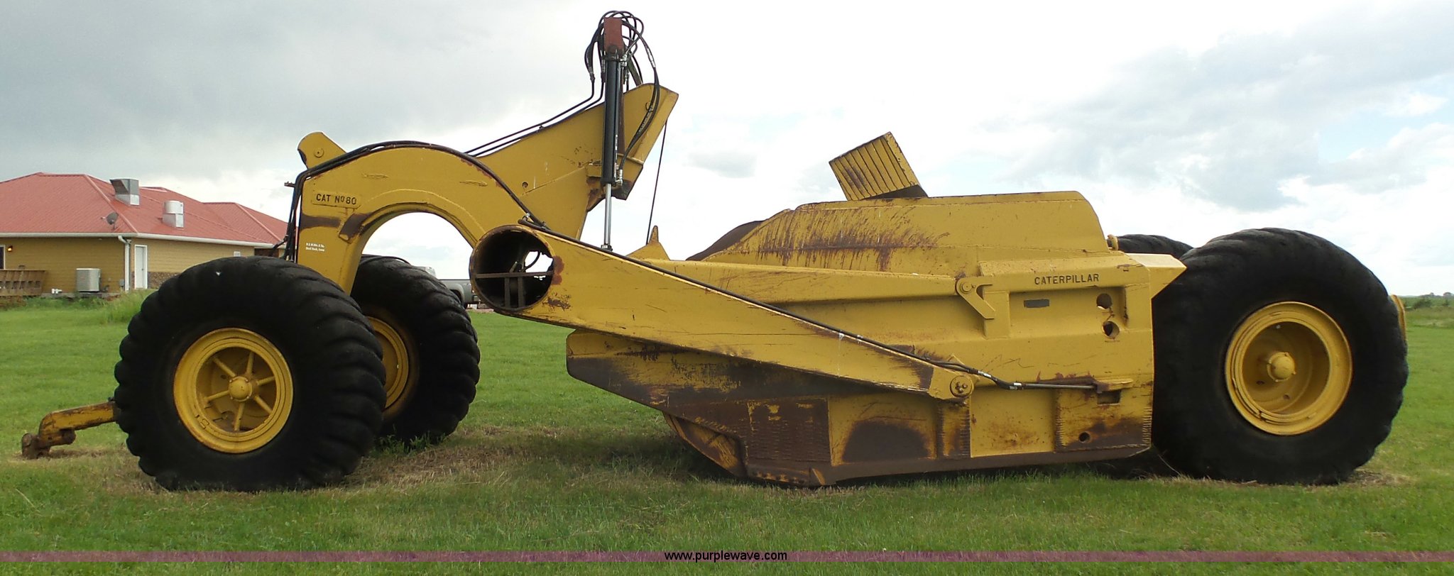 Purple Wave is selling a used Pull Type Scraper in South Dakota. This item is a Caterpillar 80 scraper with the following: 18 cu. yd. capacity, Reversible cutting edge, Hydraulic lift, Cable lift, Rear push block, Pin hitch, 21.00-25 tires, Serial 2D1778