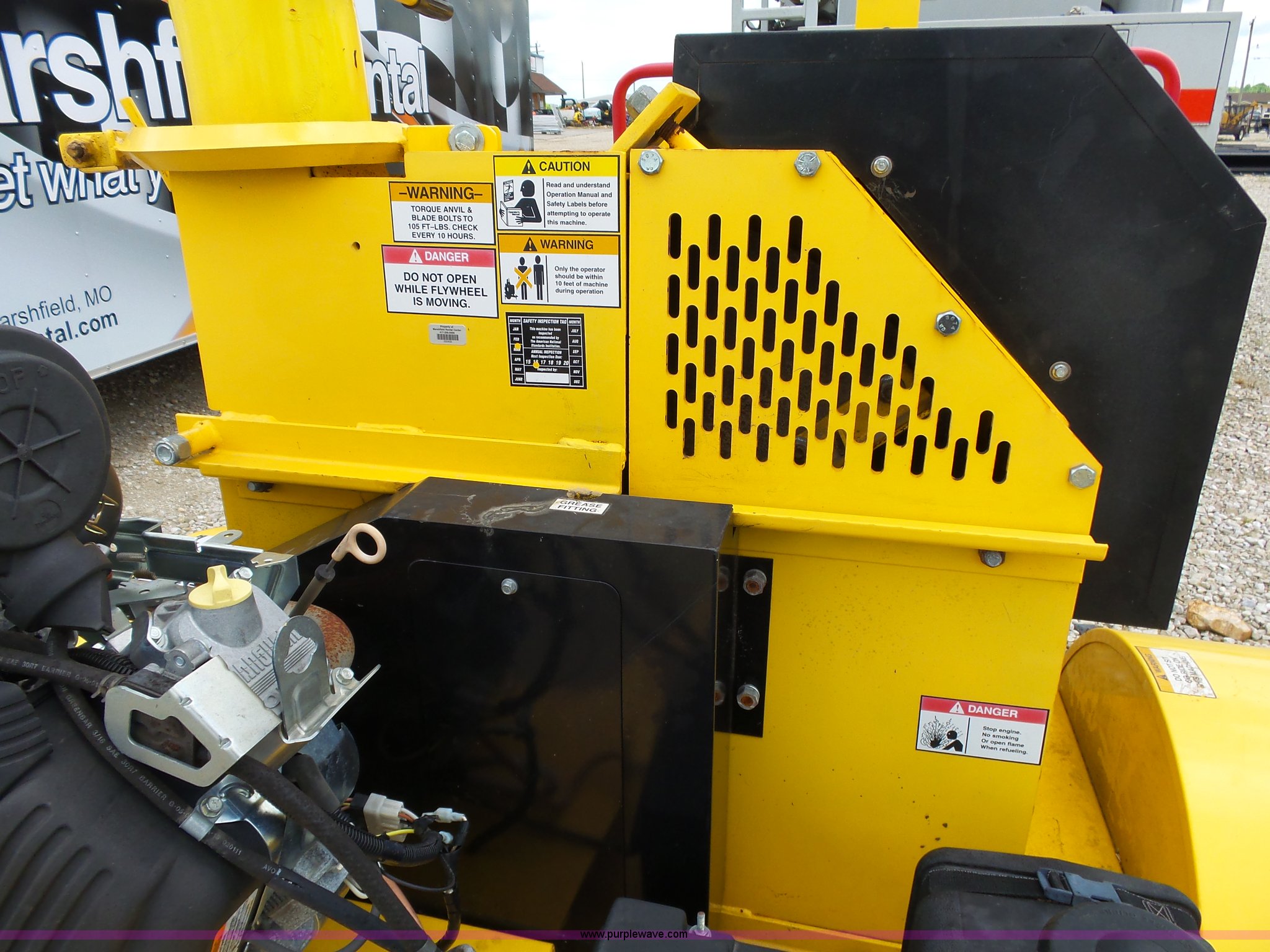 2011 Powertek 731 wood chipper. Briggs & Stratton Vanguard two cylinder gas engine 31 HP, 34"W x 24"H feeder opening, 7" capacity, Manual adjustable discharge chute, Emergency stop, Manual jack stand, 205/75D14 tires, Serial 62969. Transfer of ownership documentation will be a bill of sale. Marshfield Rental Center. 351 McNabb Road. Marshfield, MO 65706