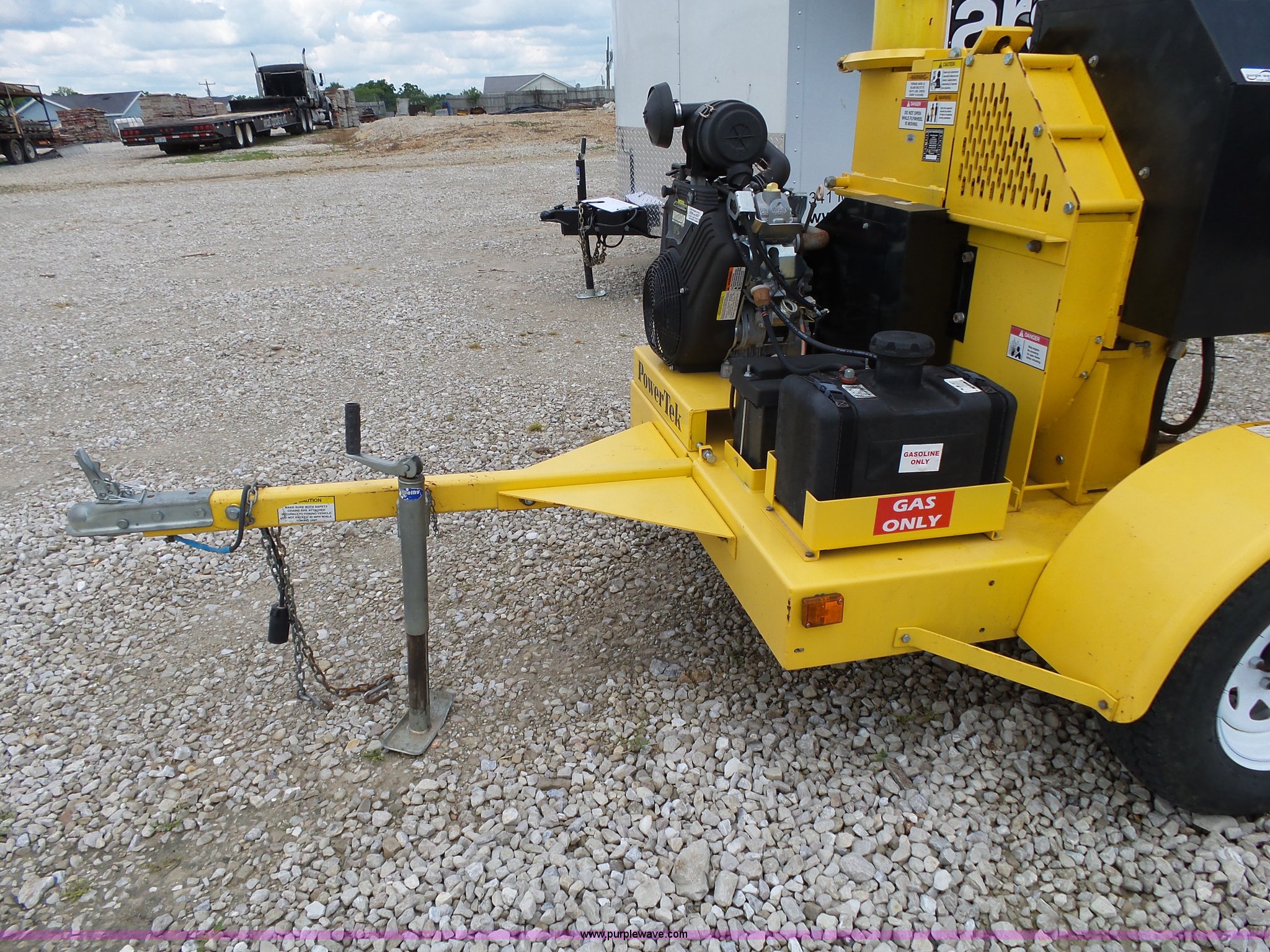 Purple Wave is selling a used Wood Chipper or Stump Grinder in Missouri. This item is a 2011 Powertek 731 wood chipper with the following: Briggs & Stratton Vanguard two cylinder gas engine, 31 HP, 34"W x 24"H feeder opening, 7" capacity, Manual adjustable discharge chute, Emergency stop, Manual jack stand, 205/75D14 tires, Serial 62969