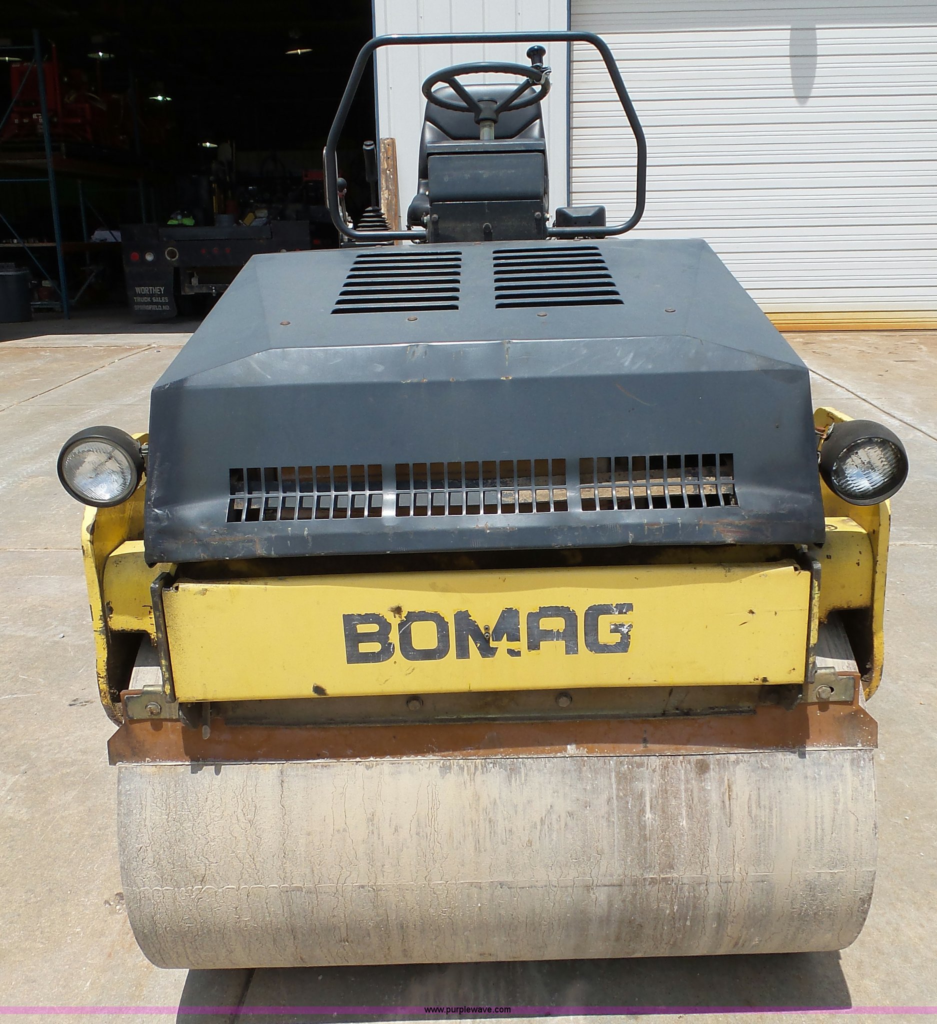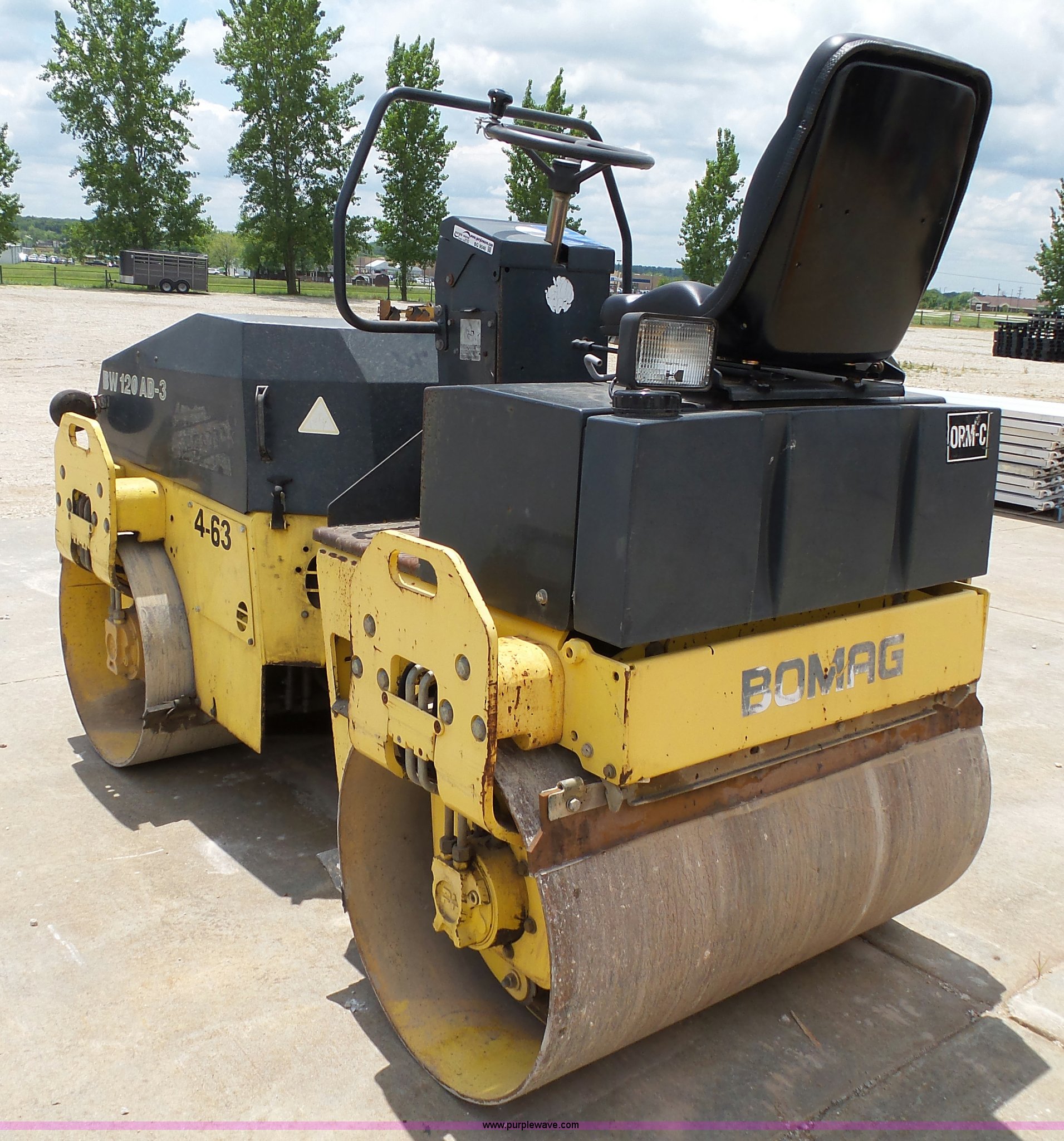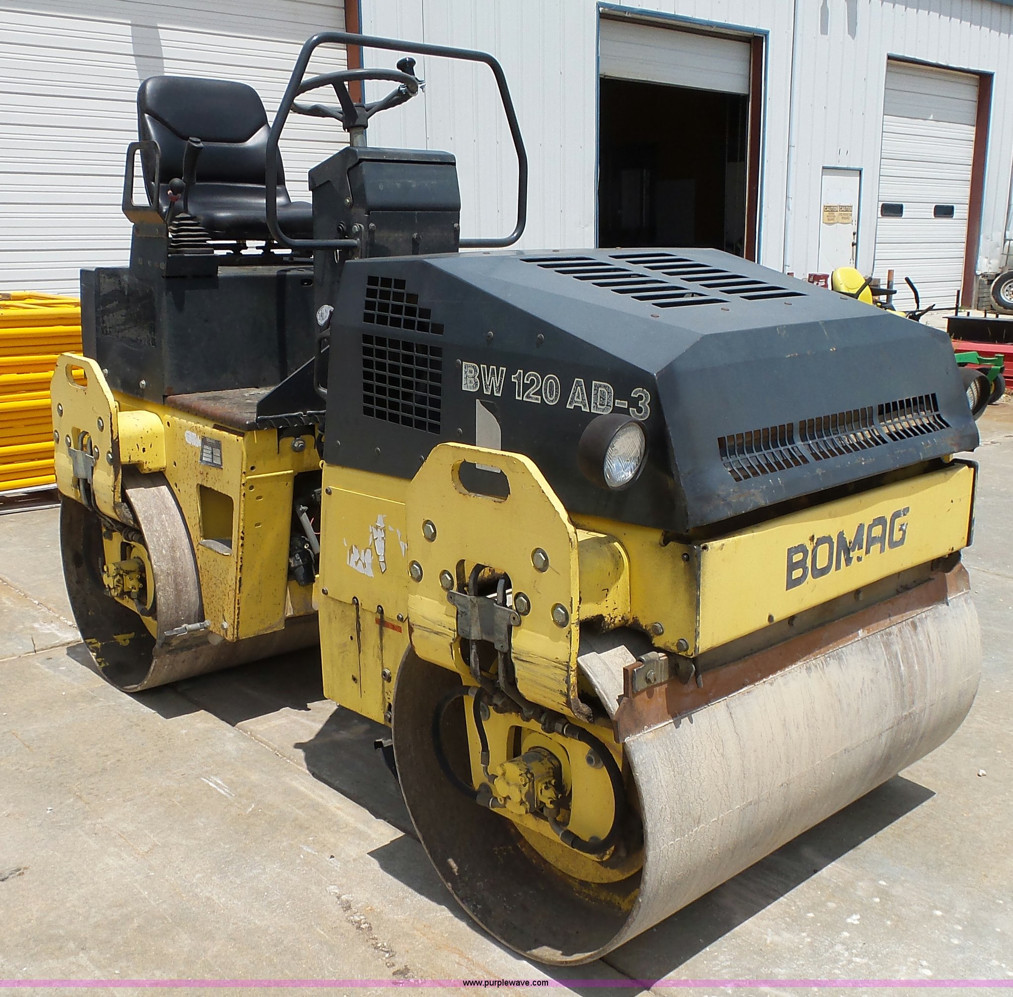 Purple Wave is selling a used Double Drum Roller Compactor in Missouri. This item is a 2000 Bomag BW120AD-3 double drum roller with the following: 5,035 hours on meter, Deutz F2L1011F two cylinder diesel engine, 21 kW, Hydrostatic transmission, Vandal guard, Front and rear work lights, 47"W x 27" diameter smooth drums, Single vibratory system, Front and rear drum scrapers, Emergency stop button, Serial 101170515719, Unit# 4-63
