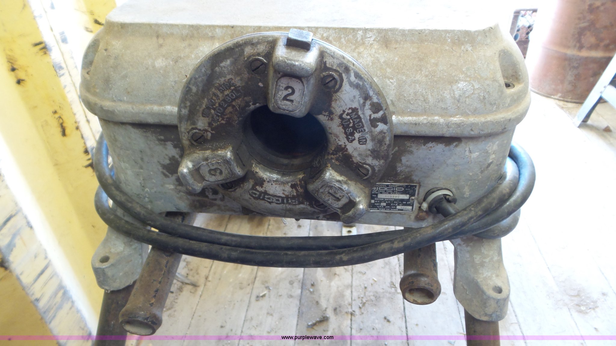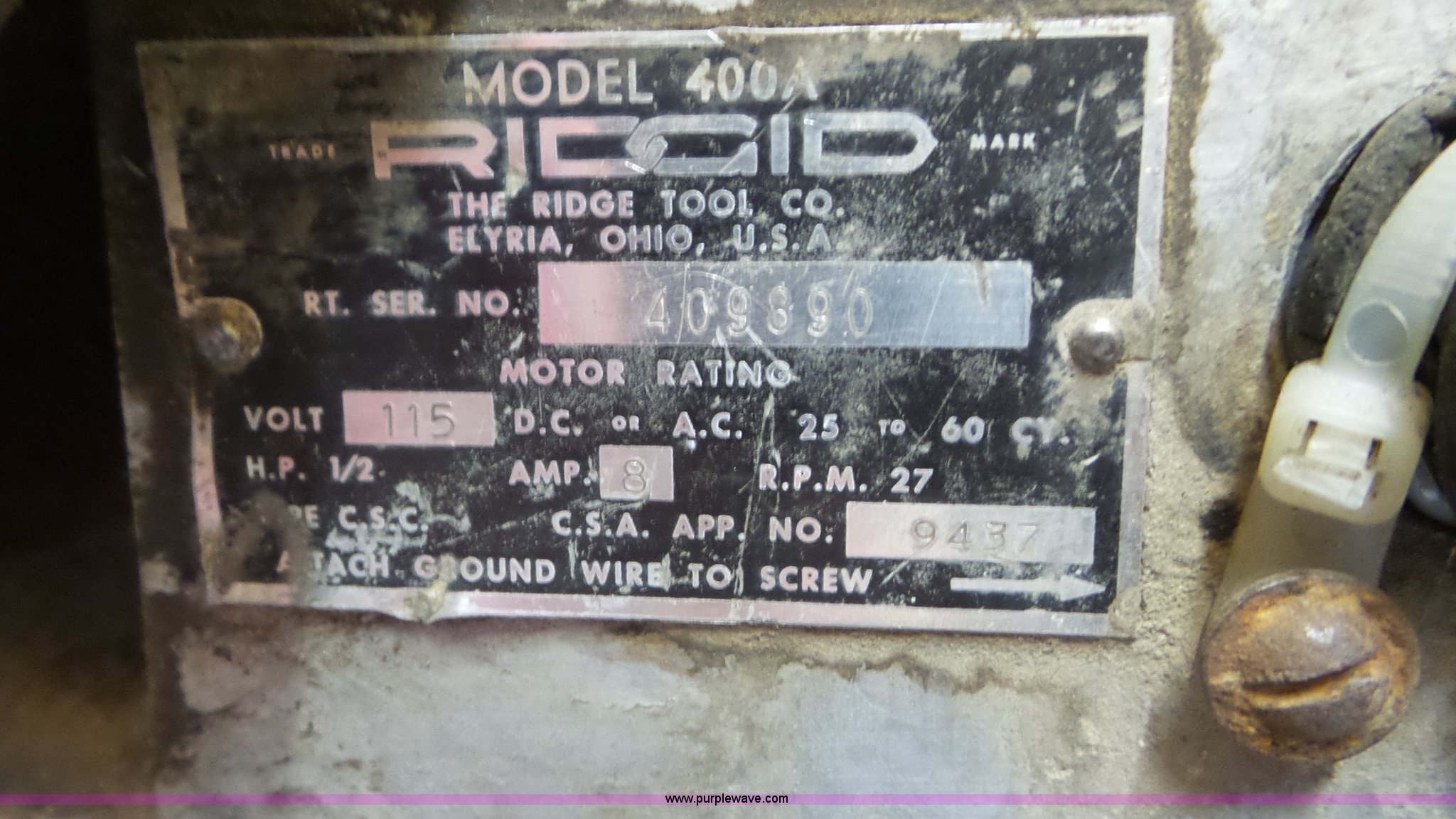 Purple Wave is selling a used Tools in Kansas. This item is a Ridgid 400A pipe threader with the following: Electric motor, 1/2 HP, 8 amp, 1/8" to 2" pipe capacity, 1/4" to 2" bolt capacity, Stand, Serial 40989