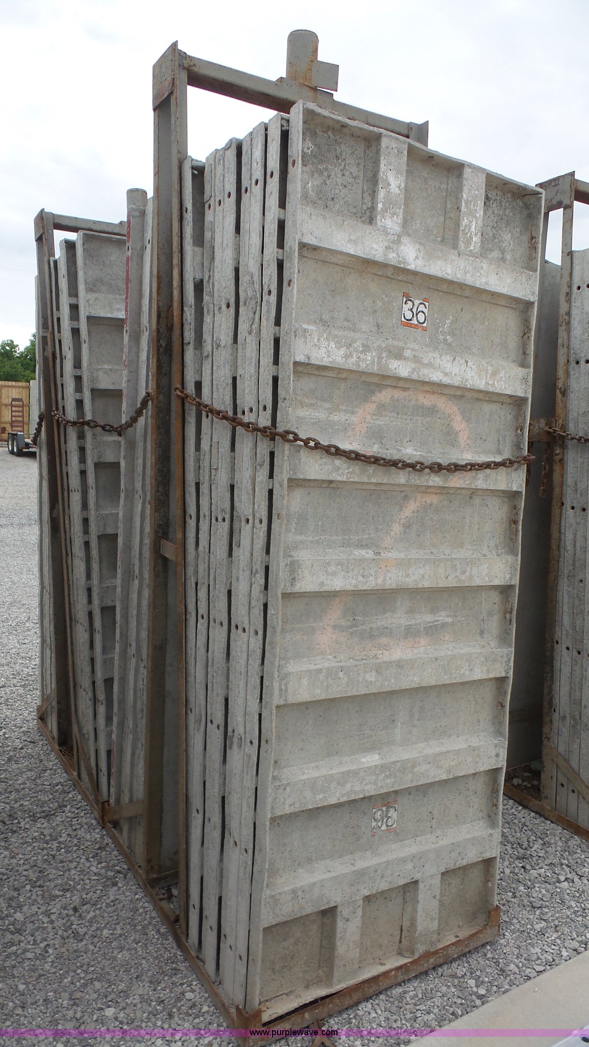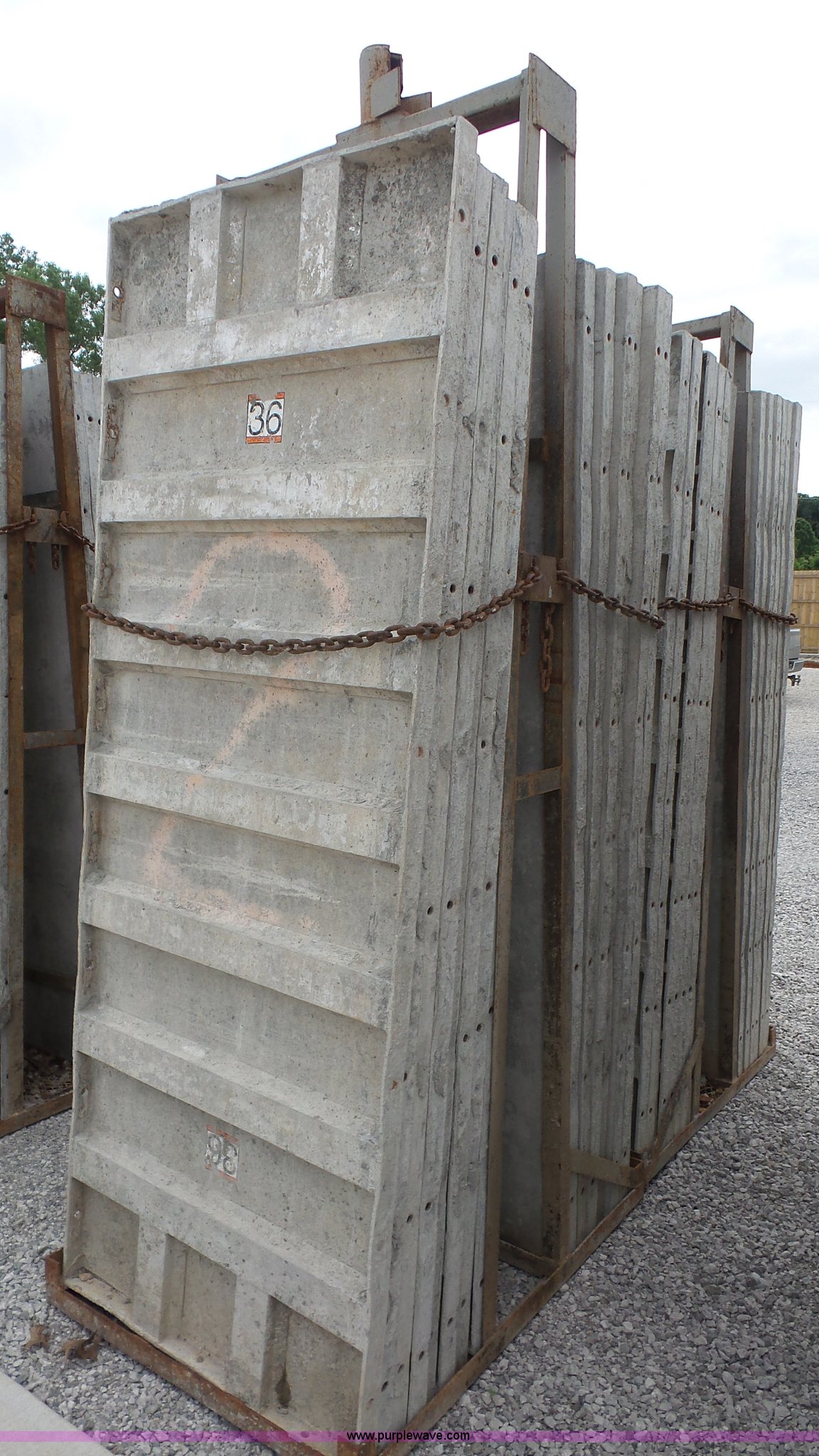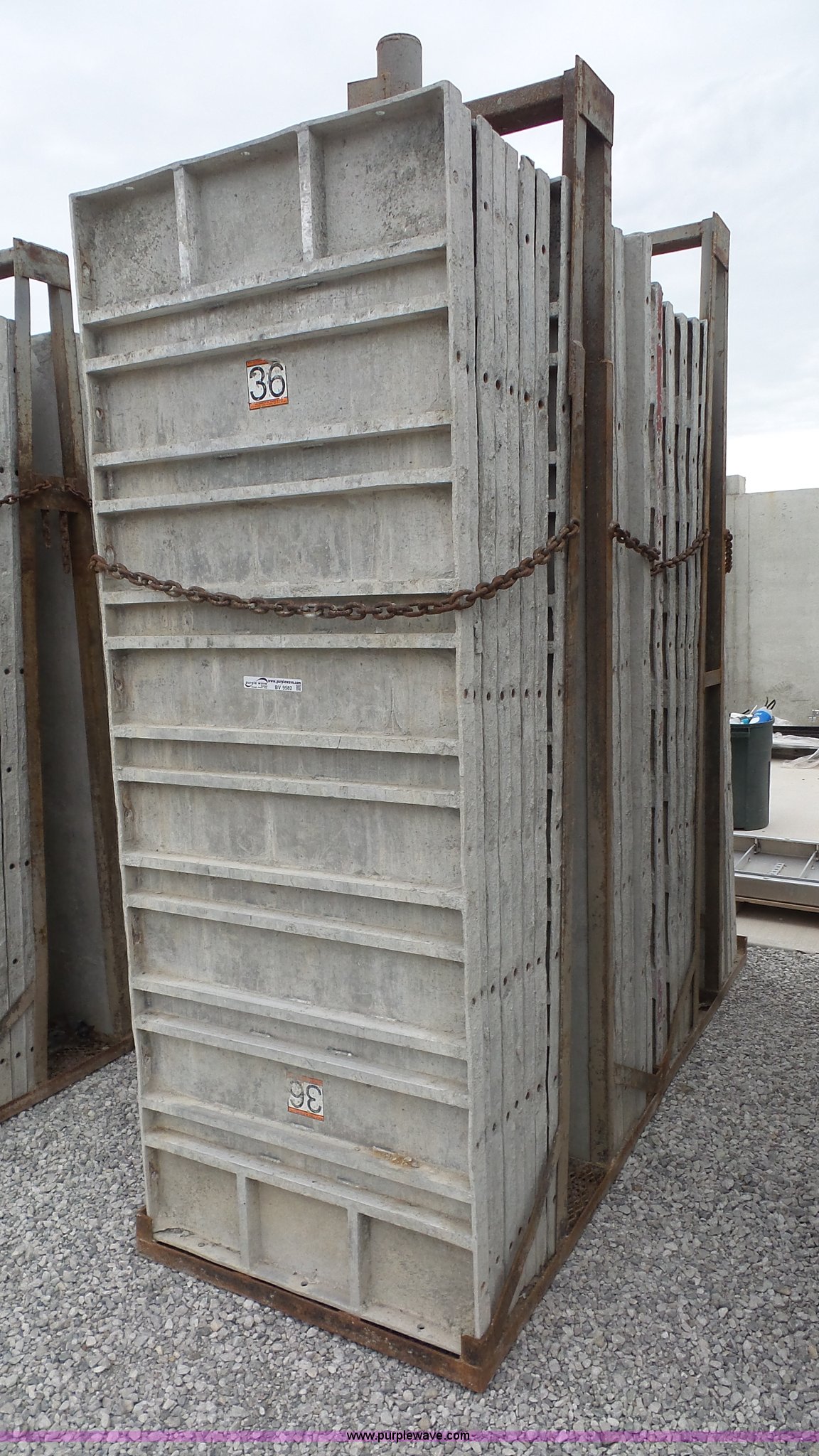 Purple Wave is selling a used Concrete Equip. or Acces. in Kansas. This item is a Aluminum concrete forms with the following: (32) 36"W x 96"H, 6/12 hole pattern, (2) form baskets with bell tops