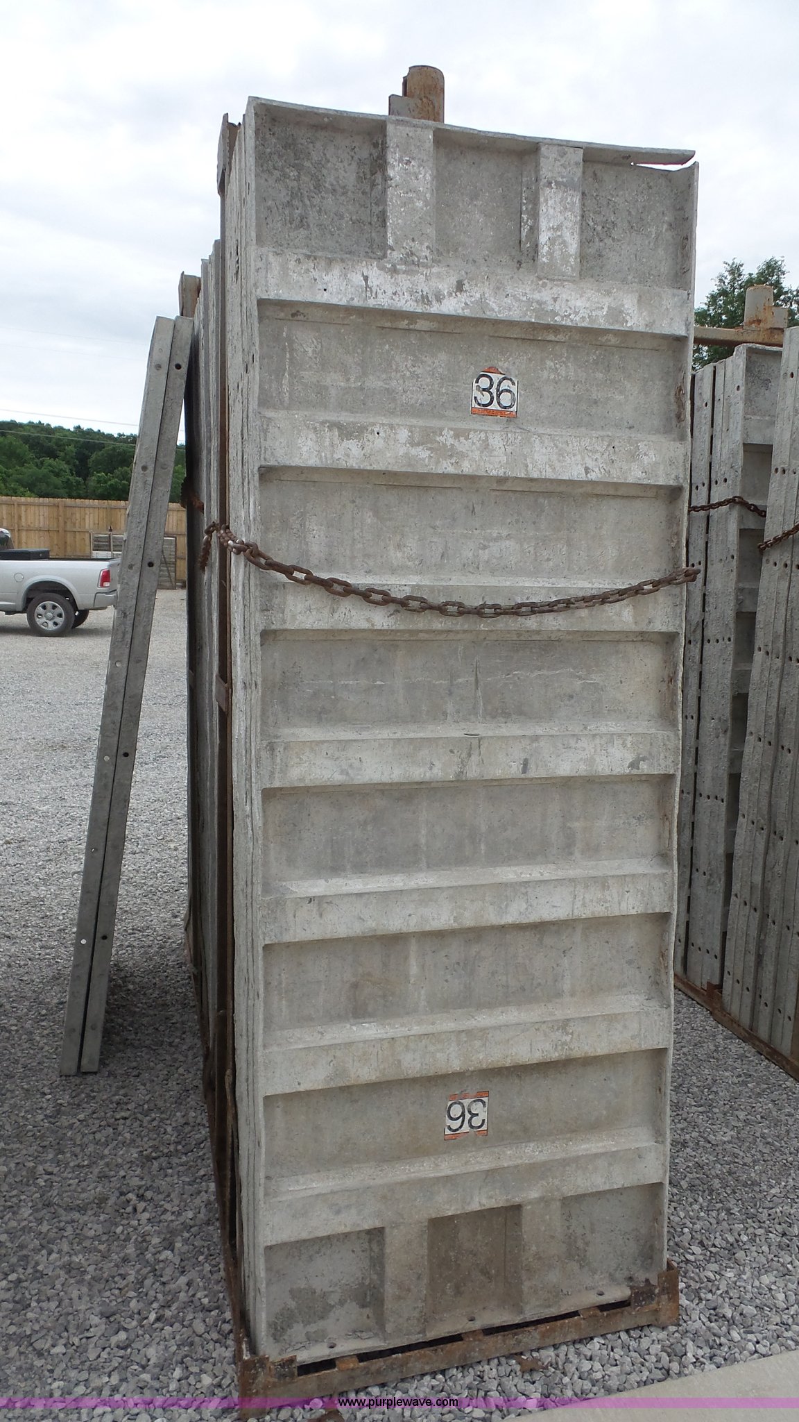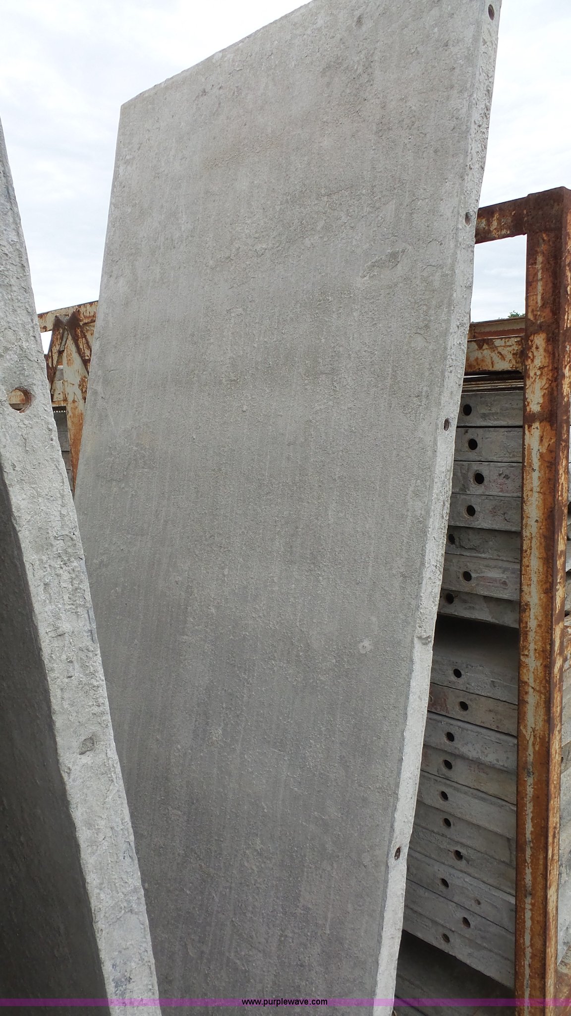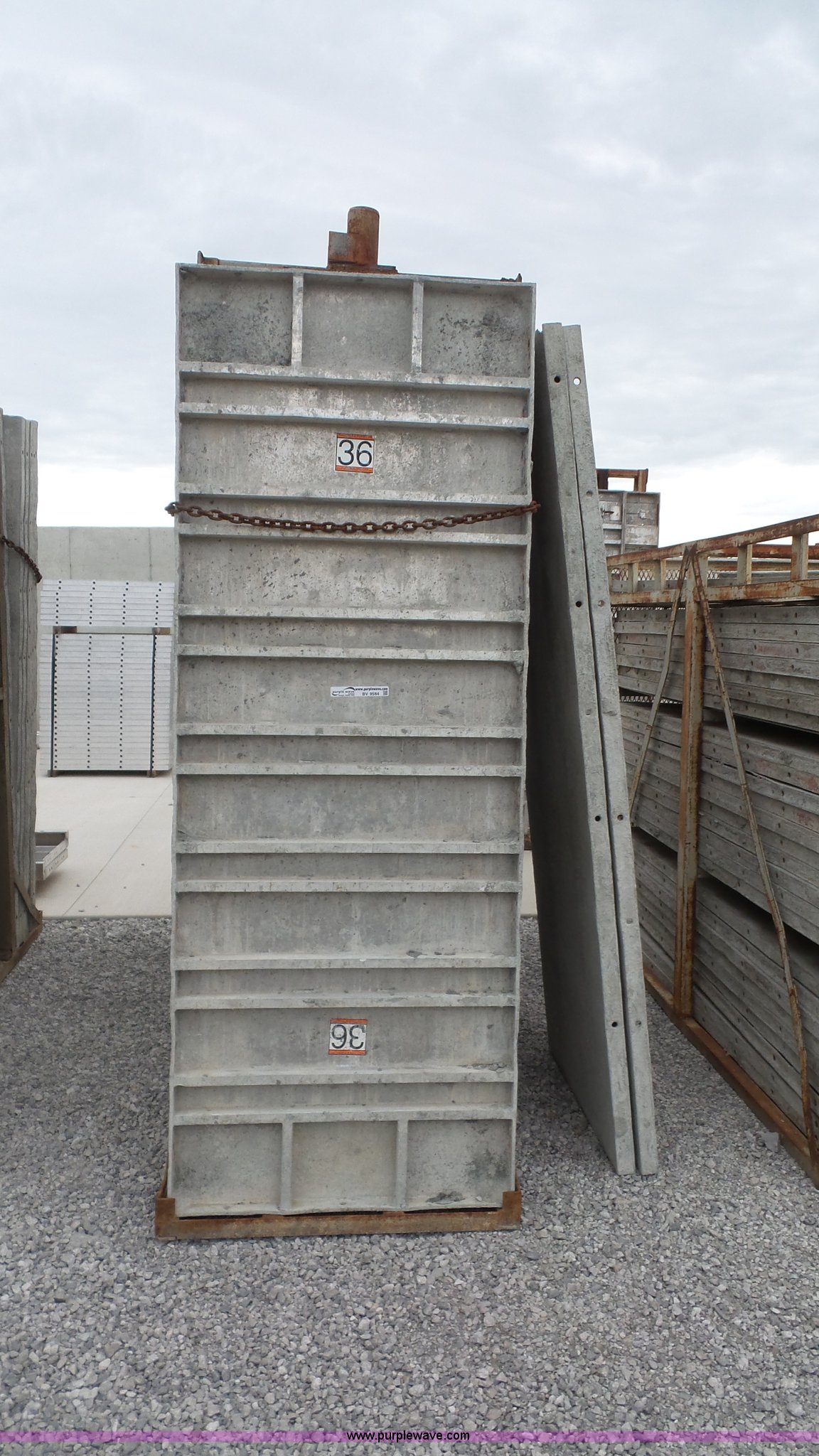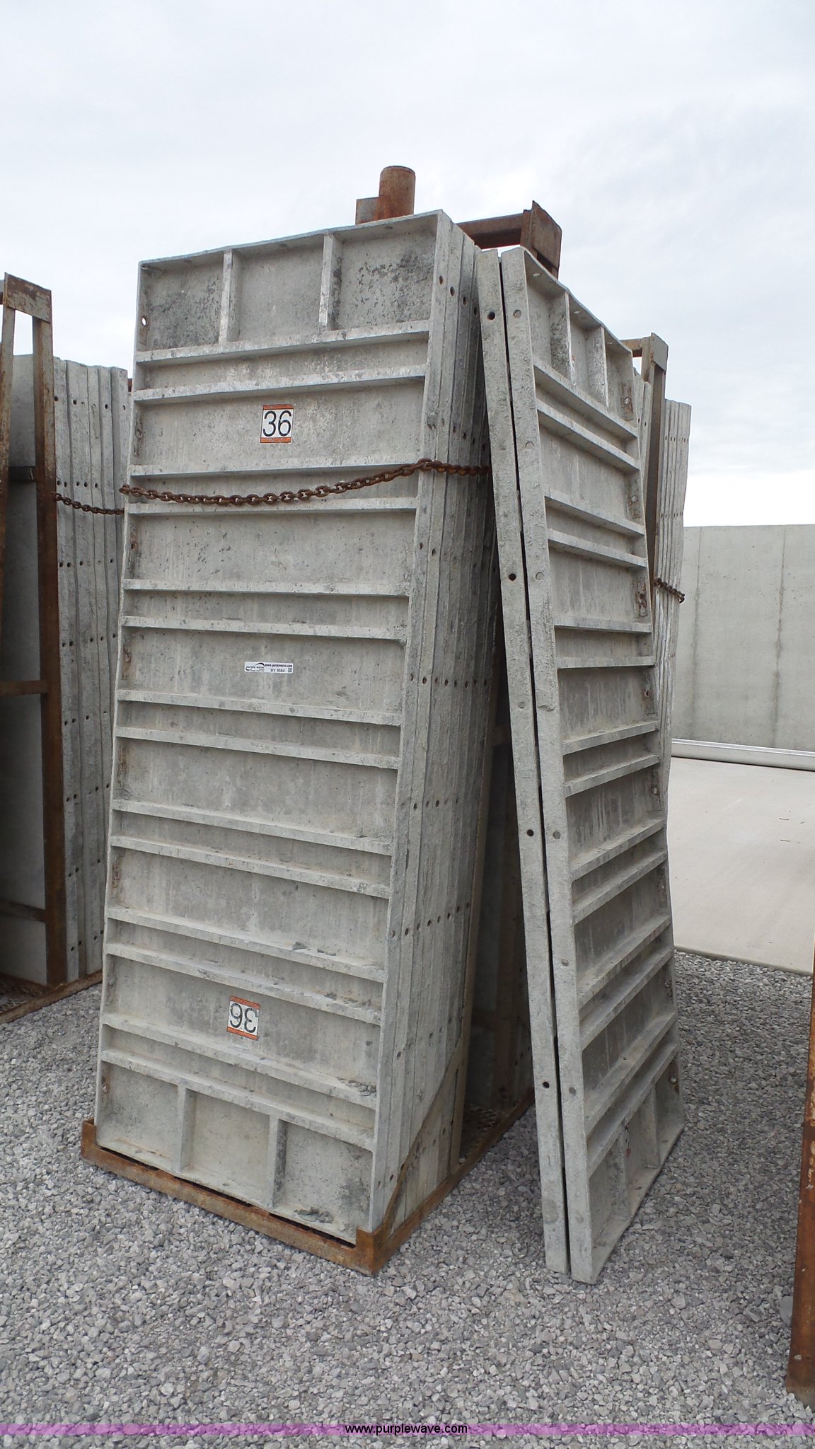 Purple Wave is selling a used Concrete Equip. or Acces. in Kansas. This item is a Aluminum concrete forms with the following: (34) 36"W x 96"H, 6/12 hole pattern, (2) form baskets with bell tops